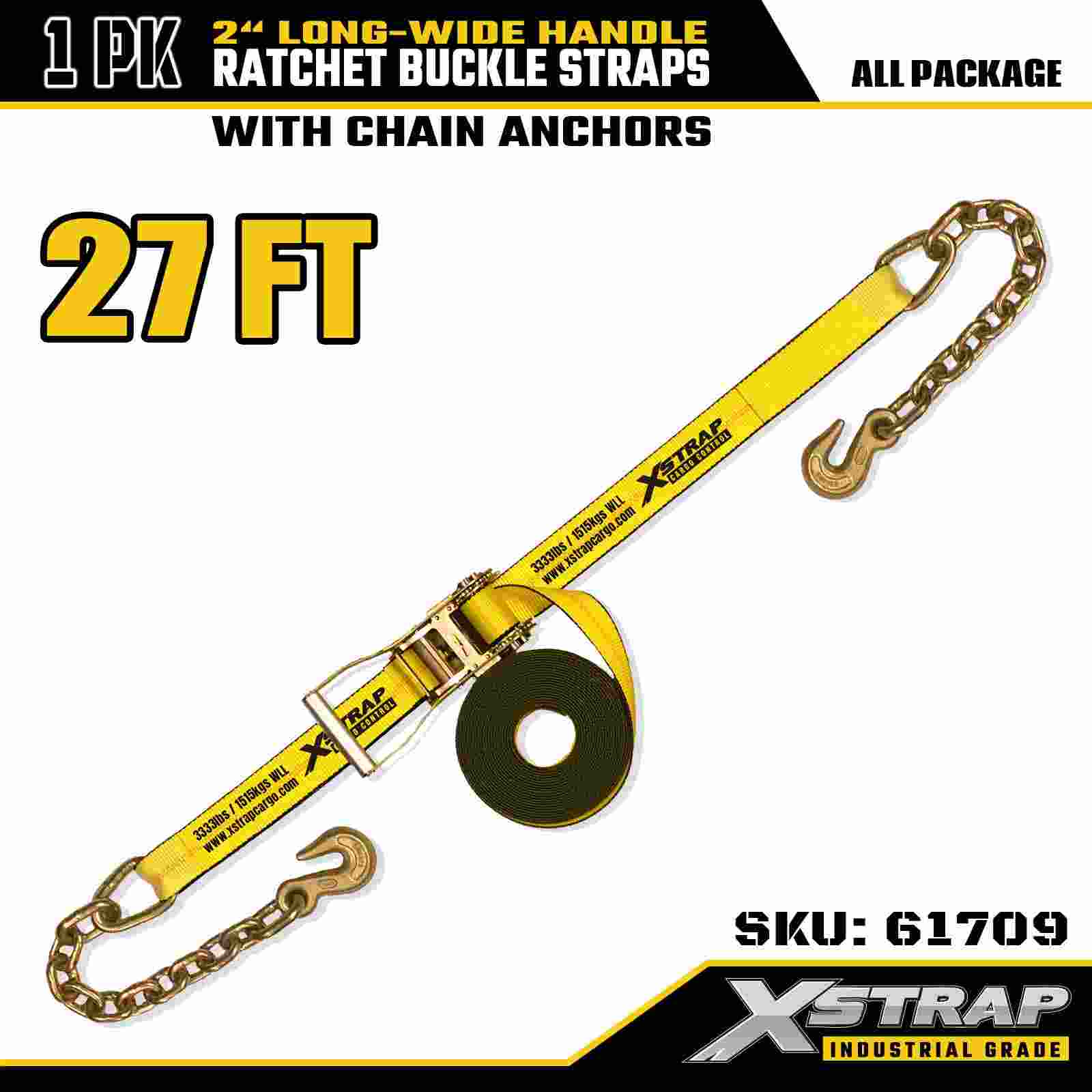 엑스스트랩 61709 긴 와이드 핸들 래칫 버클 스트랩 2" x 27피트(1팩) 와 체인 후크, 10,000lbs 파손 강도, 안전한 운송을 위한 고강도 타이다운 스트랩
