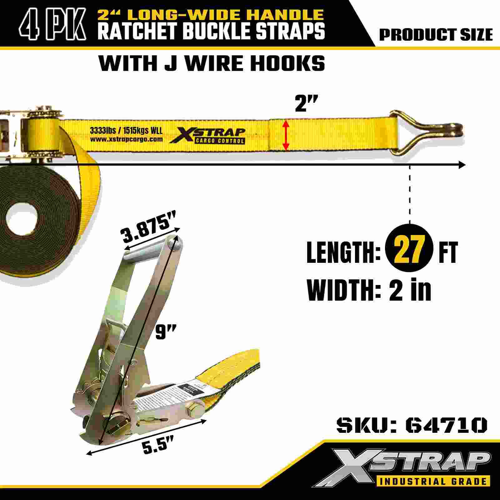엑스스트랩 64710 화물 제어 래칫 스트랩 2" x 27피트(4팩) – 와이어 후크, 정격 용량 10,000lbs, 장비 운송을 위한 내구성 있는 고정 장치
