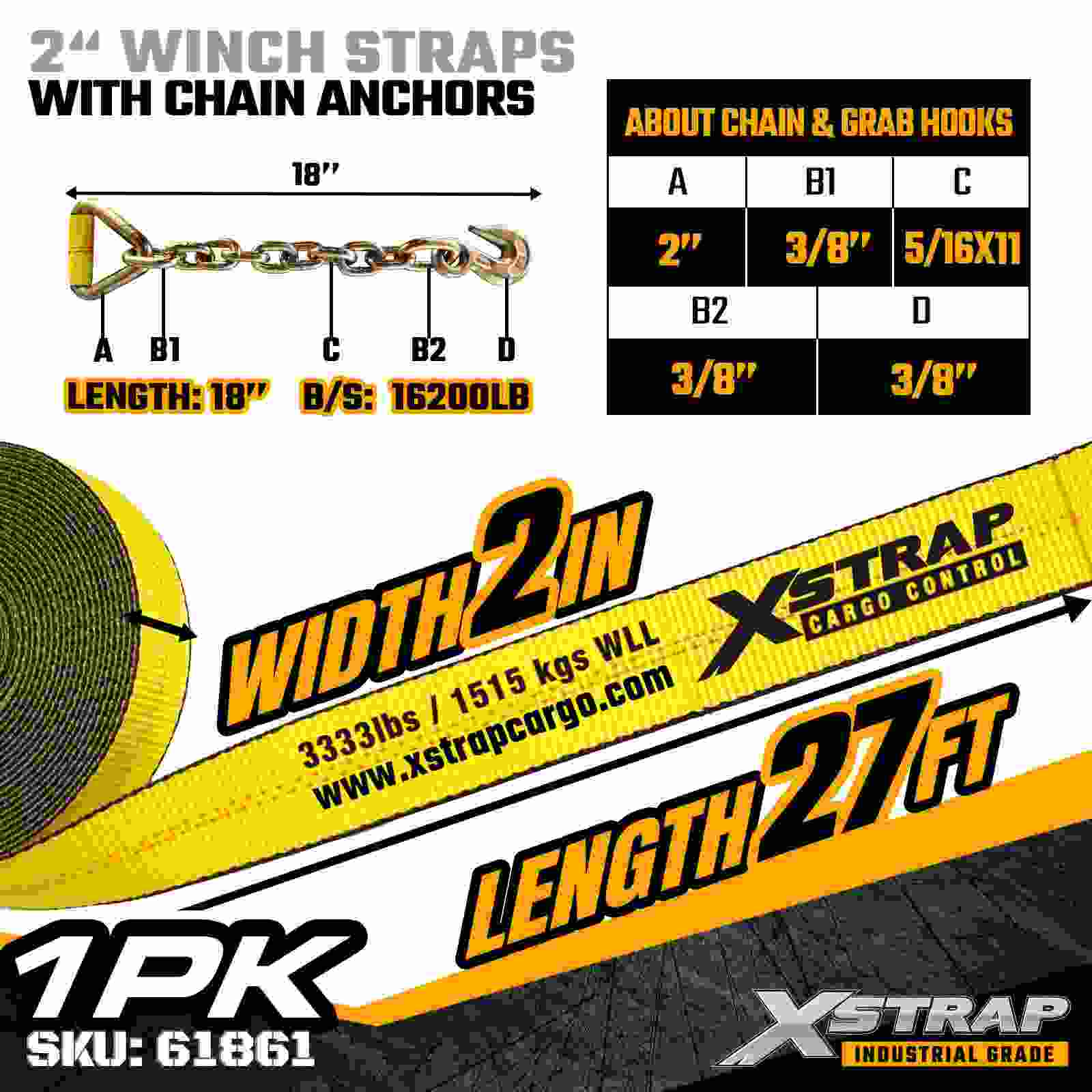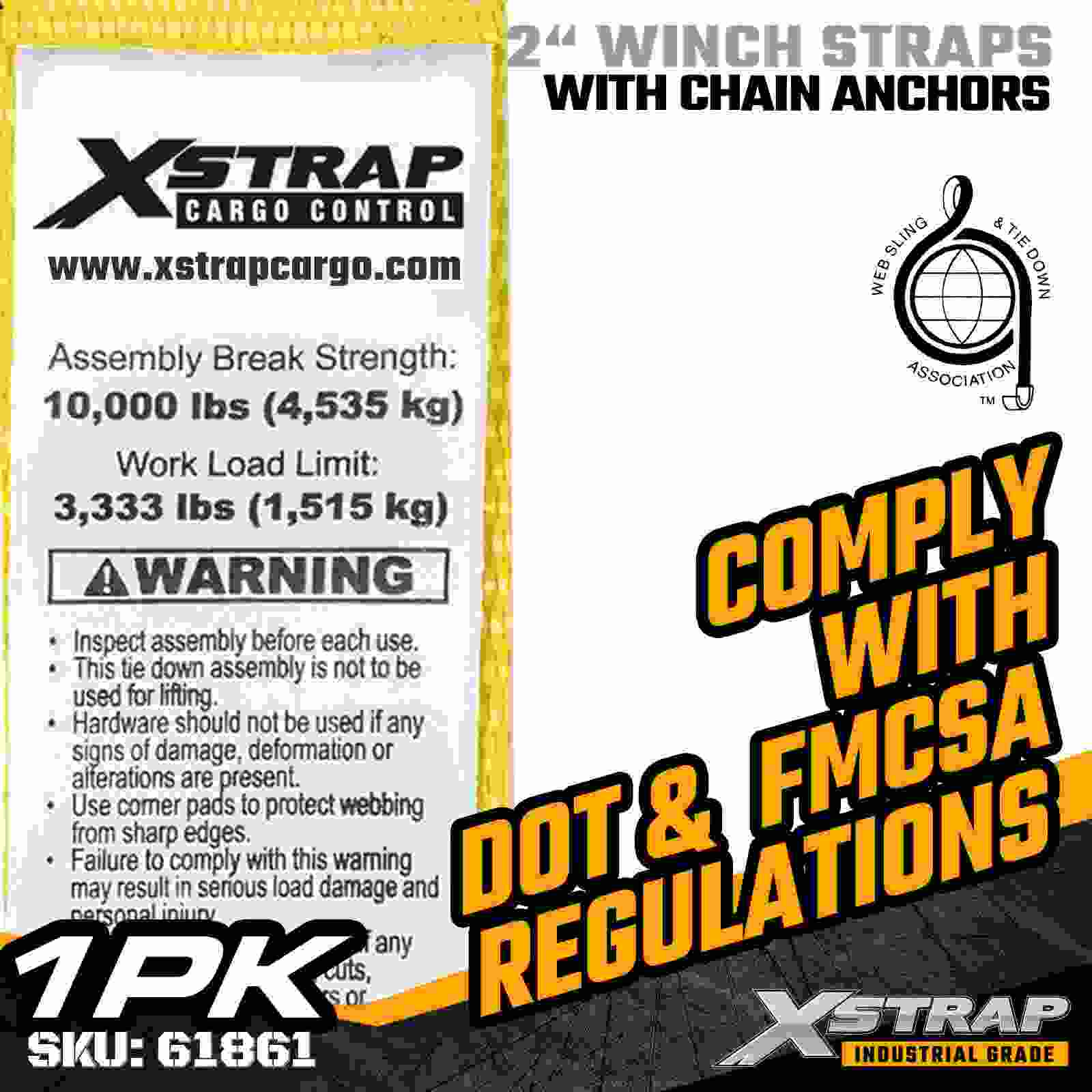 Xstrap 61861 2" × 27피트 표준 윈치 스트랩은 안정적인 플랫베드 화물 고정을 위해 제작되었으며 내구성이 뛰어난 체인 앵커와 고강도 폴리에스터 웨빙이 특징입니다. 3,333lbs의 작업 하중 제한과 10,000lbs의 파손 강도를 통해 일일 화물 운반, 팔레트 적재, 목재, 파이프 및 일반 물류 응용 분야에 신뢰할 수 있는 성능을 제공합니다.
