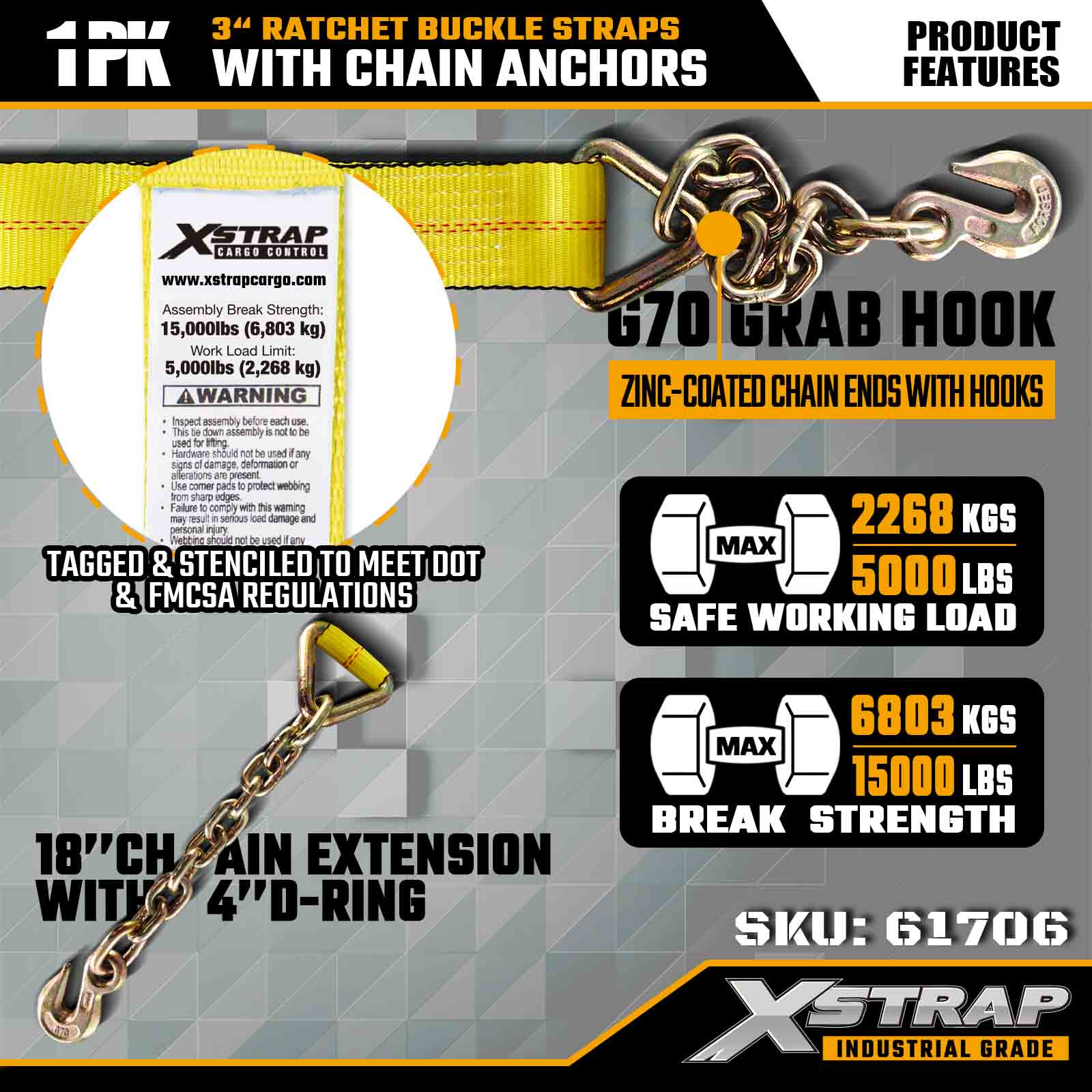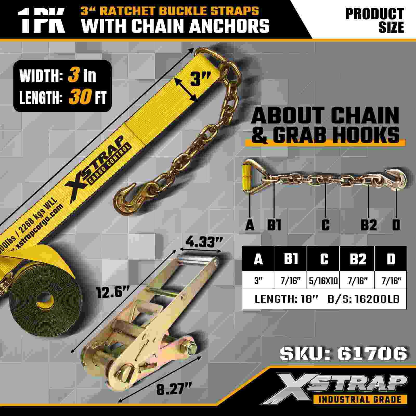 Xstrap 61706 3" × 30피트 래칫 버클 스트랩(1팩)은 단조 체인 앵커와 고장력 래칫 시스템을 특징으로 하는 견고한 화물 고정용으로 설계되었습니다. WLL 5,000lbs 및 파손 강도 15,000lbs로 플랫베드, 기계 운송 및 산업용 운반에 안정적인 성능을 제공합니다.