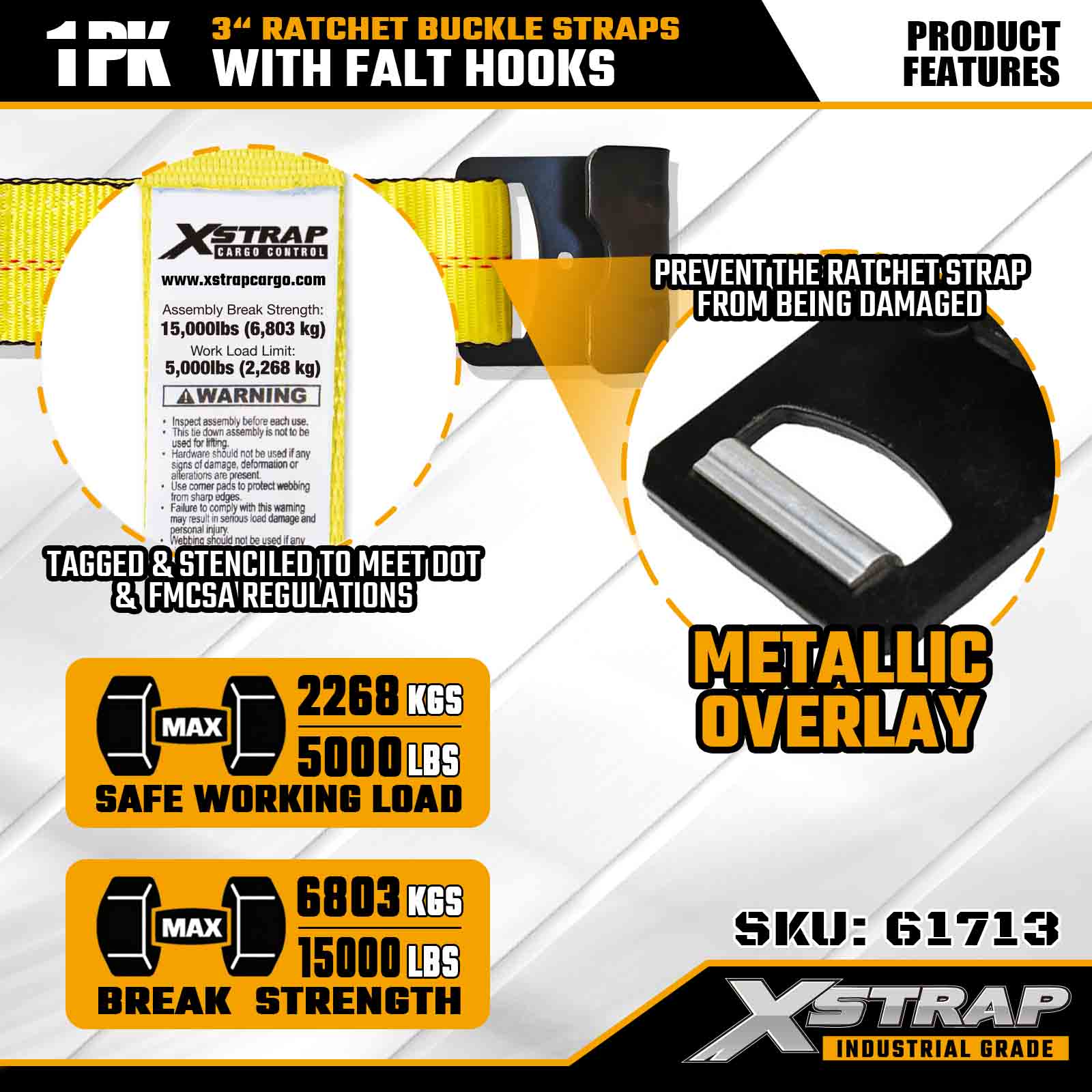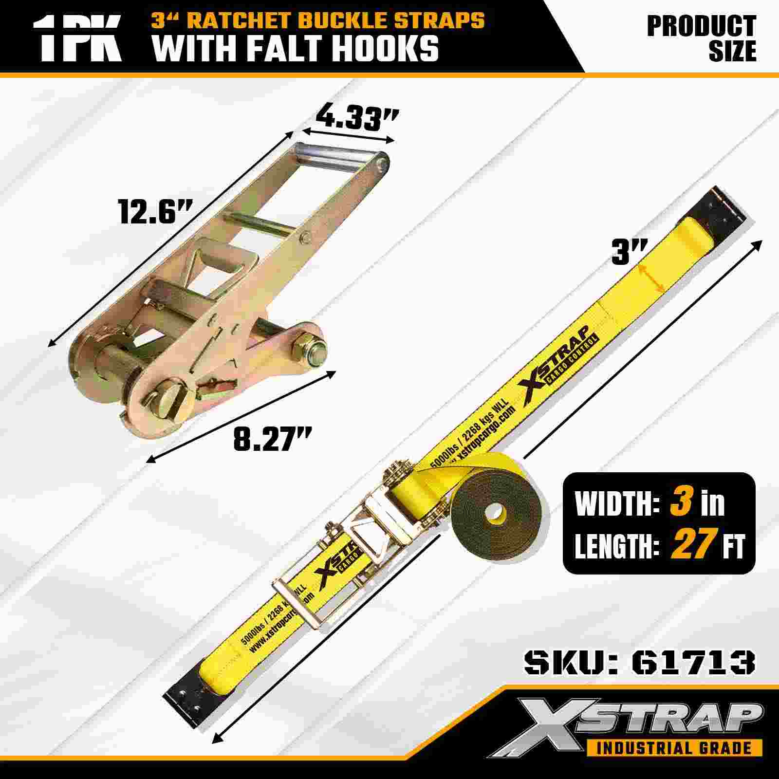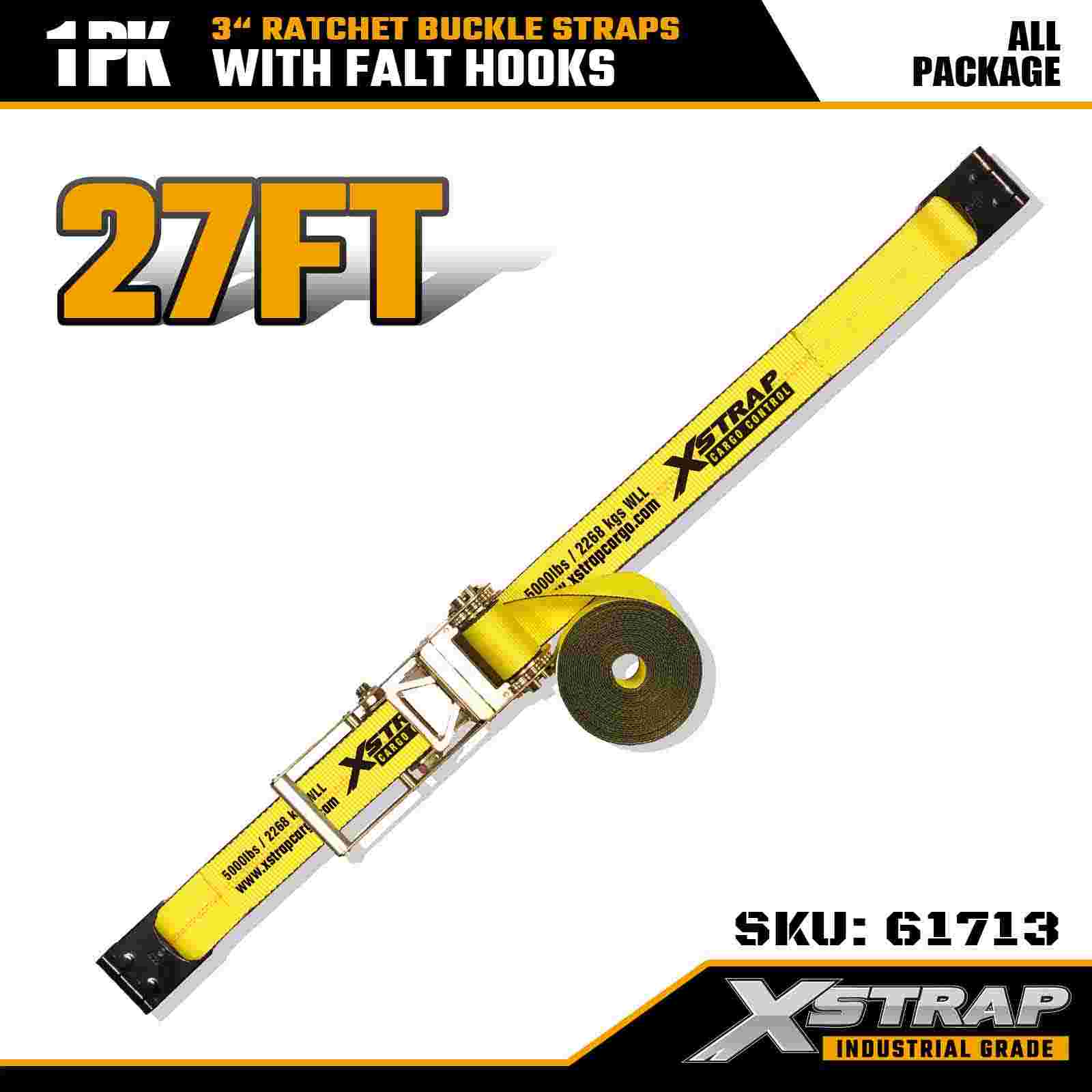 Xstrap 61713 3" x 27피트 래칫 버클 스트랩(1팩) 플랫 후크, 5,000lbs 부하 용량 15,000lbs 파손 강도, 트럭, 트레일러 및 산업용 화물 운송을 위한 견고한 고정 장치.