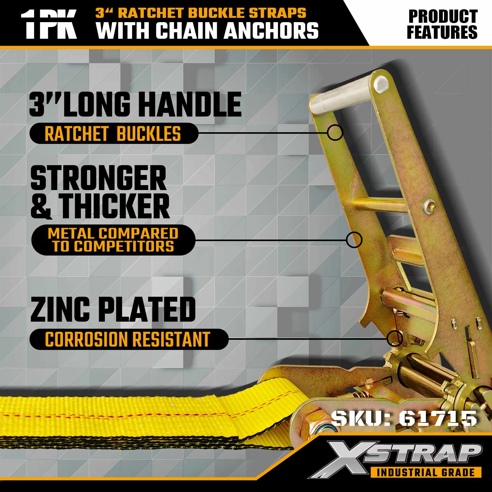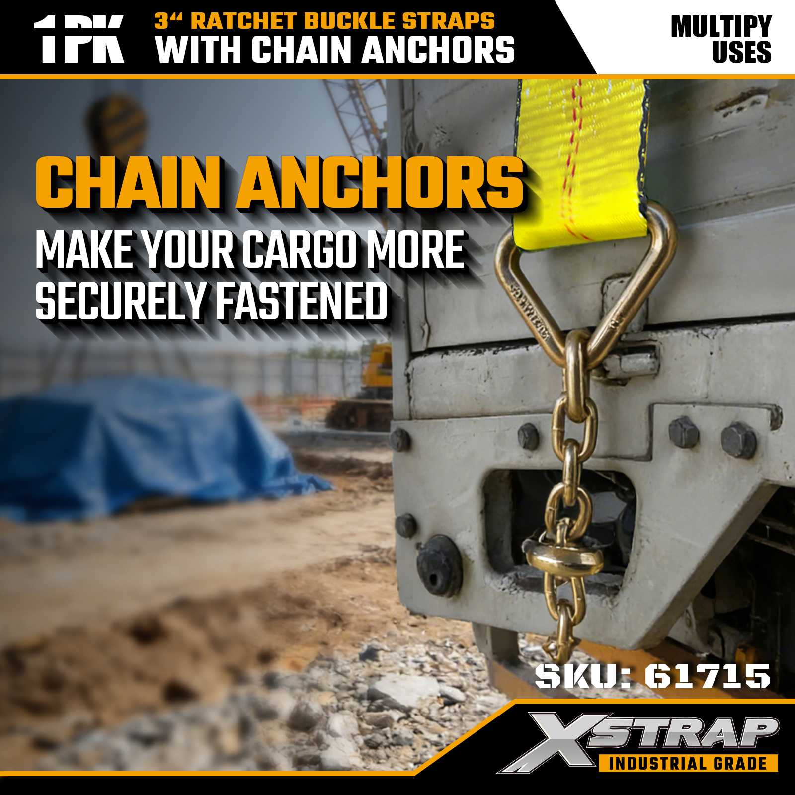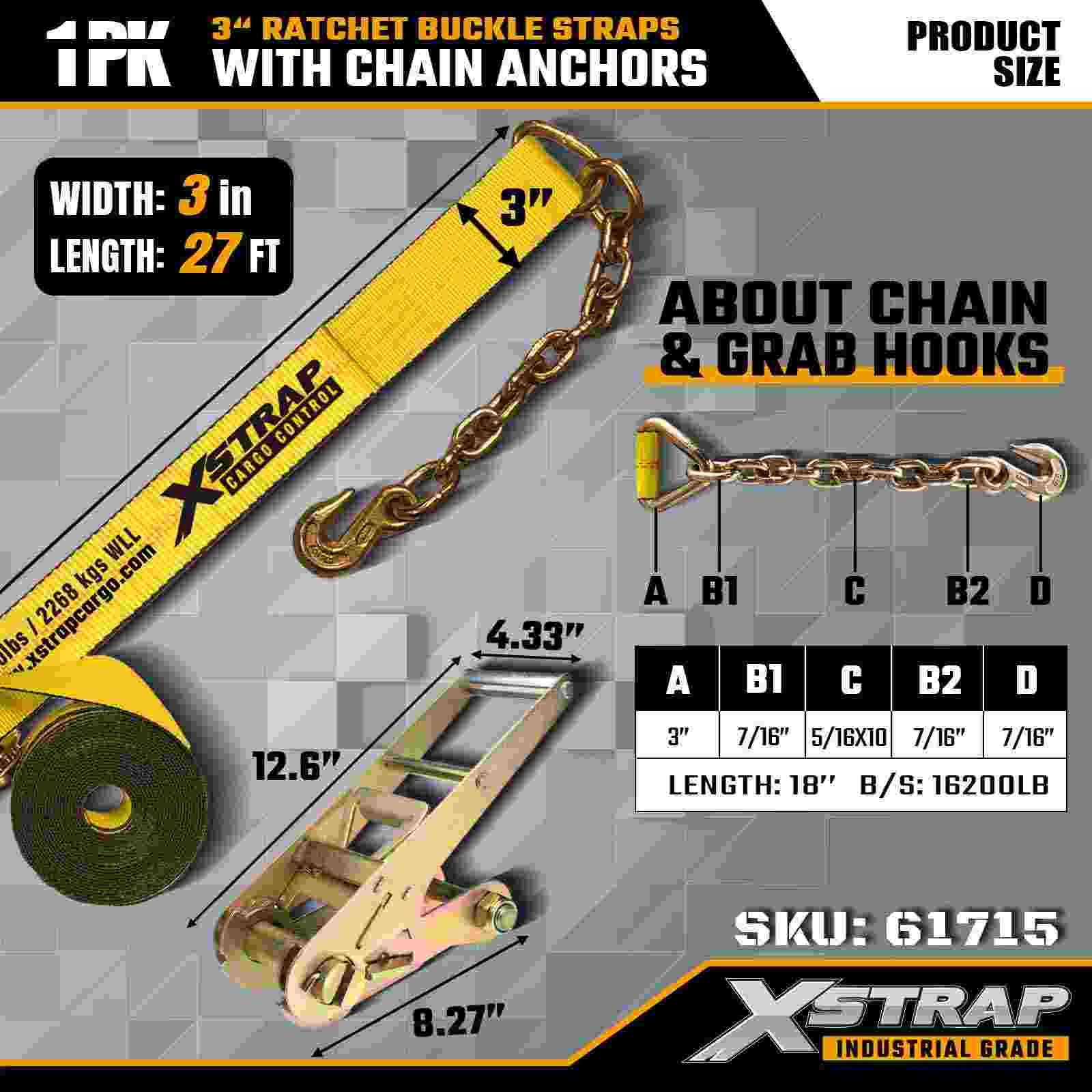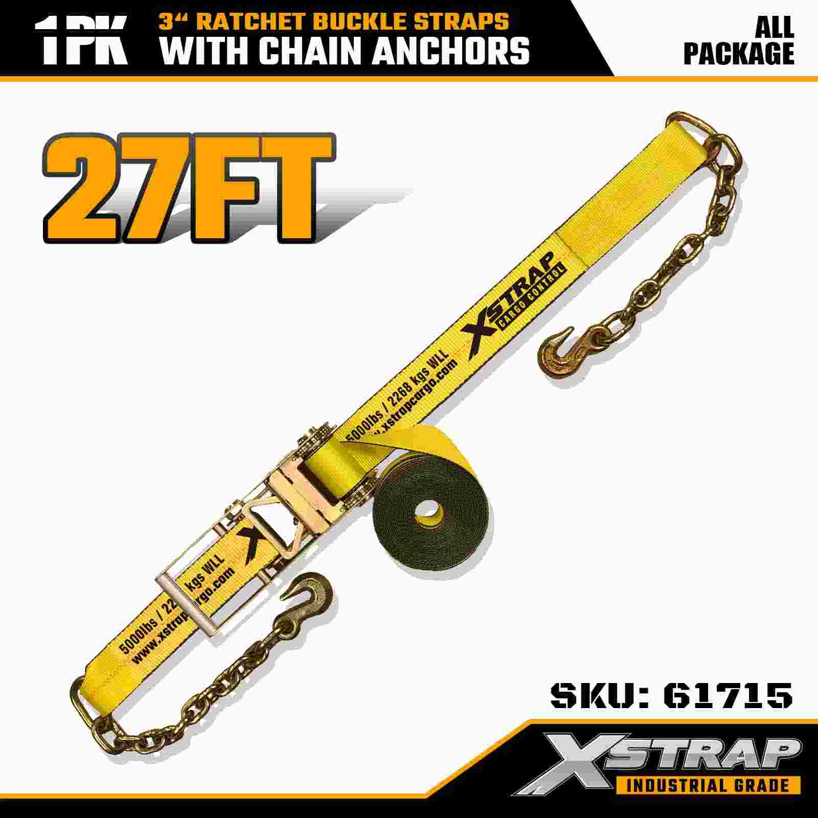Xstrap 61715 3" x 27ft 래칫 버클 스트랩(1팩) – 체인 앵커, 5,000lbs 부하 용량, 15,000lbs 파손 강도. 중부하 화물 제어용으로 설계된 이 스트랩은 산업용 등급 웨빙과 체인 앵커 끝부분을 결합하여 트럭, 트레일러 및 건설 운송 시 최대의 보안을 제공합니다.