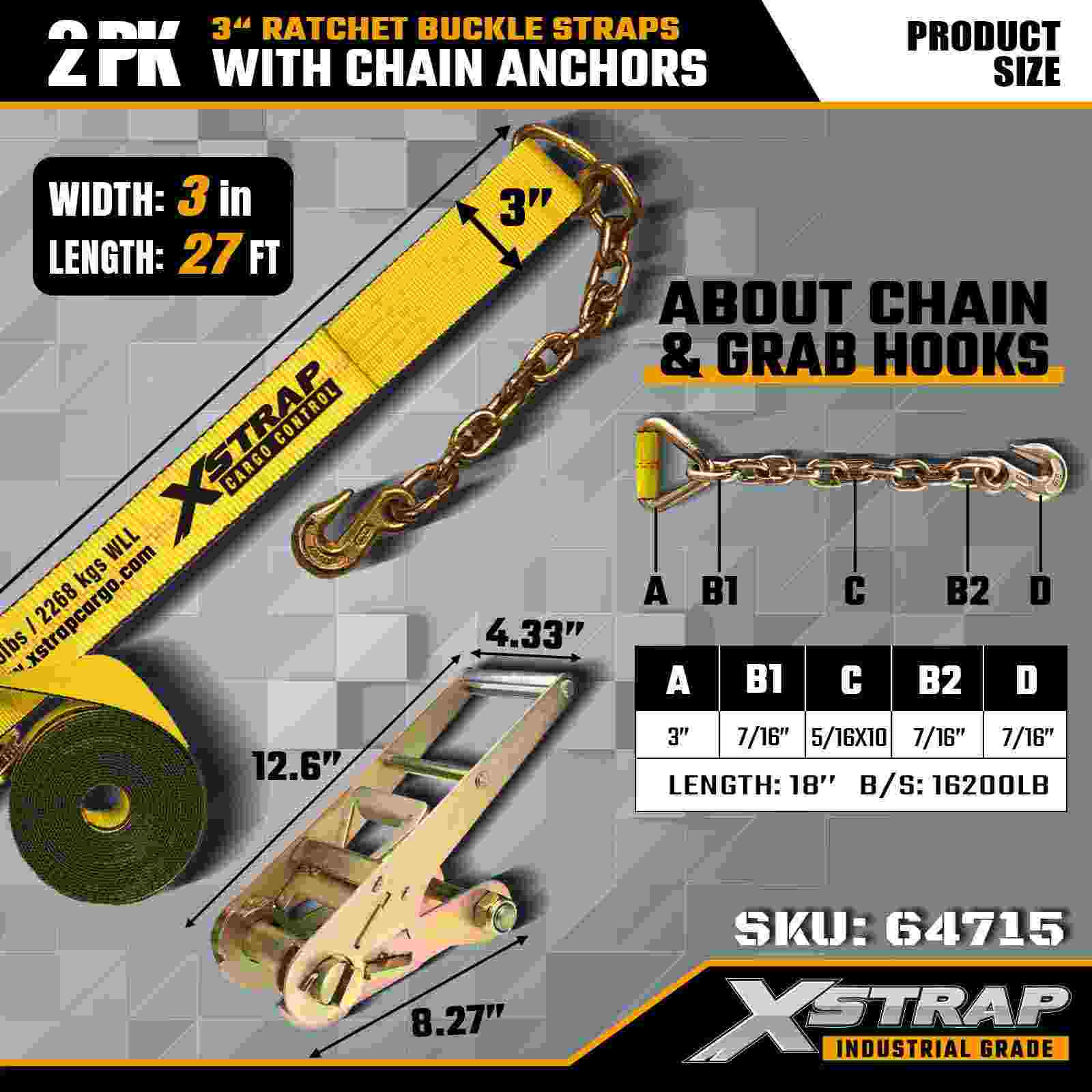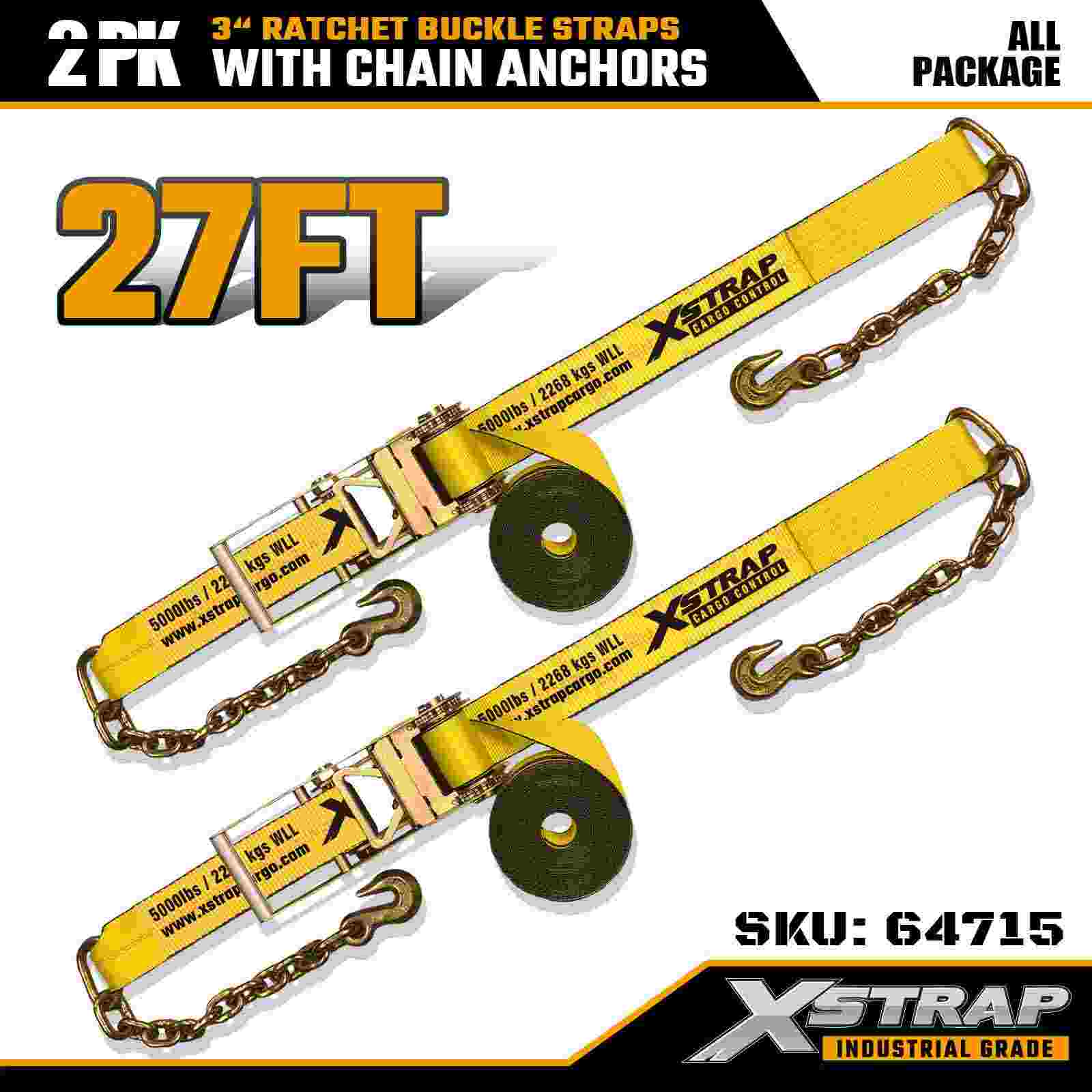 Xstrap 64715 3" × 27피트 래칫 버클 스트랩(2팩) – 까다로운 화물 환경에 맞게 설계된 튼튼한 체인 앵커가 장착되어 있습니다. 5,000lbs의 작업 하중 제한과 15,000lbs의 파손 강도를 갖춘 이 스트랩은 플랫베드, 기계 운송 및 산업용 운반을 위한 안전하고 안정적인 전문가급 고정 성능을 제공합니다.