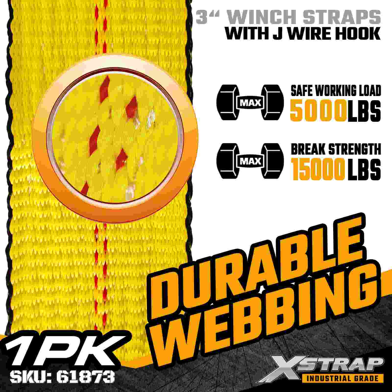 Xstrap 61873 3" × 30피트 표준 윈치 스트랩은 평상형 트레일러 및 대형 화물용으로 설계된 튼튼한 화물 고정 스트랩입니다. 강화된 와이어 후크와 매우 넓은 3인치 폴리에스터 웨빙이 특징인 이 3인치 윈치 스트랩은 5,000lbs의 작업 하중 제한과 15,000lbs의 파손 강도를 제공합니다. 확장된 30피트 길이는 추가 도달 거리를 제공하여 더 넓고, 더 크거나, 화물을 고정하는 데 이상적입니다. 유연한 부착 옵션이 필요한 불규칙한 모양의 화물.