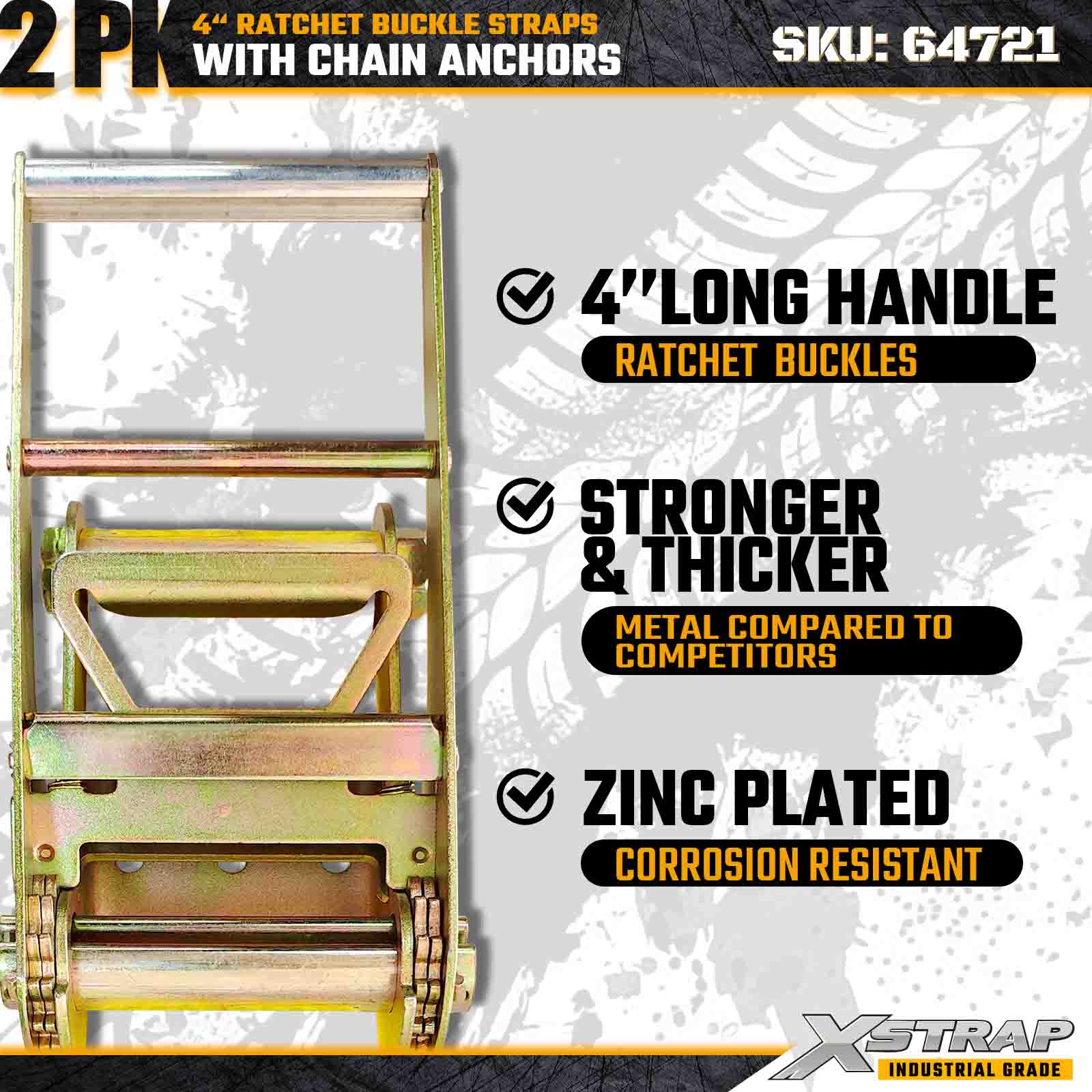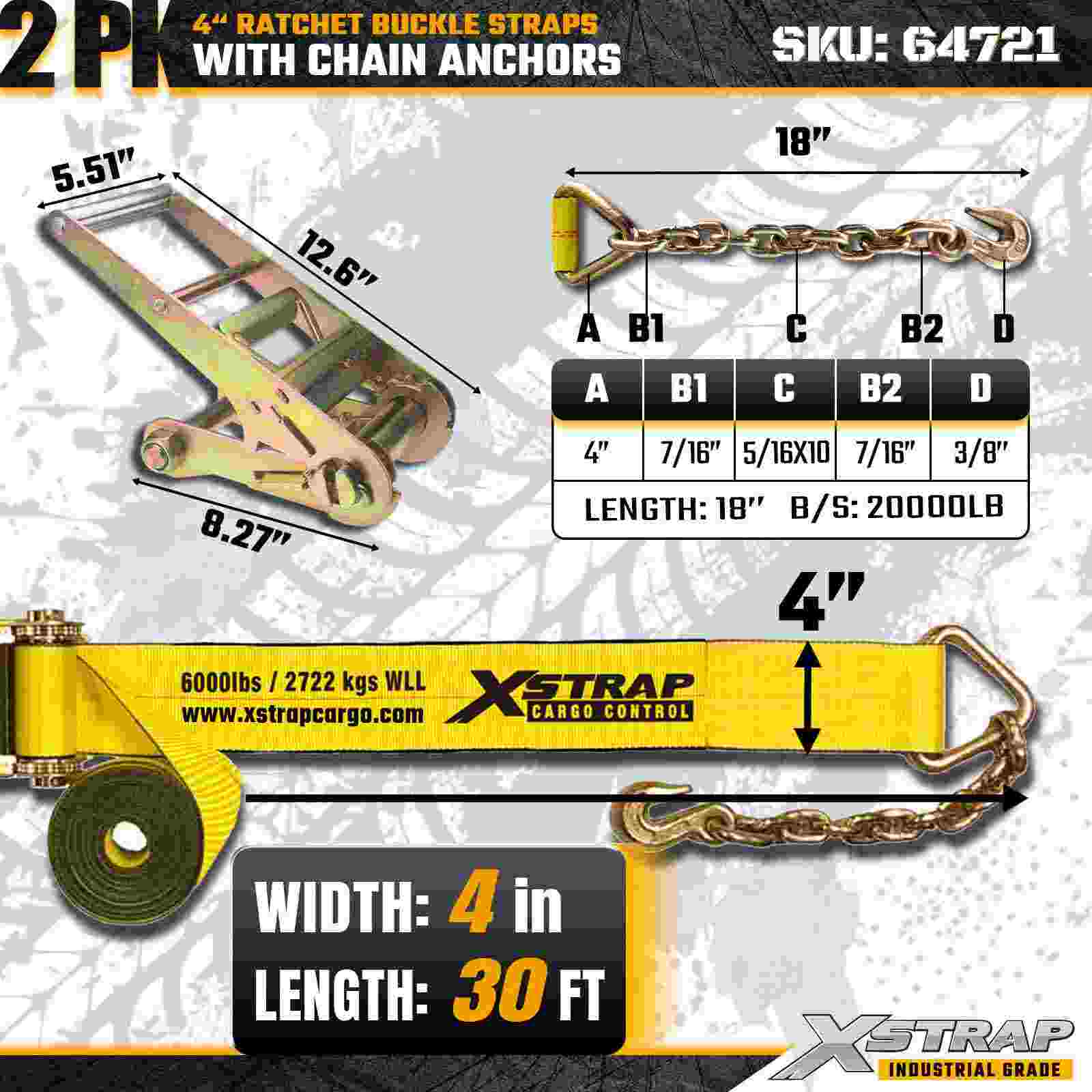 Xstrap 64721 4" × 30피트 래칫 버클 스트랩(2팩)은 견고한 체인 앵커와 강화된 래칫 메커니즘을 특징으로 하는 견고한 화물 고정을 위해 설계되었습니다. 6,000lbs의 작업 하중 제한과 18,000lbs의 파손 강도를 갖춘 이 스트랩은 최대 강도와 신뢰성이 요구되는 평상형 운반, 기계 운송, 강철 하중 및 산업용 화물 응용 분야에 이상적입니다.