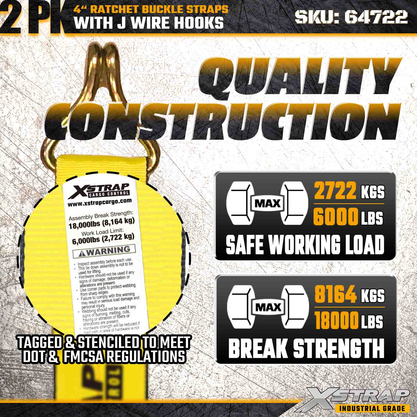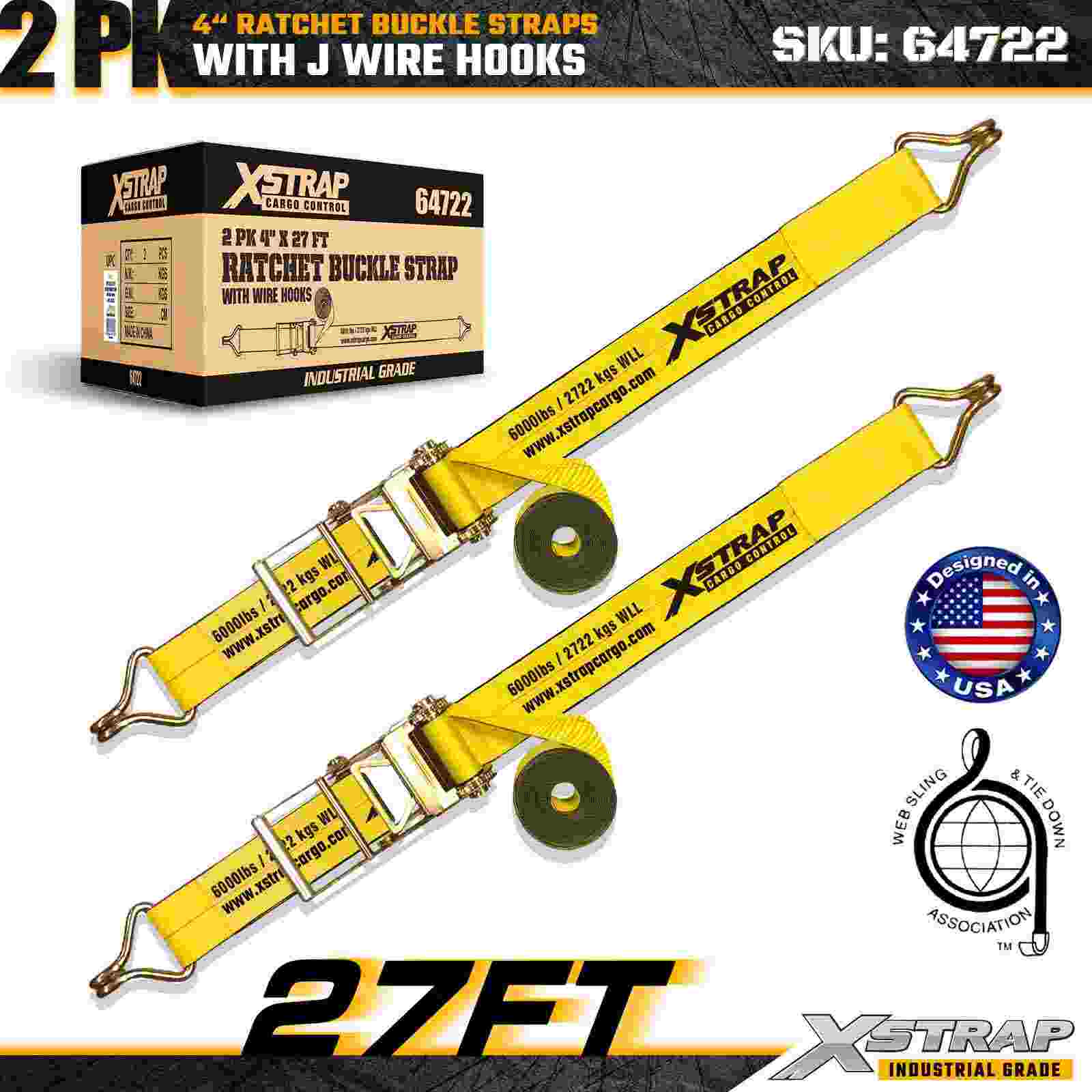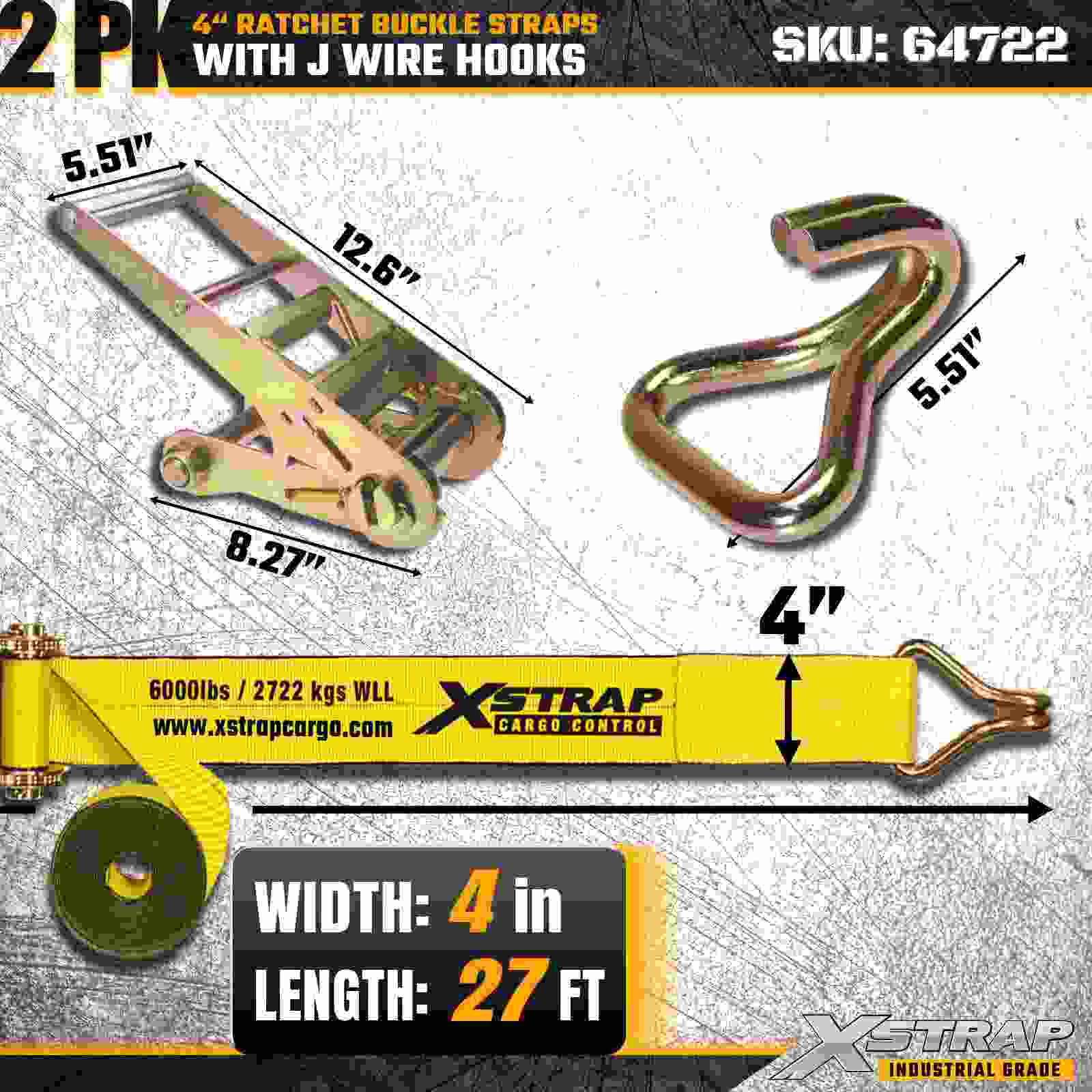 Xstrap 64722 4" × 27피트 래칫 버클 스트랩(2팩)은 강화된 와이어 후크와 내구성 있는 래칫 메커니즘을 특징으로 하는 견고한 화물 고정을 위해 설계되었습니다. 6,000lbs의 작업 하중 제한과 18,000lbs의 파손 강도를 갖춘 이 스트랩은 평판 운반, 기계 운송, 목재, 강철 적재 및 산업용 화물 응용 분야에 이상적입니다.