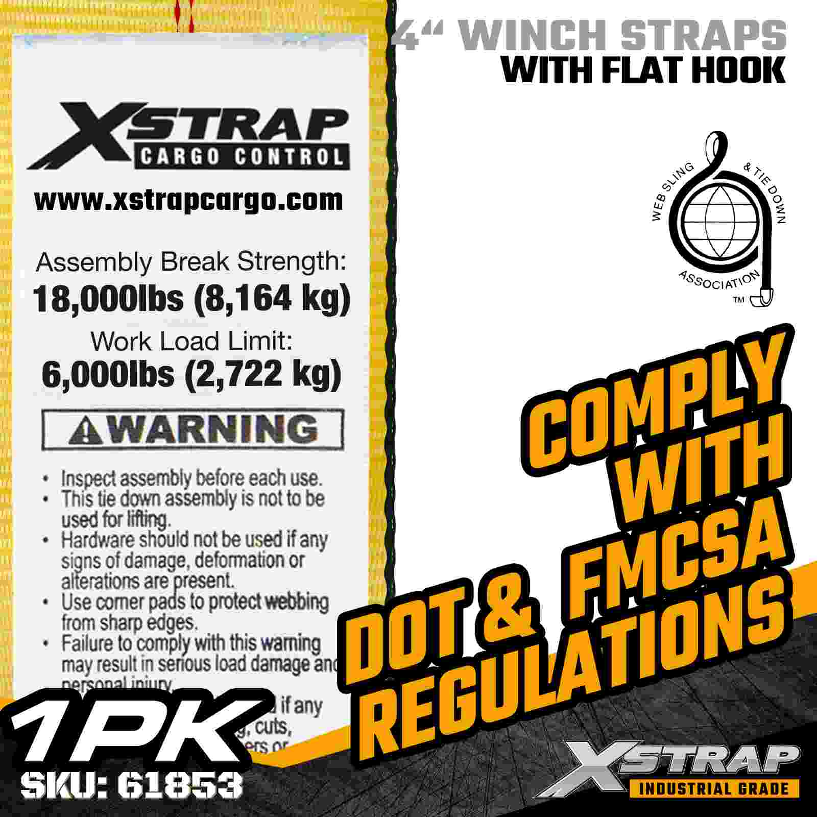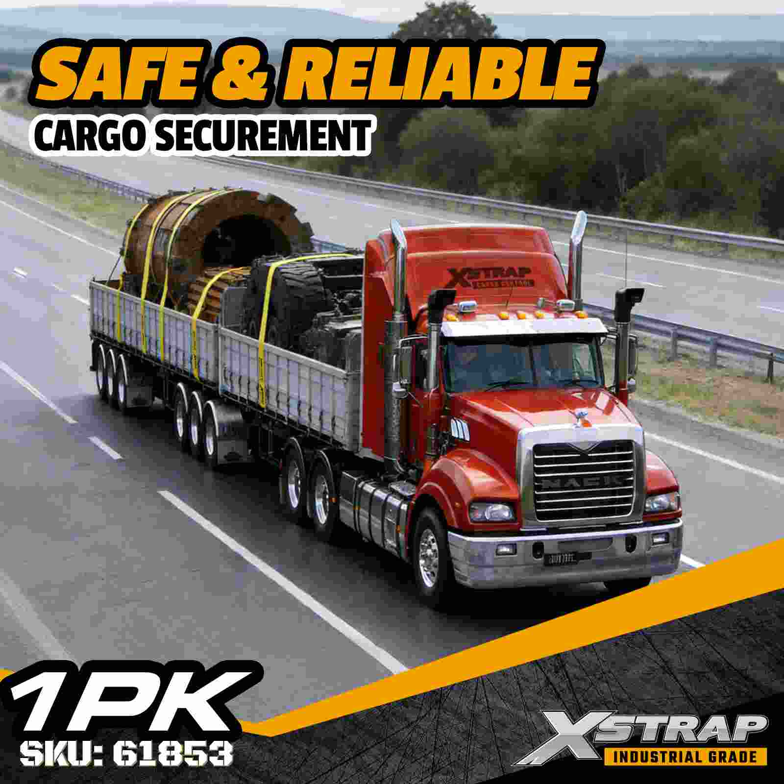 Xstrap 61853 4" × 40피트 표준 윈치 스트랩은 평상형 트레일러 및 대형 산업용 화물용으로 설계된 고용량, 확장된 화물 고정 스트랩입니다. 강화된 플랫 후크와 매우 넓은 4인치 폴리에스터 웨빙을 갖춘 이 4인치 윈치 스트랩은 6,000lbs의 작업 하중 제한과 18,000lbs의 파손 강도를 제공합니다. 매우 긴 40ft 길이는 고정을 위한 뛰어난 도달 거리를 제공합니다. 최대의 적용 범위와 안정성이 필요한 넓고, 높거나, 모양이 불규칙한 화물.