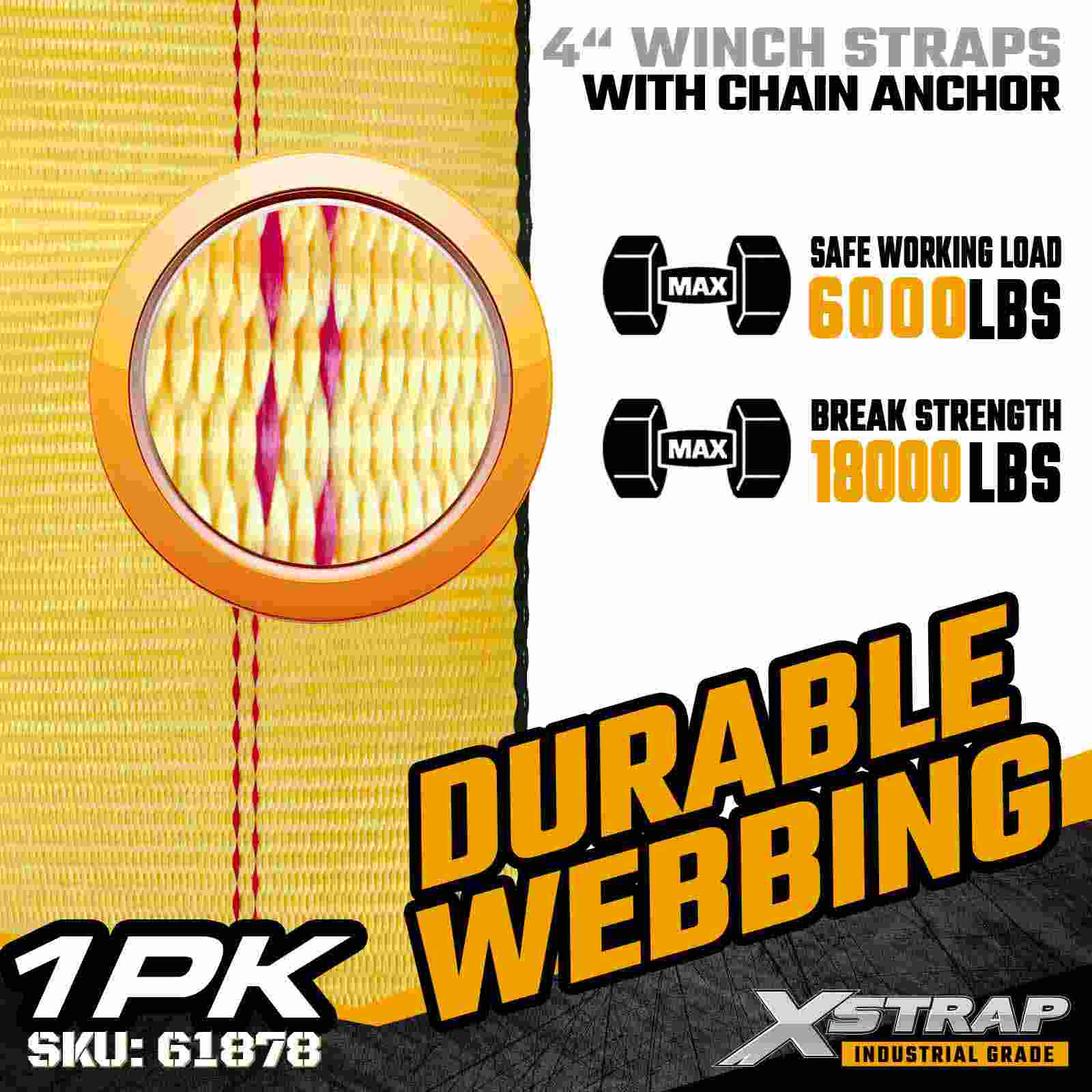 Xstrap 61878 4" × 27피트 표준 윈치 스트랩은 평상형 트레일러 및 극한의 하중 조건을 위해 설계된 견고한 산업용 화물 고정 스트랩입니다. 단조 체인 앵커와 초광폭 4인치 폴리에스테르 웨빙이 특징인 이 4인치 윈치 스트랩은 6,000lbs의 작업 하중 제한과 18,000lbs의 파손 강도를 제공합니다. 체인 앵커 디자인은 비교할 수 없는 그립과 내구성을 제공하여 이상적입니다. 철강, 기계, 기타 고장력 화물을 고정하기 위한 것입니다.