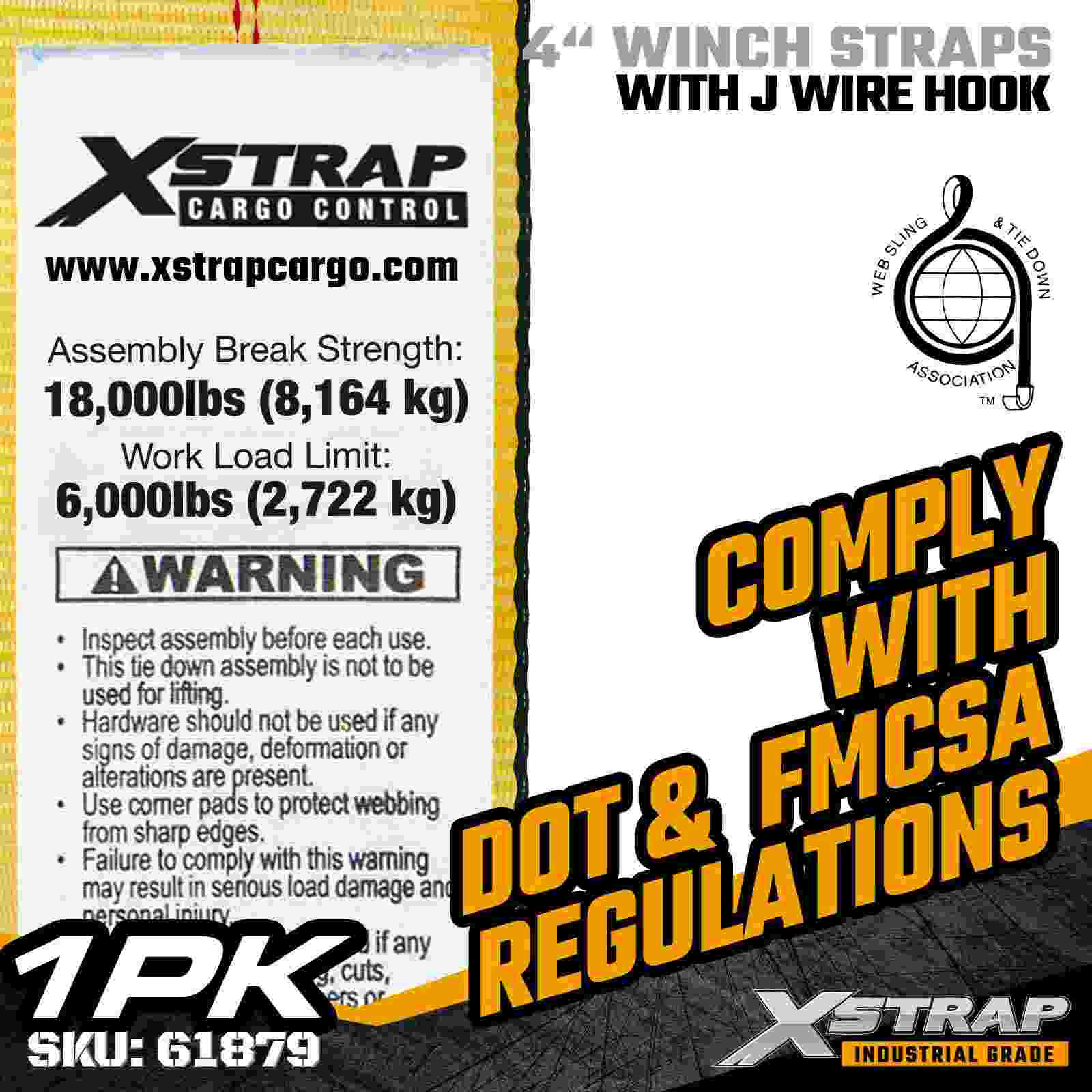 Xstrap 61879 4" × 27피트 표준 윈치 스트랩은 플랫베드 트레일러 및 산업 운송용으로 설계된 견고하고 유연한 고정 화물 고정 스트랩입니다. 강화된 와이어 후크와 매우 넓은 4인치 폴리에스테르 웨빙을 갖춘 이 4인치 윈치 스트랩은 6,000lbs의 작업 하중 제한과 18,000lbs의 파손 강도를 제공합니다. 와이어 후크 디자인은 다양한 부착 옵션을 제공하여 필요한 작업자에게 이상적입니다. 다양한 화물 유형에 대한 빠르고 적응 가능한 연결 지점입니다.
