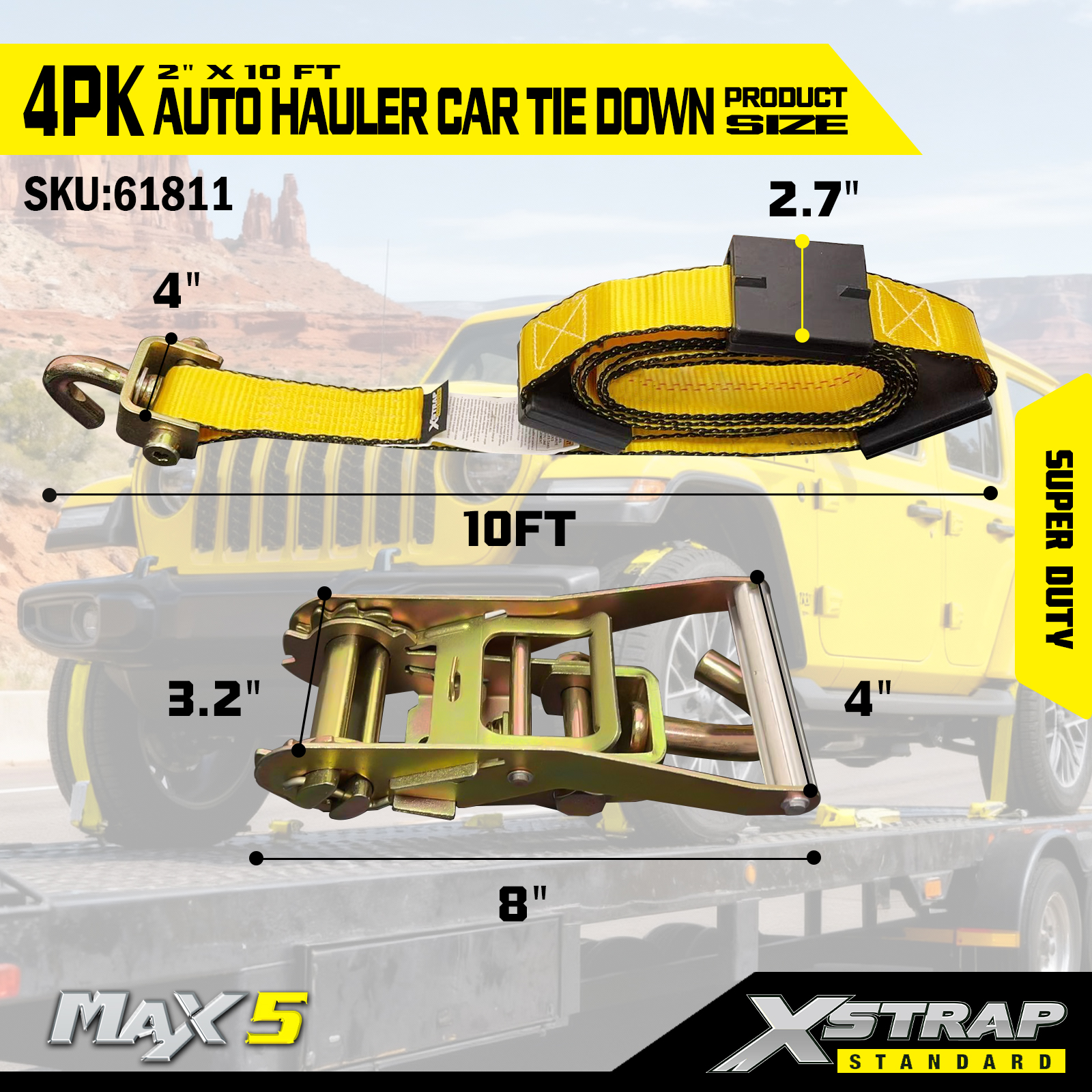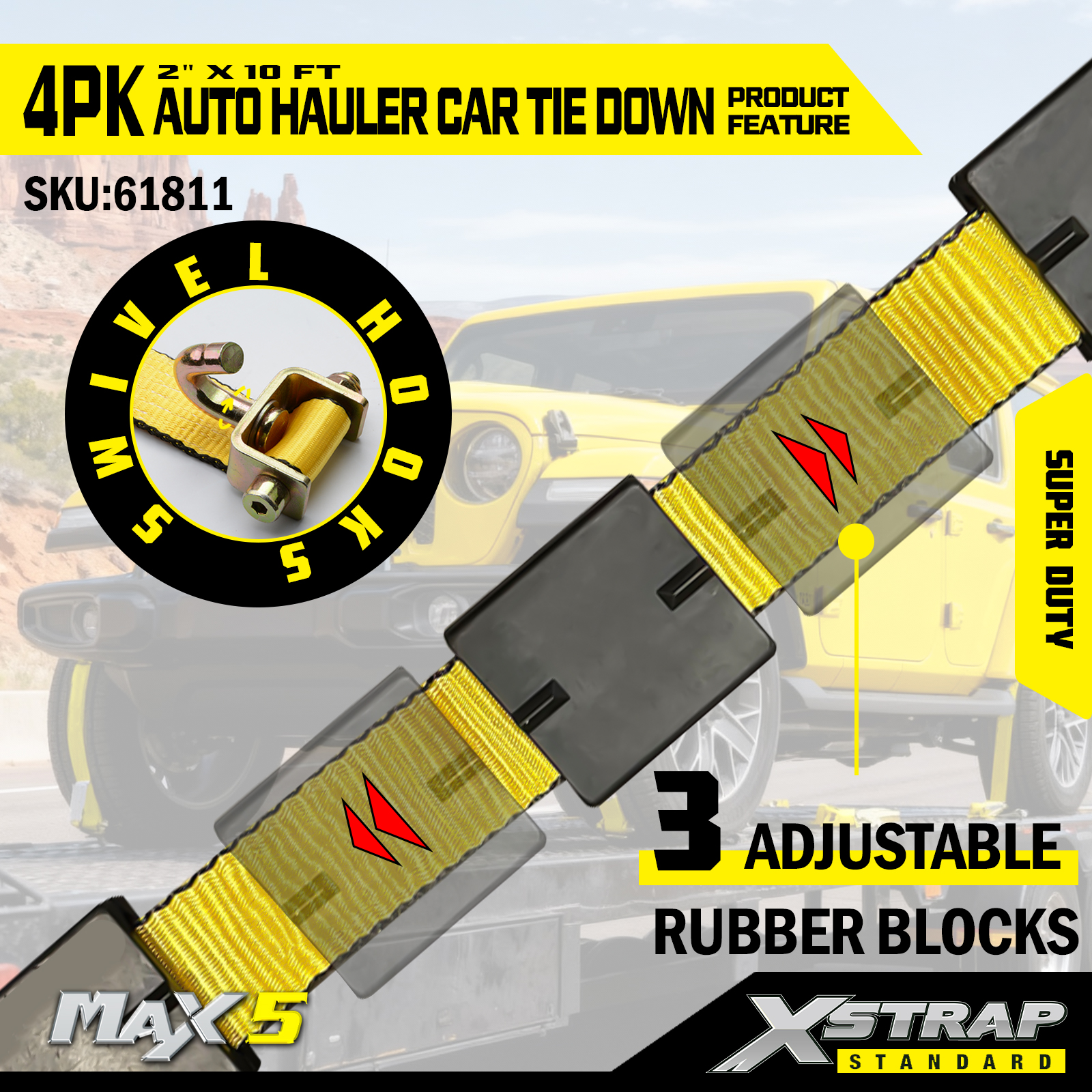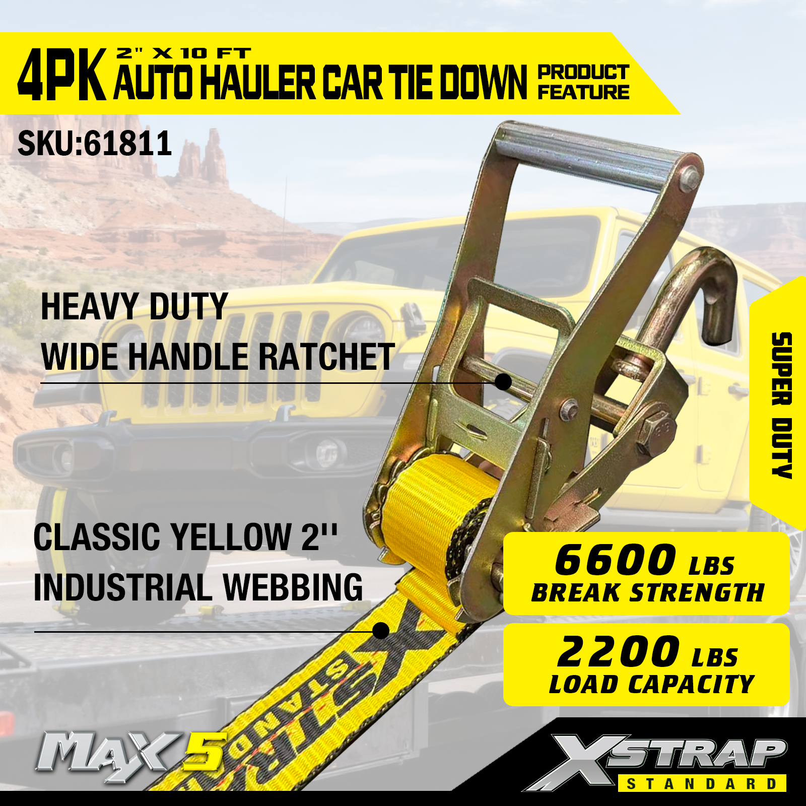 - 슈퍼 듀티 성능: 각 스트랩의 안전 작업 하중은 2,200입니다. 안전한 작업 하중은 각 고정 스트랩의 경고 태그에 찍혀 있어 쉽게 검사할 수 있으며, 무거운 차량과 까다로운 운송 시나리오를 처리할 수 있도록 제작되었습니다.