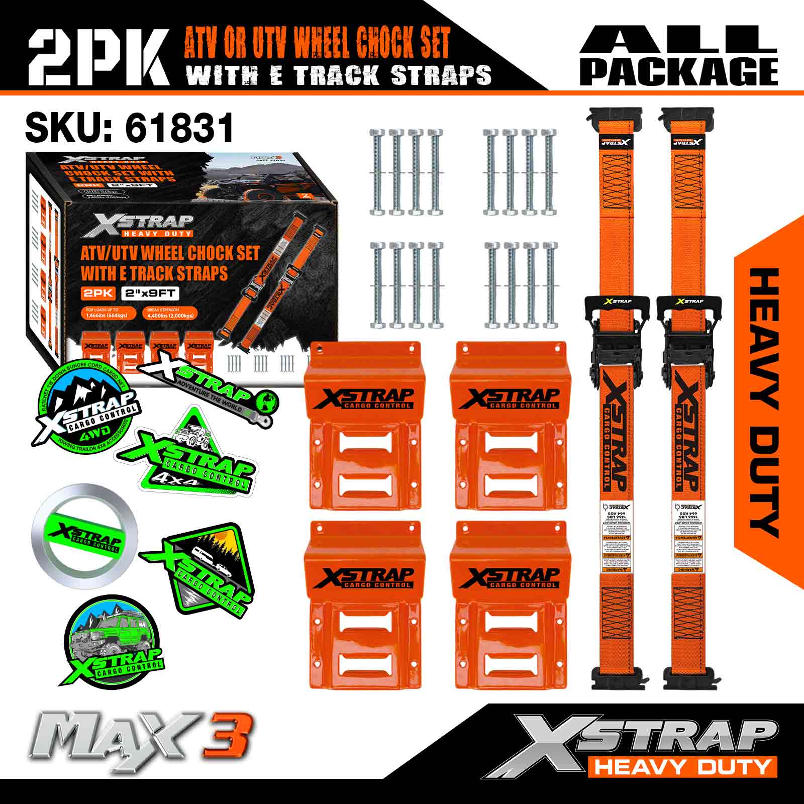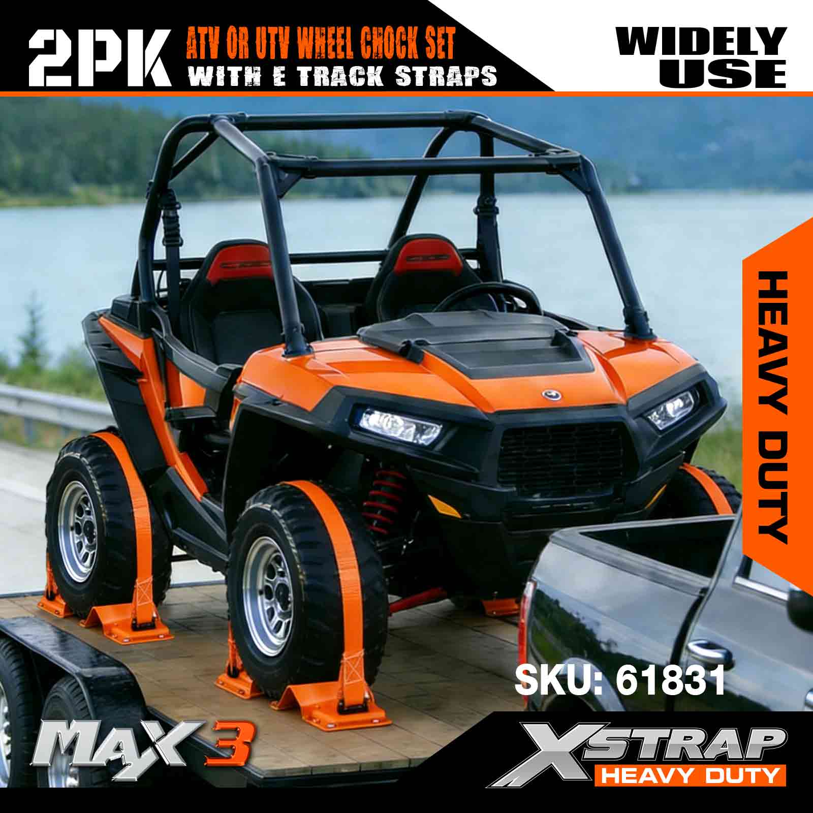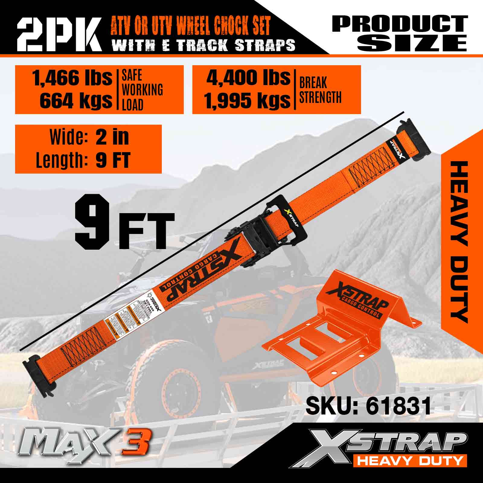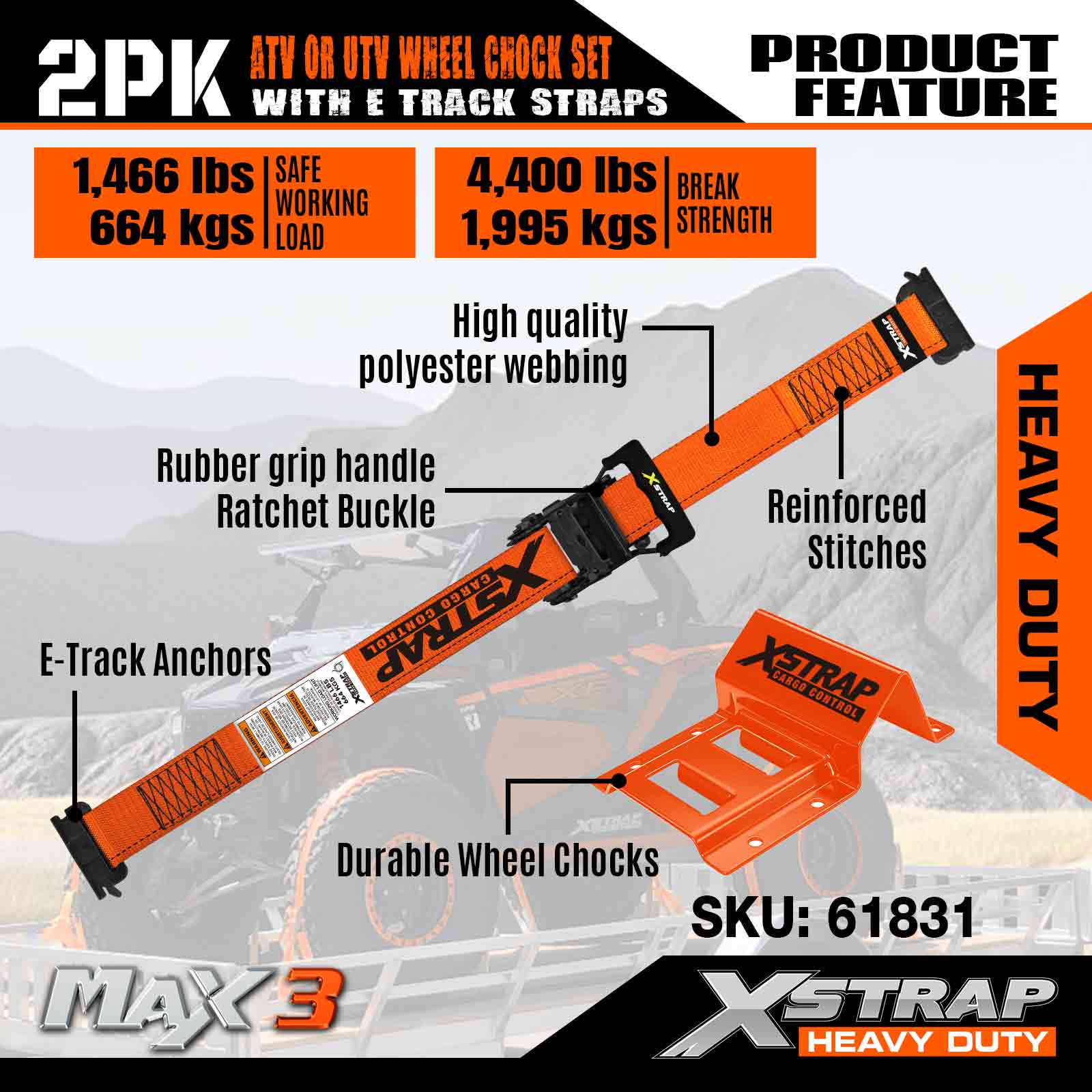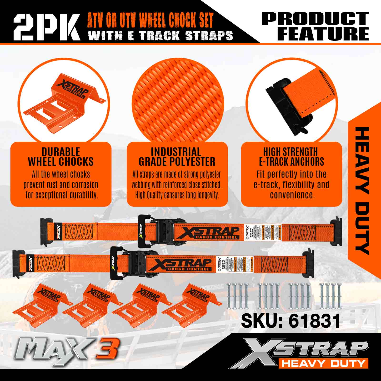 Xstrap UTV 휠 초크 타이다운 키트 4,400파운드 파손 강도 (4) 헤비 듀티 트레일러 타이어 래칫 스트랩 (8) 휠 초크 - ATV, UTV, 잔디 깎는 기계용 E 트랙 시스템 4륜차 - 주황색