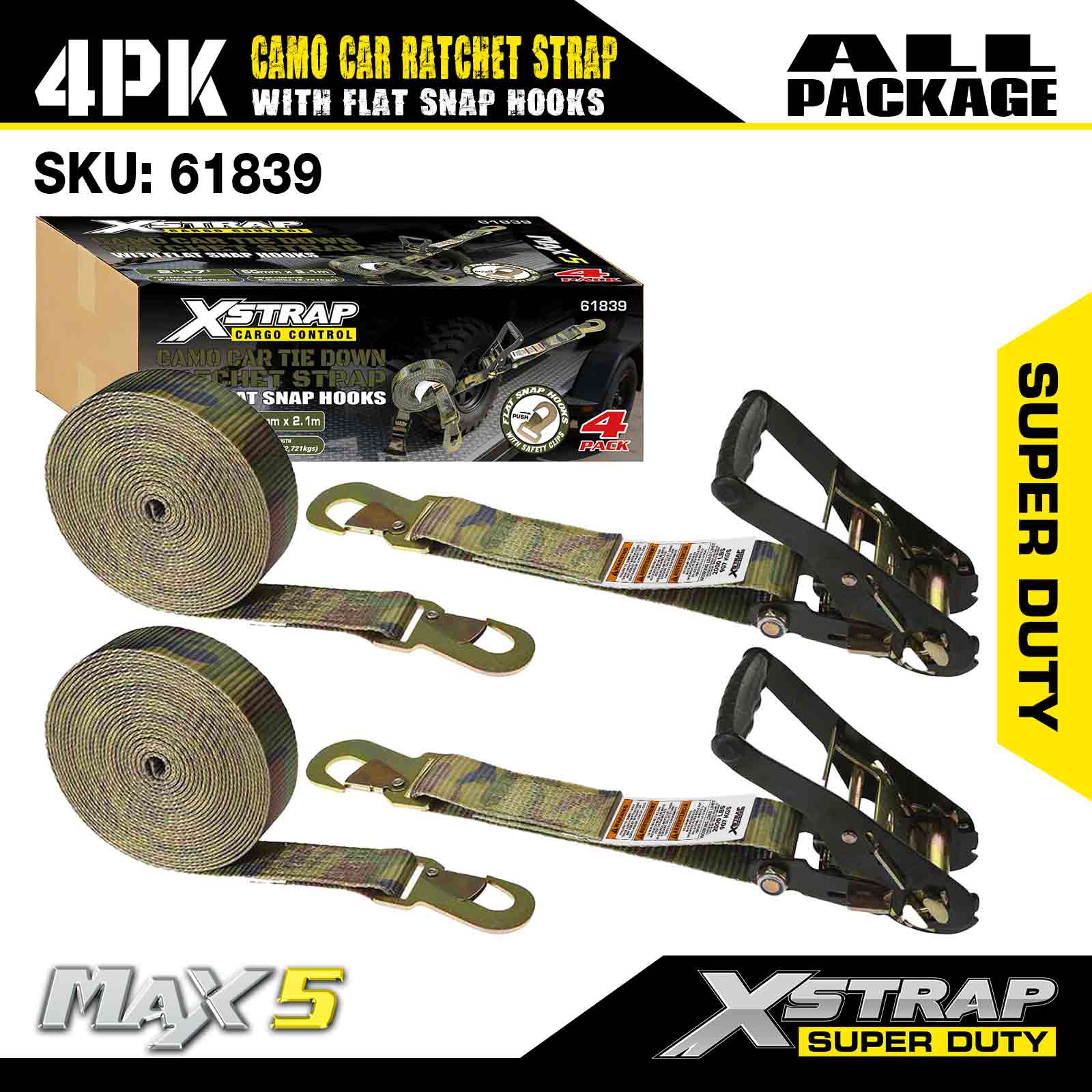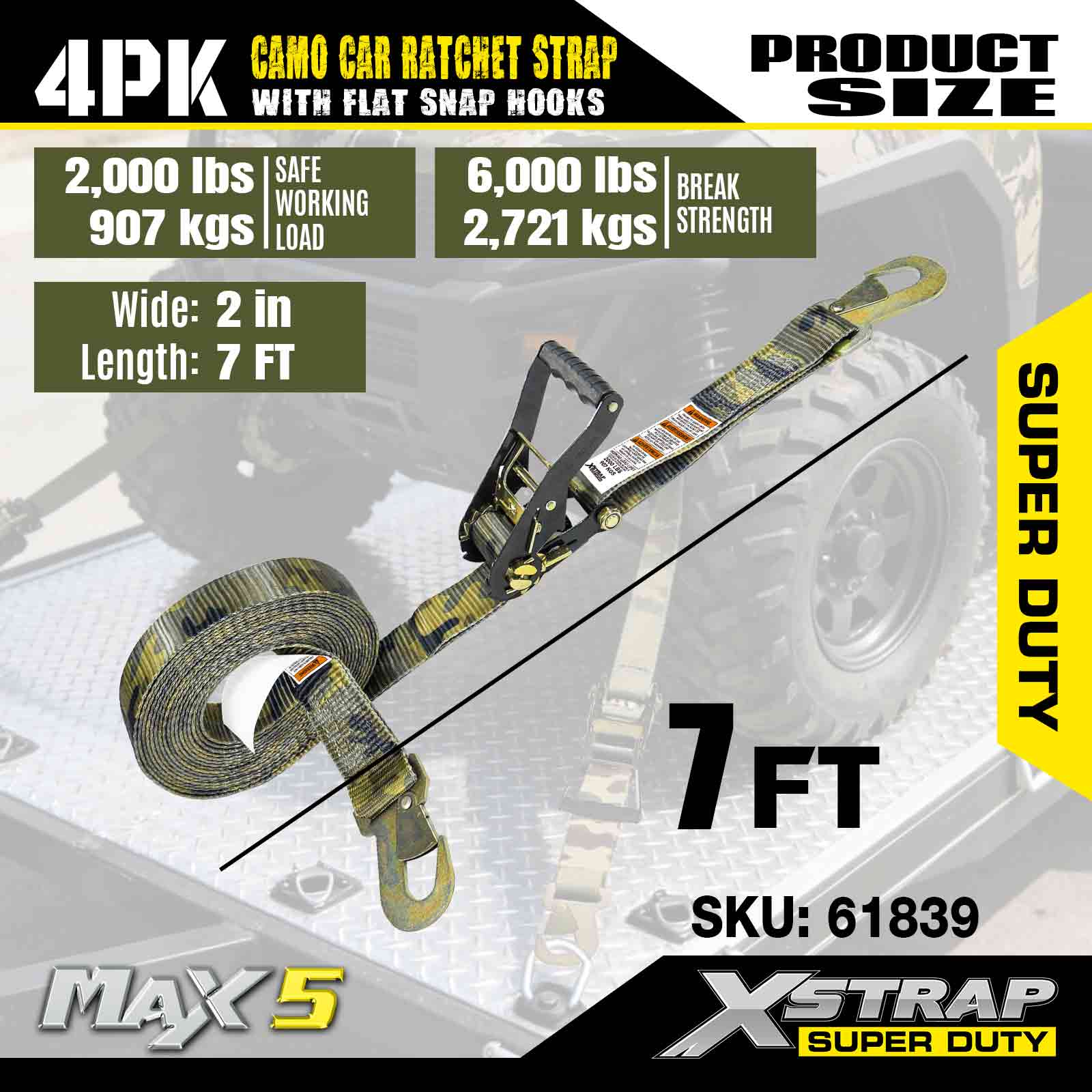 평면 스냅 후크가 있는 Xstrap 화물 제어 자동 래칫 스트랩 2인치 x 7피트(4팩), 6,000LBS 파손 강도, 평면 잠금 후크가 있는 다용도 래칫 스트랩, 자동차, 오토바이 및 기타 차량 고정