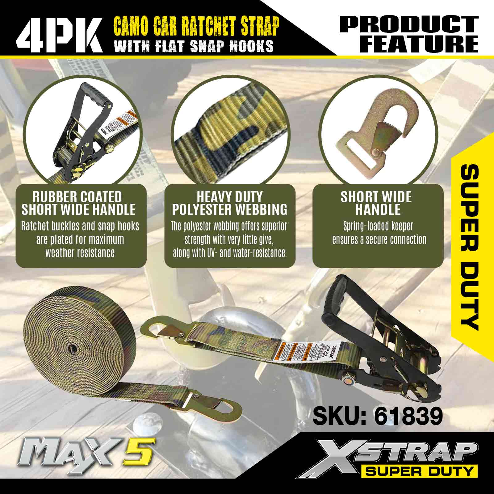 - 날씨 안전 보호 - 이 고정 장치의 스트랩은 날씨에 안전한 폴리에스테르로 만들어졌습니다. 이 스트랩은 물 근처나 직사광선 아래에서 사용해도 안전합니다. 이 래칫 스트랩의 하드웨어는 보호를 위해 아연 도금되어 있습니다.