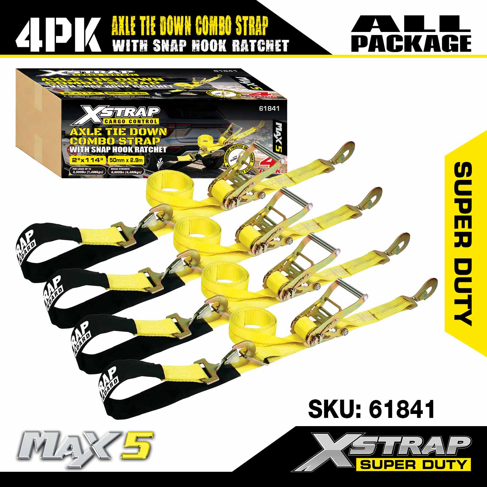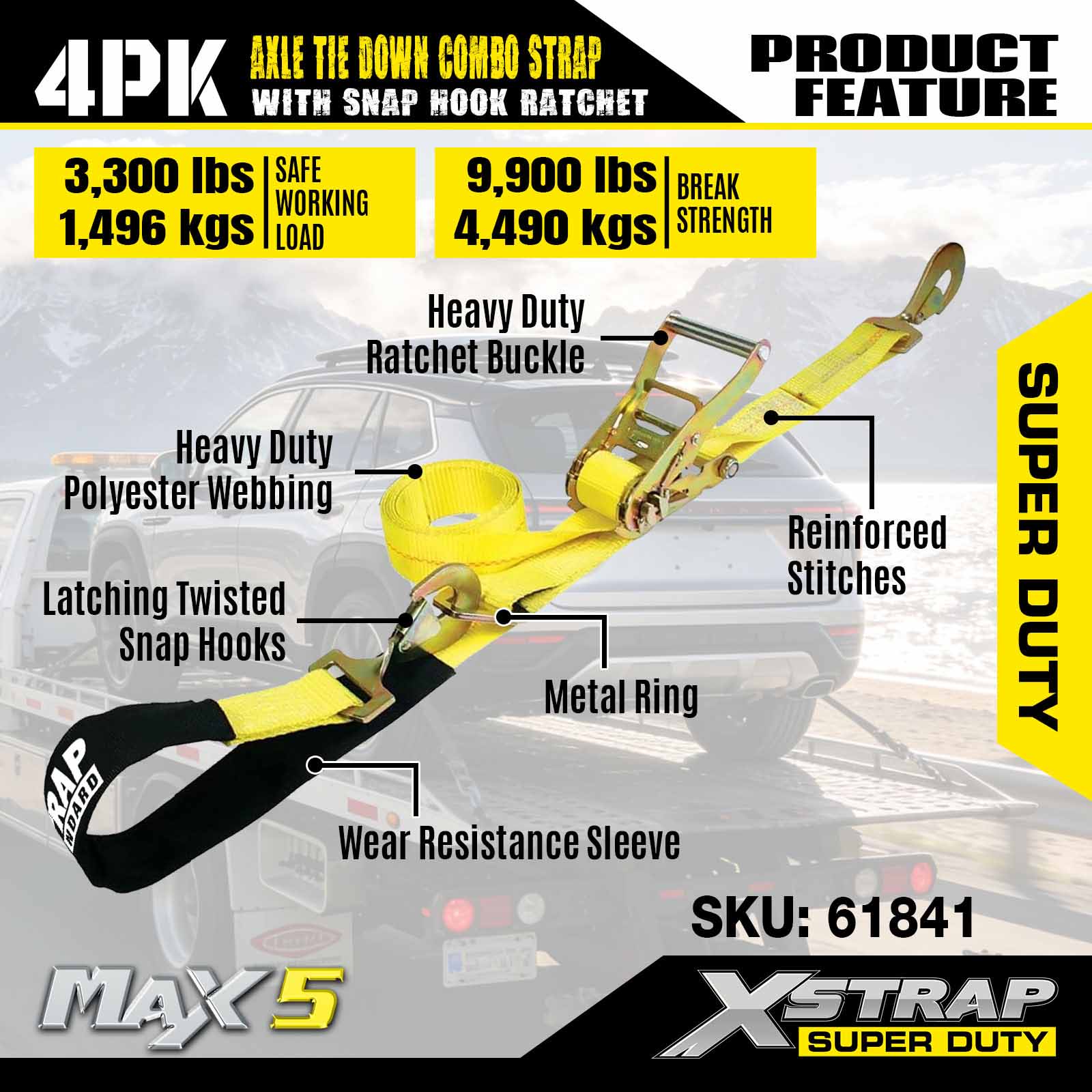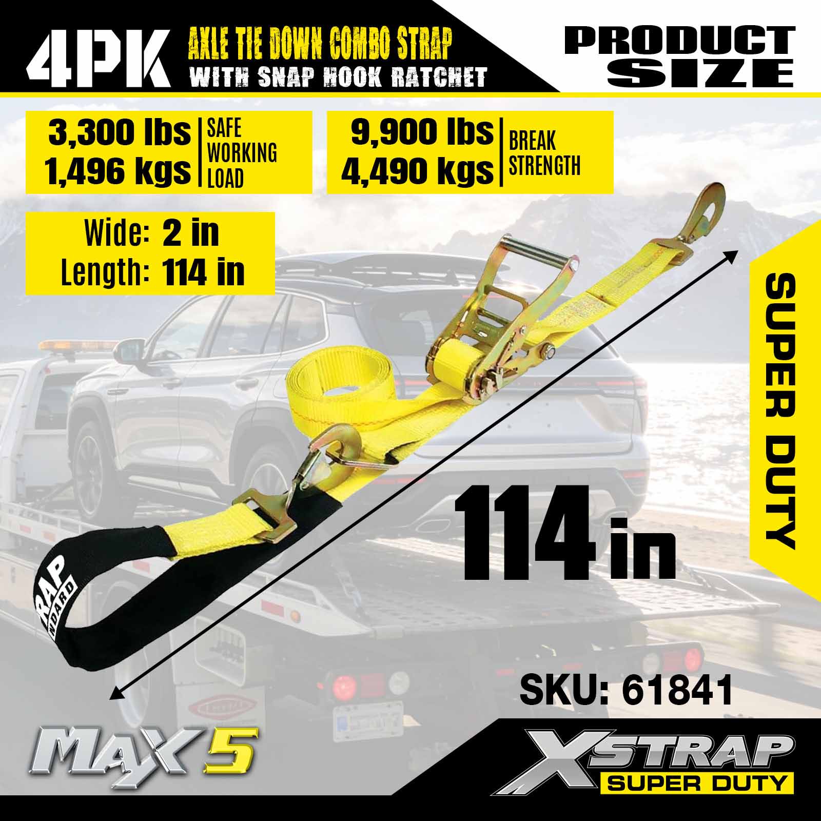 - 4팩 114인치 차축 스트랩: 다용도 올가미 자동 고정 장치는 운송 차량의 테두리를 통과하는 데 사용되며 바퀴, 차축 또는 프레임의 견고한 부분에도 고정할 수 있습니다.