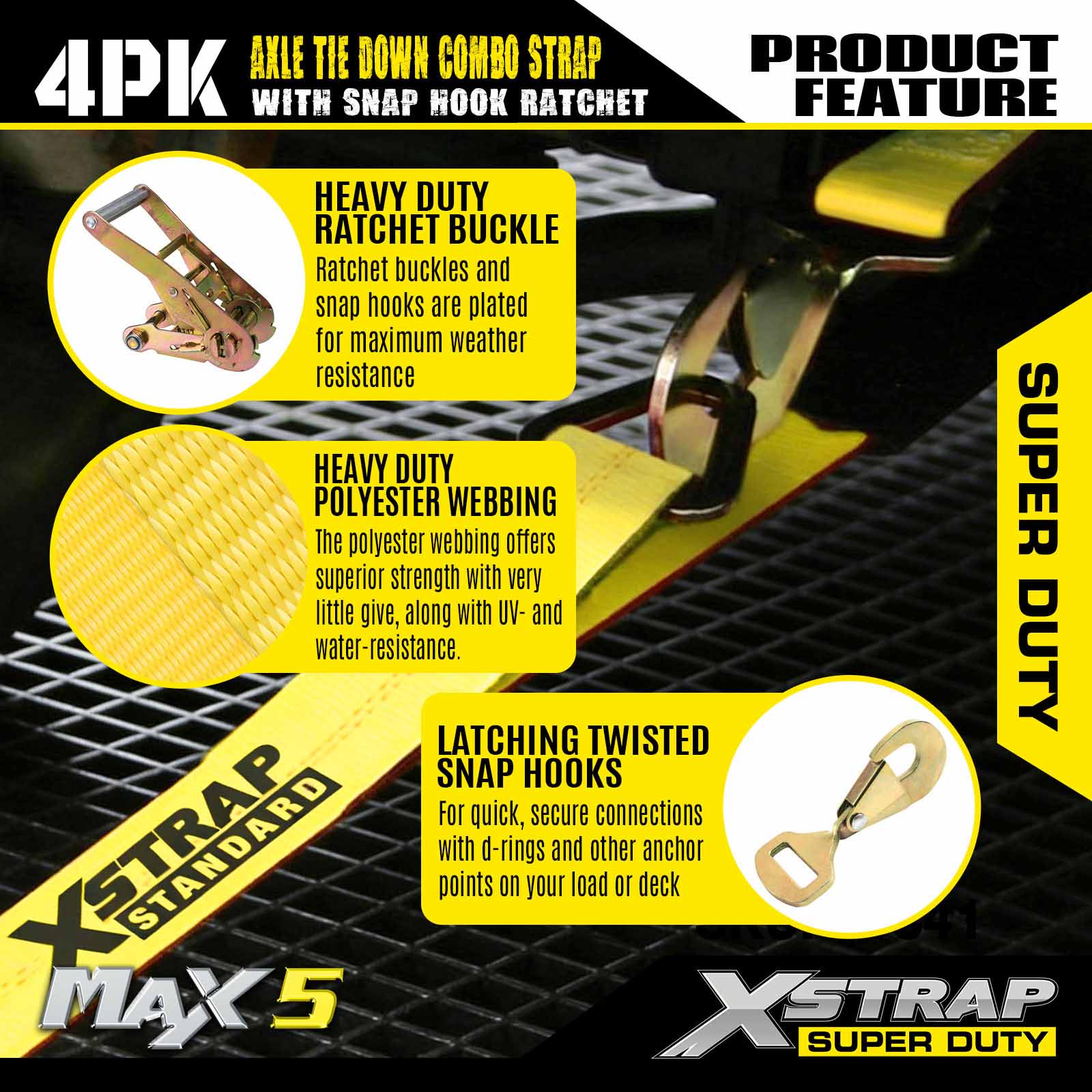 Xstrap 헤비듀티 래칫 타이다운 스트랩 - 스냅 후크가 있는 4팩 차량 운반 키트 - 10,000lbs 파손 강도 - 전문가급 차량 타이다운