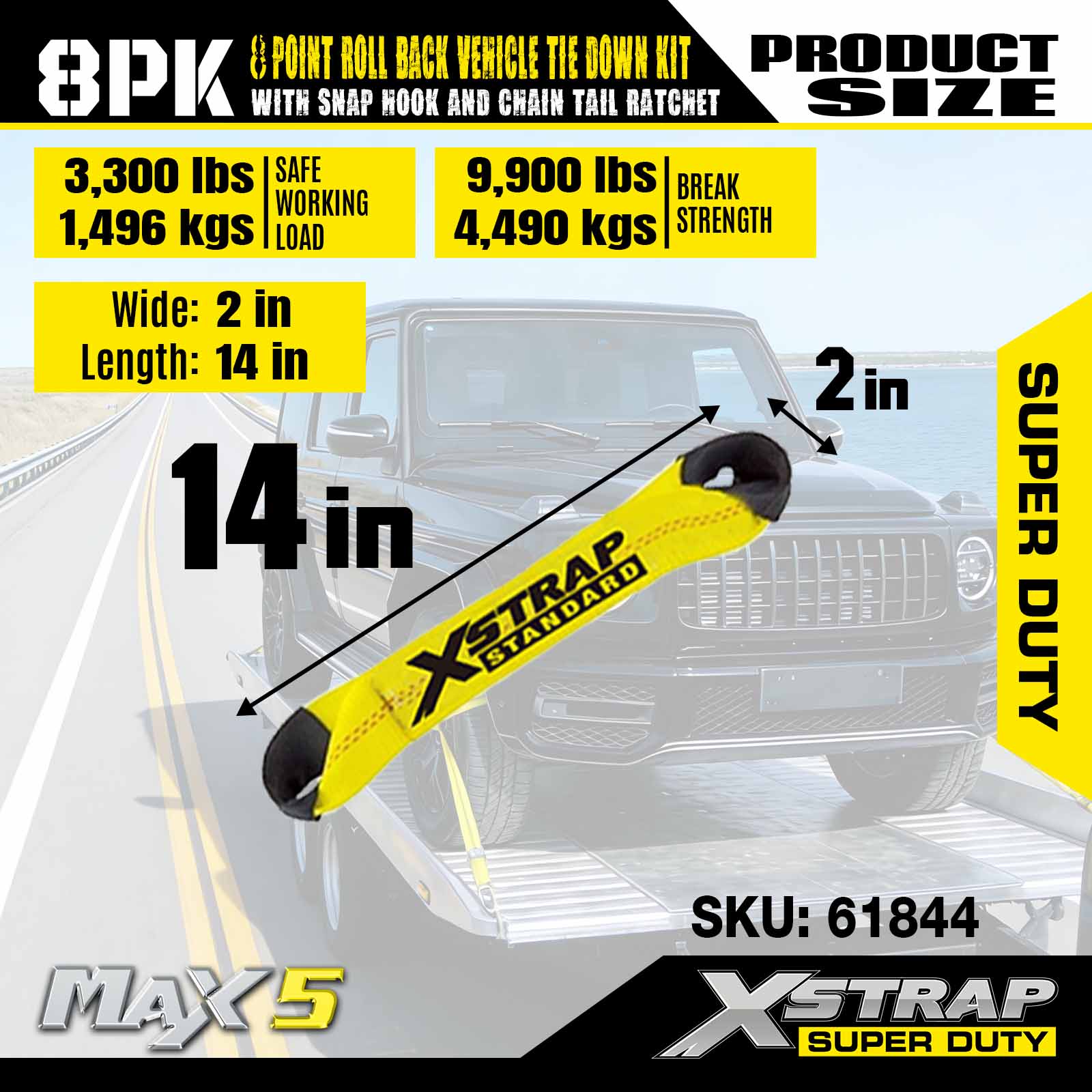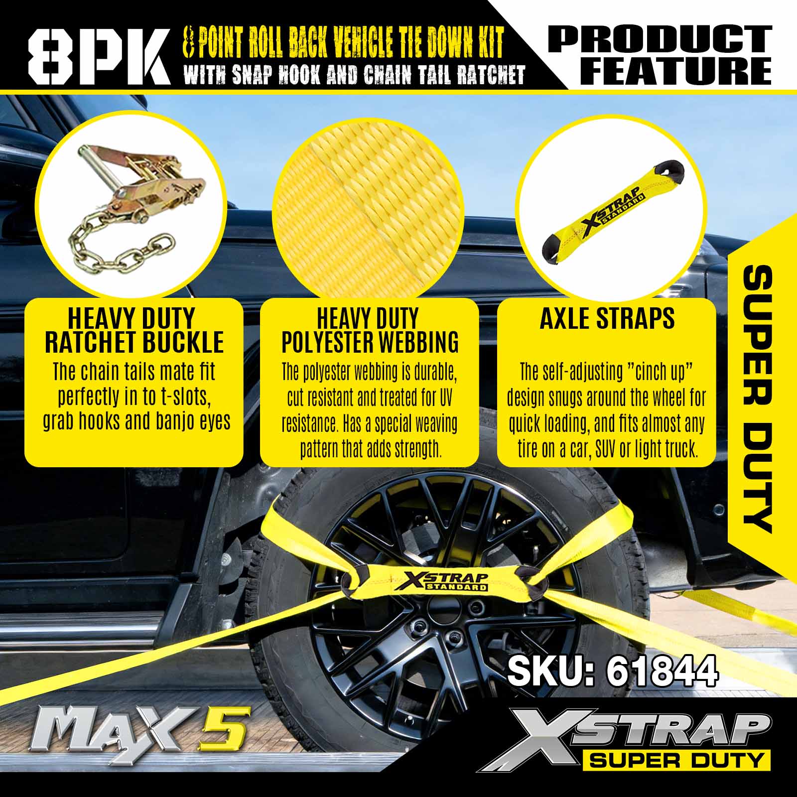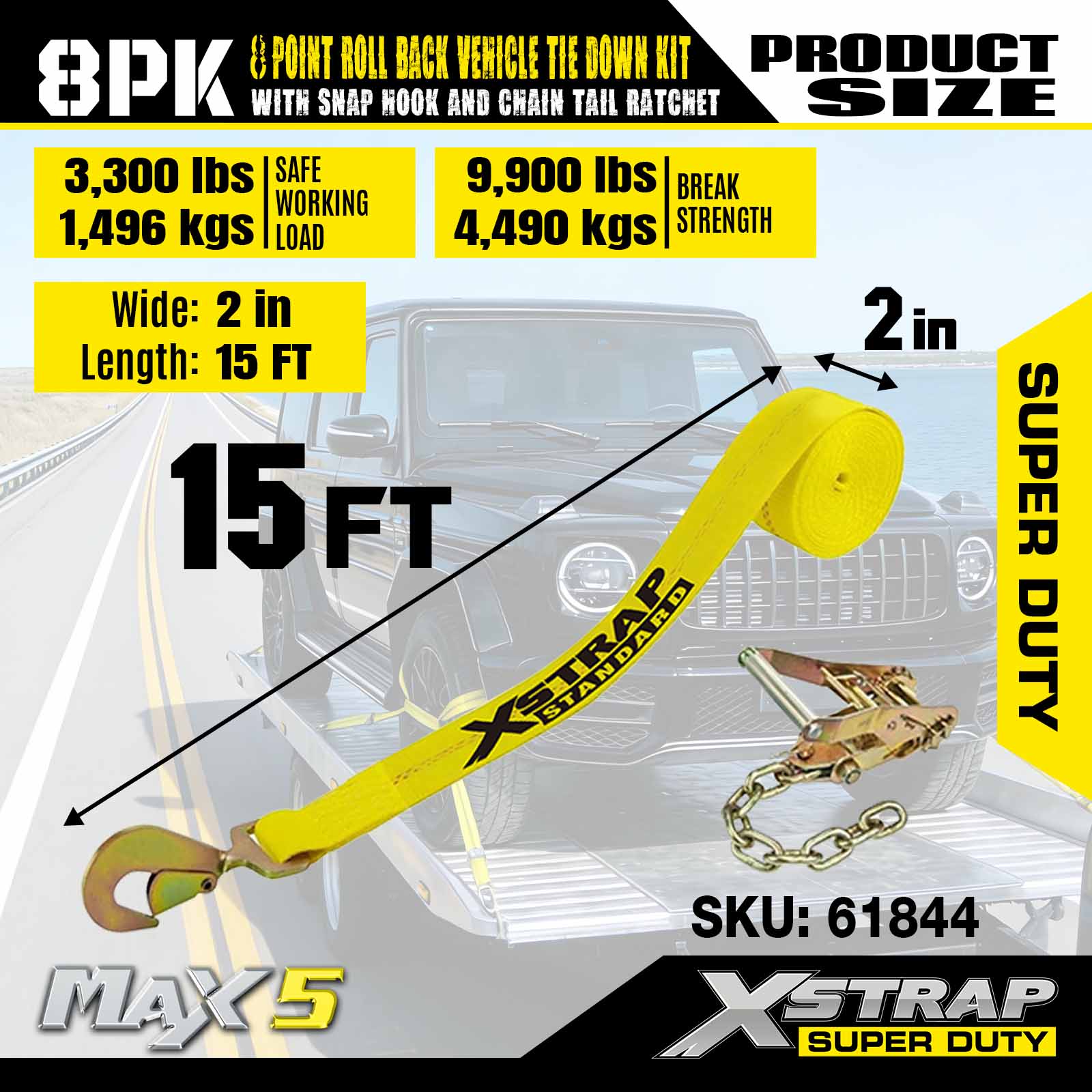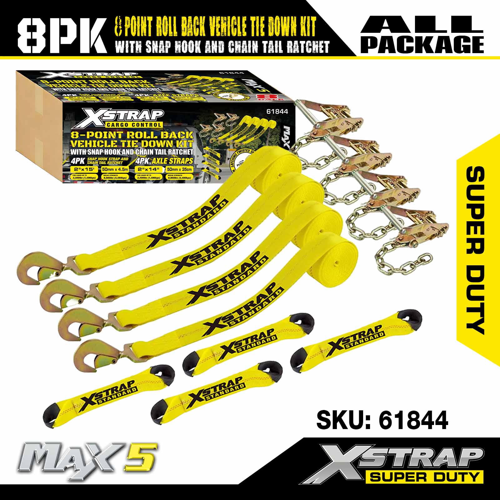 양쪽 끝에 스냅 후크와 체인 테일 래칫이 있는 Xstrap 8점 롤백 차량 타이다운 키트 - 4개 세트 - 클래식 노란색