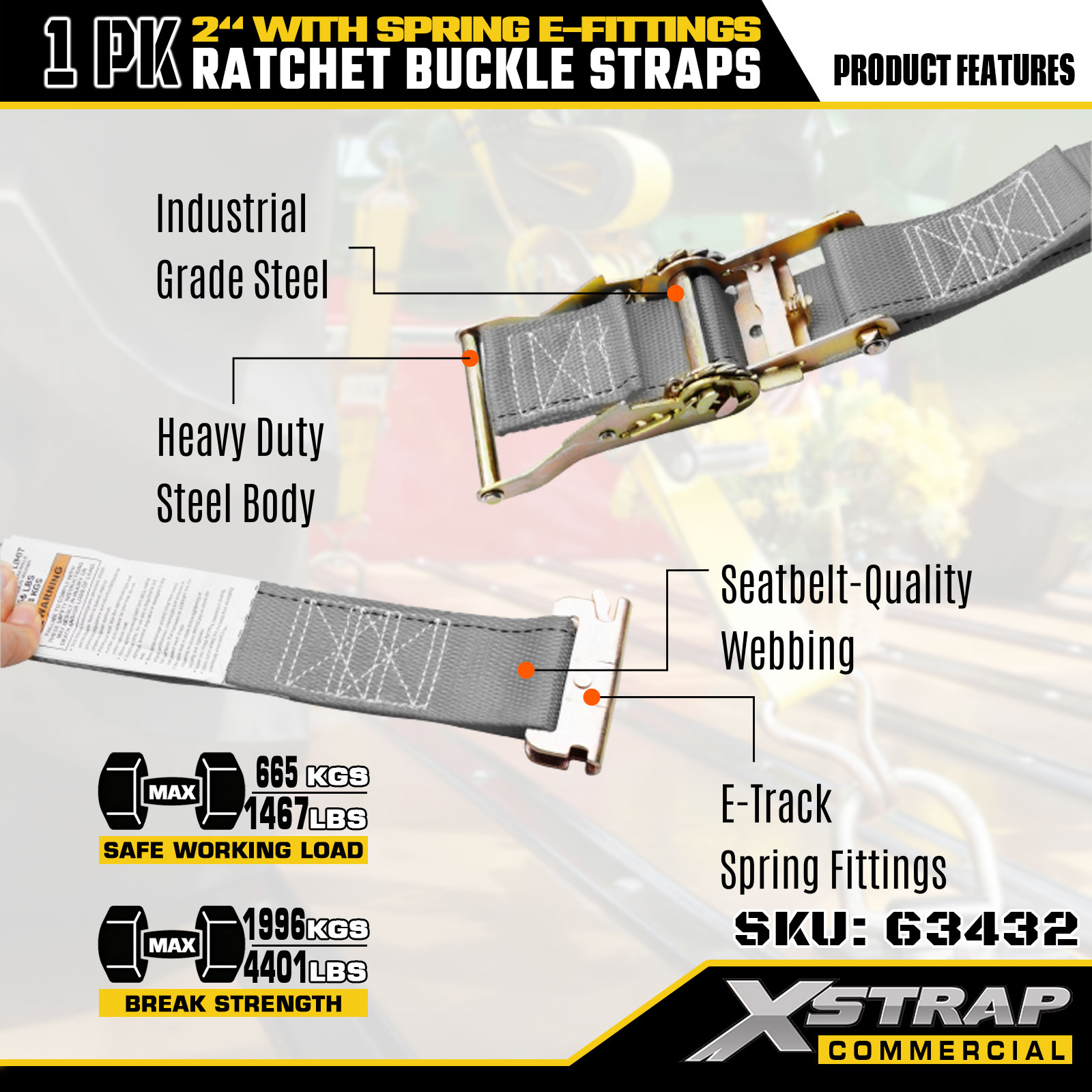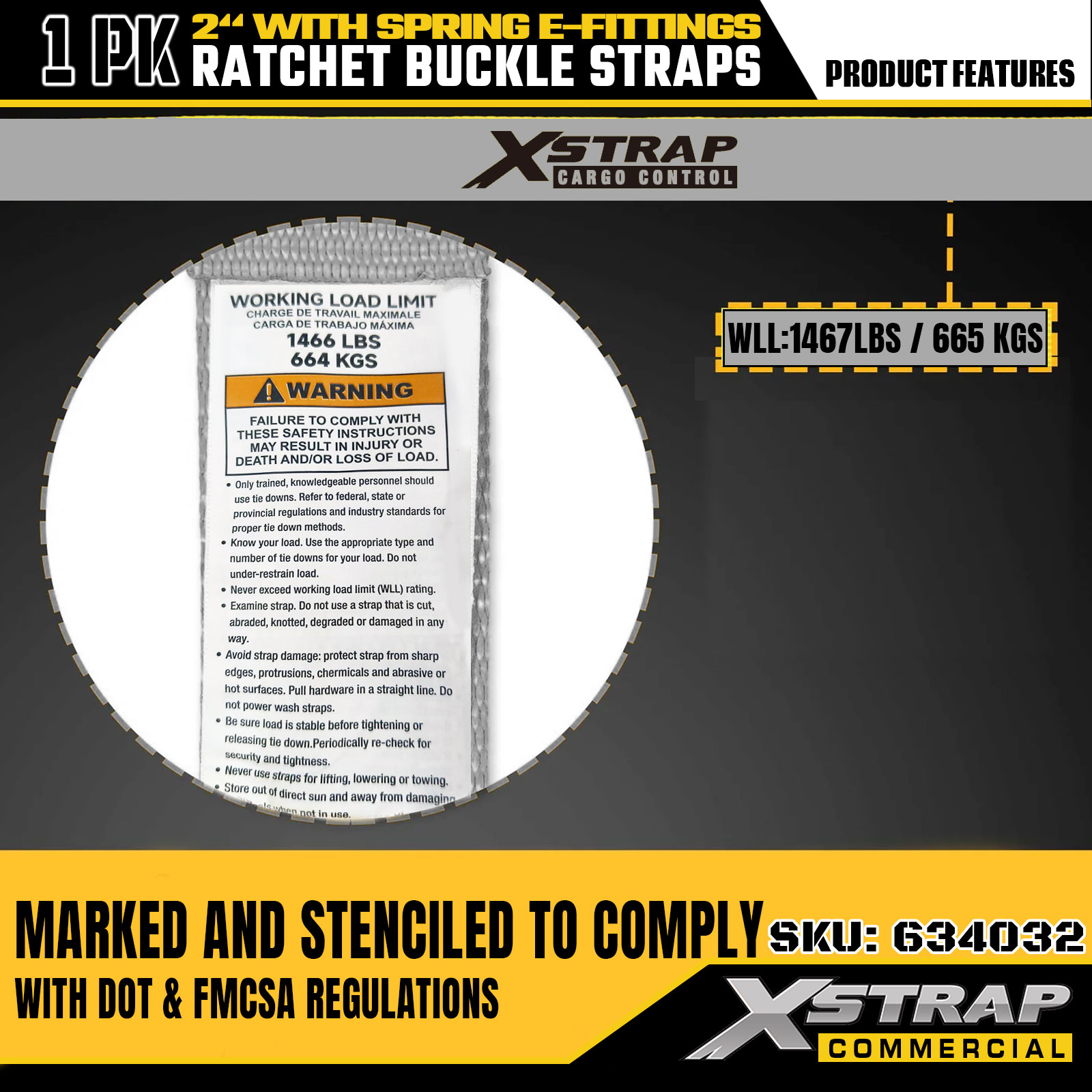 Xstrap 1팩 래칫 타이다운 스트랩, 2" x 16' 폴리에스테르 화물 고정 스트랩, 1467lbs 안전 작업 하중 및 4401lbs 파괴 강도, 트럭, 모어, ATV용 스프링 E-피팅 포함