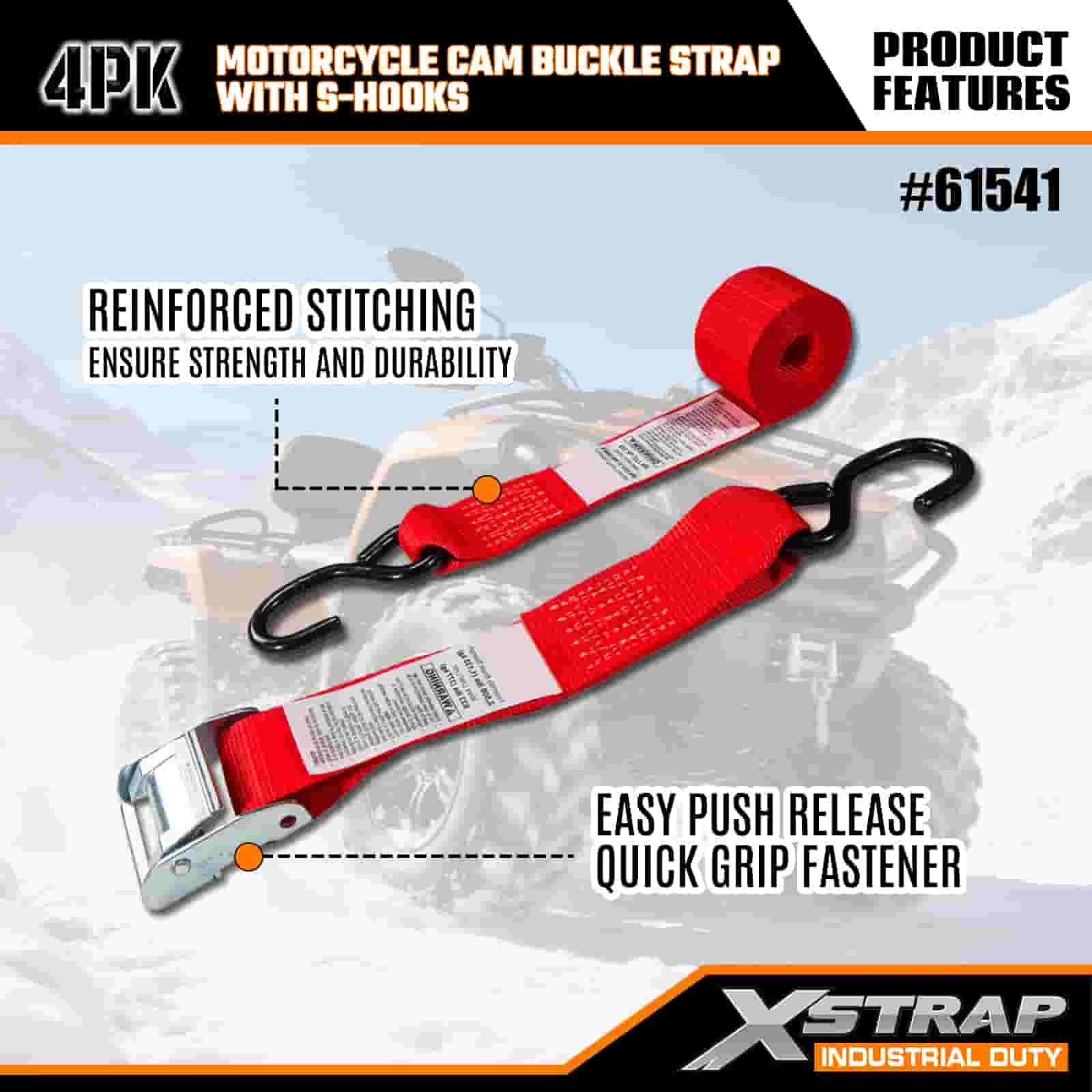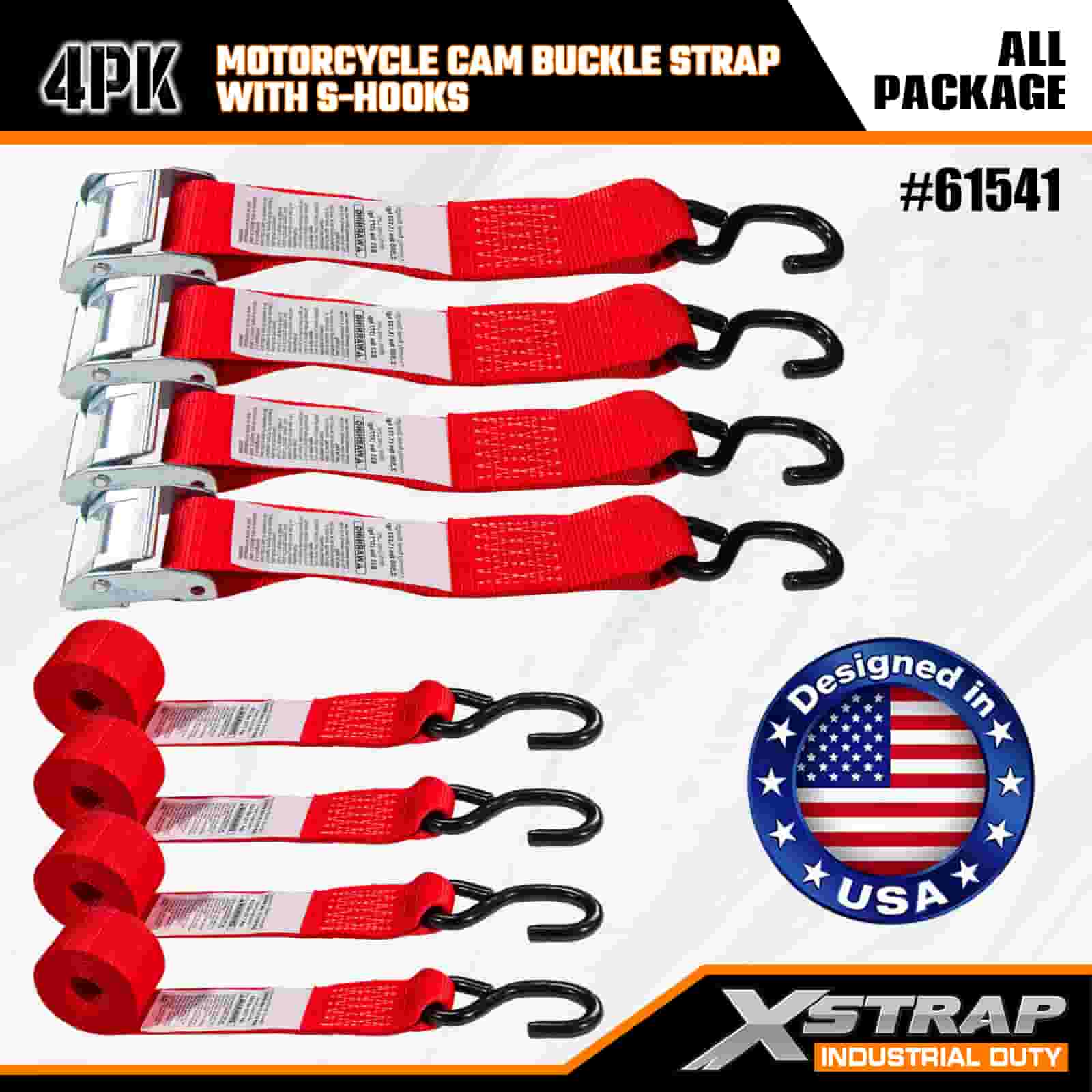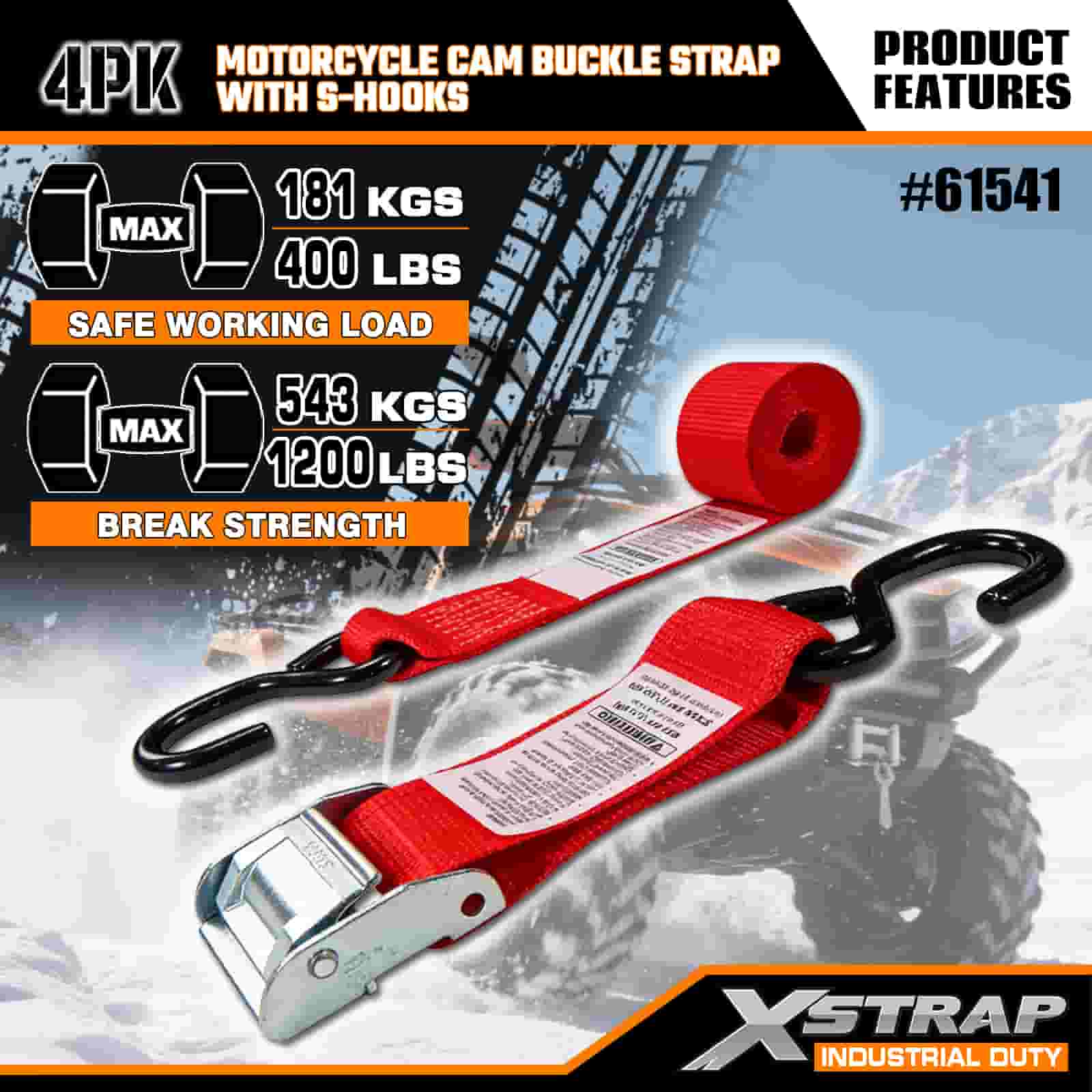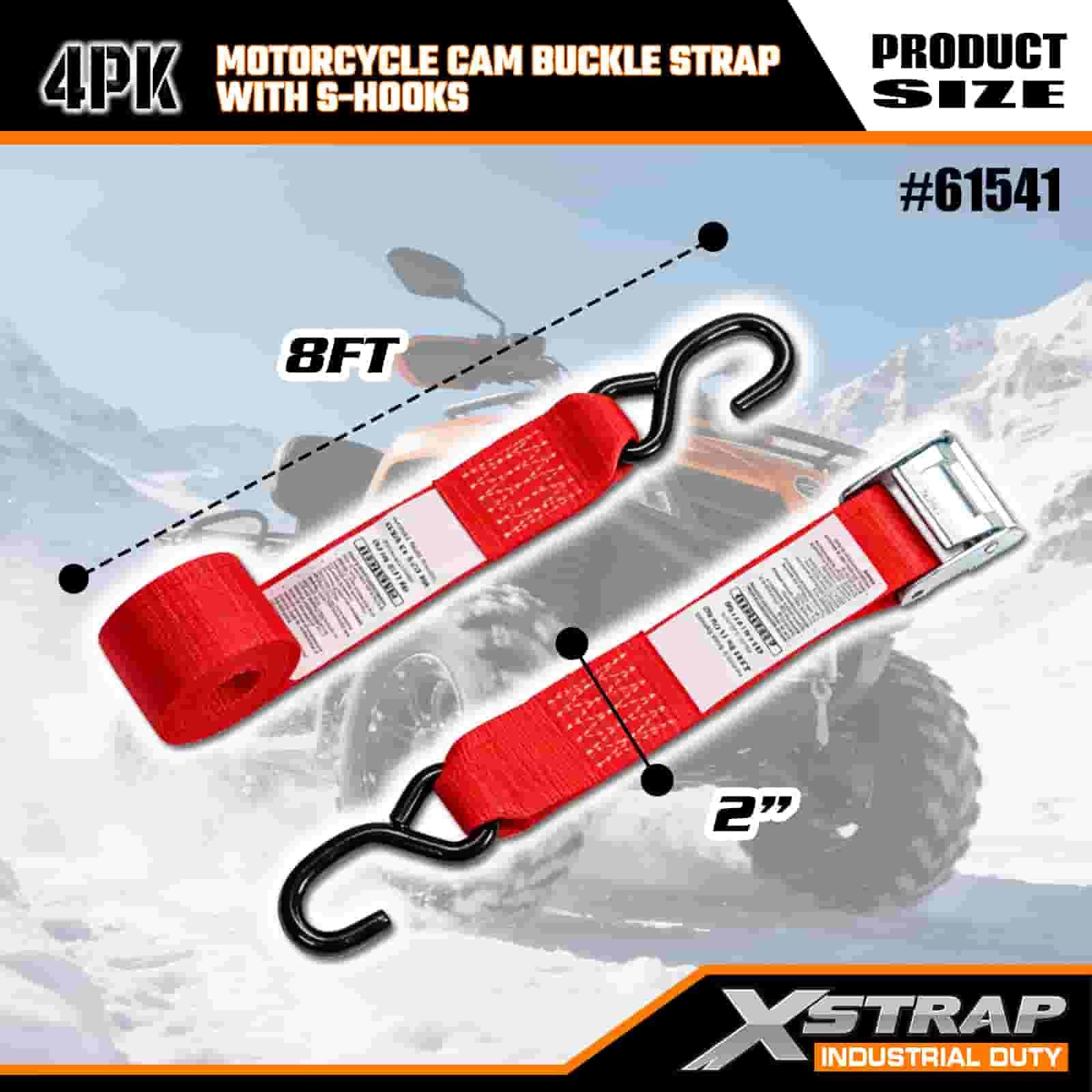 S 후크가 있는 Xstrap 4PK 오토바이 캠 버클 스트랩, 2인치 x 8' 폴리에스테르 타이다운 스트랩 풀 래칫 버클 스트랩, 화물 트레일러, 플랫 베드 트레일러, 스키 보트, 소형 자동차를 고정하는 진지한 전문가를 위한 S 후크가 있는 400lbs 용량 화물 래싱 고정 스트랩.