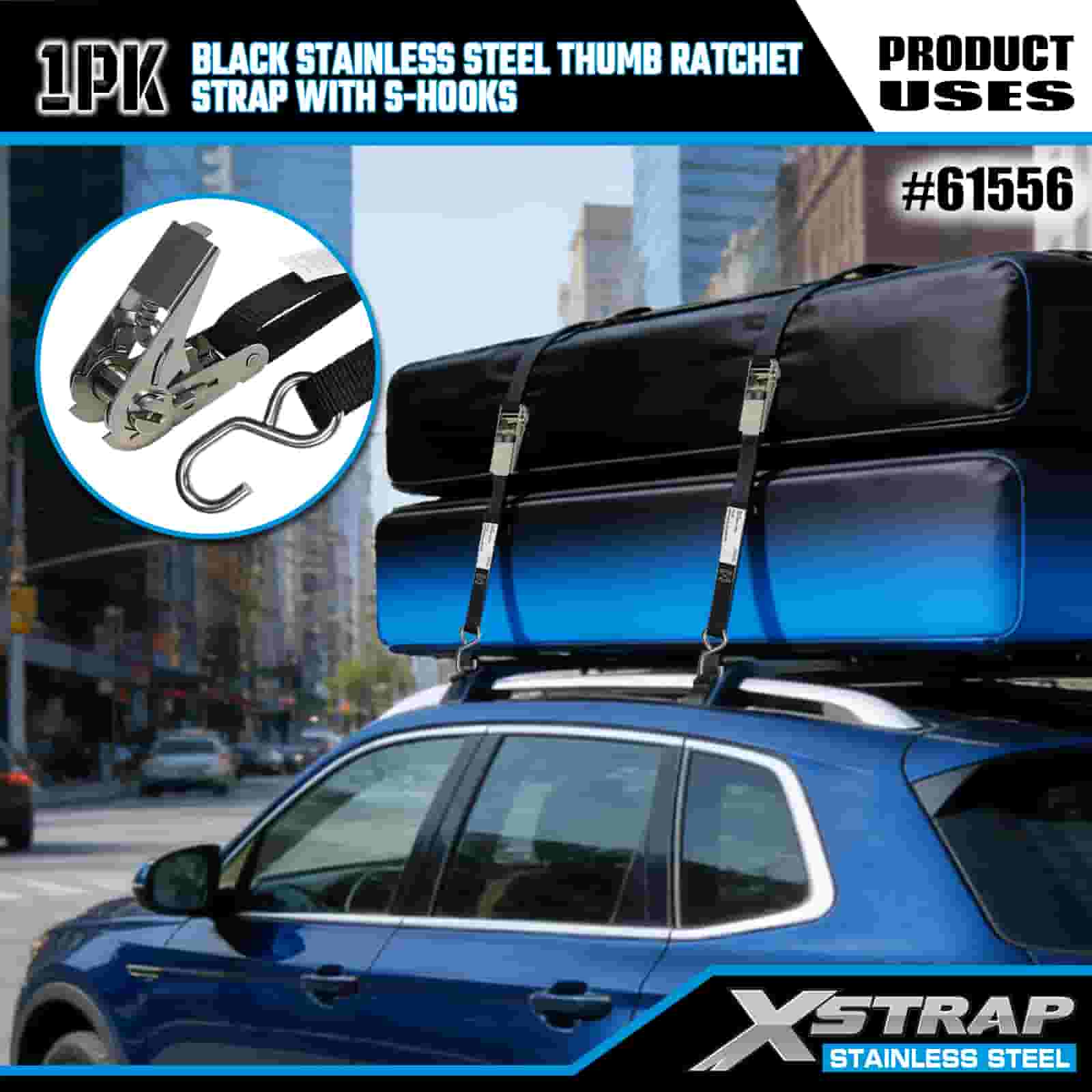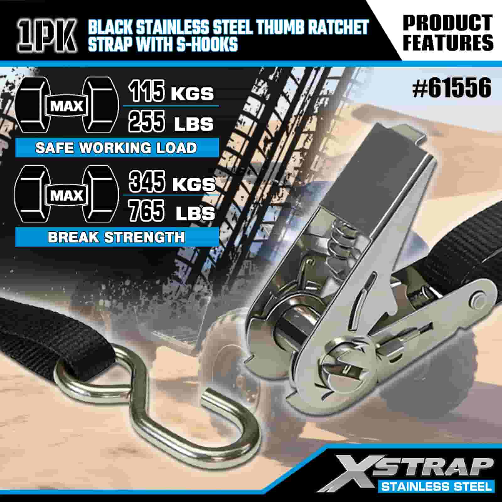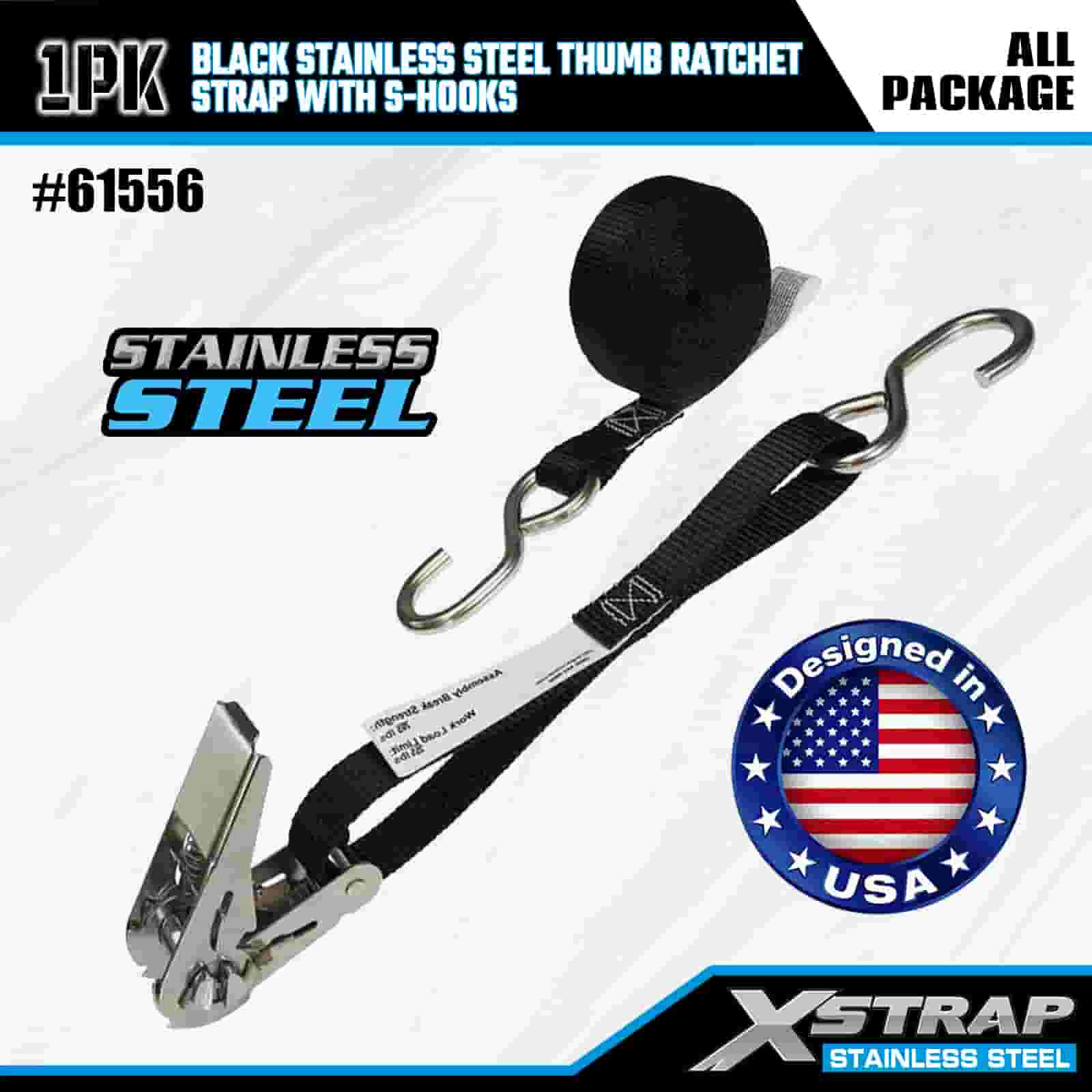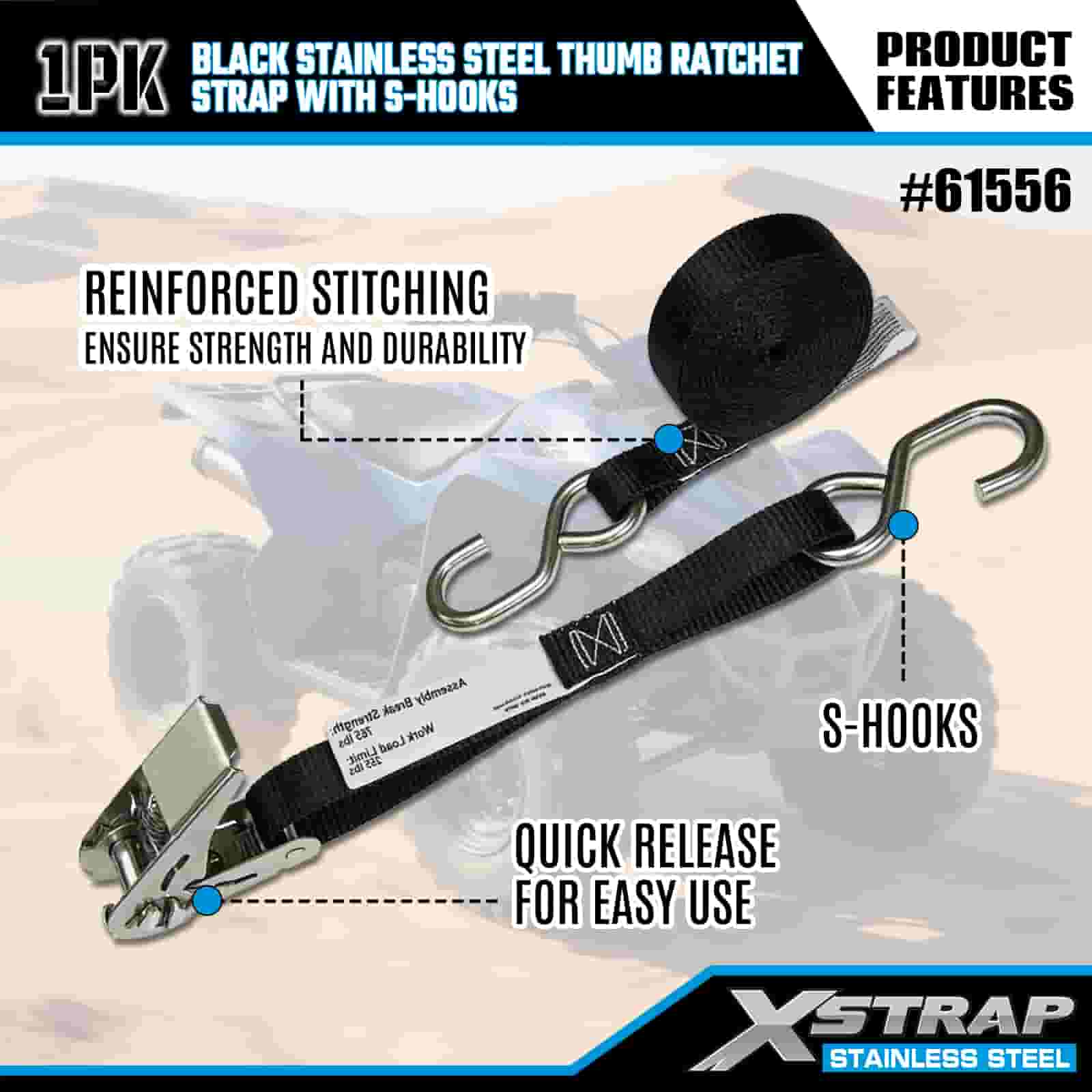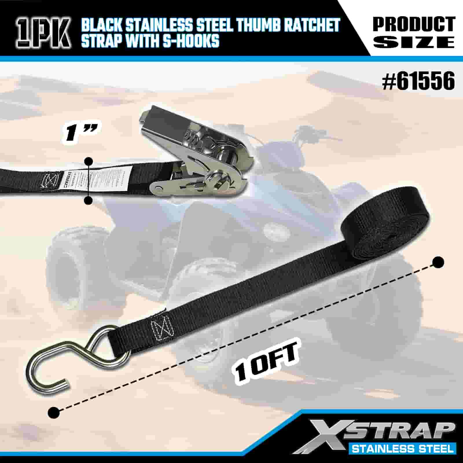 Xstrap S 후크가 있는 검정색 스테인레스 스틸 엄지 래칫, 1인치 x 10' 폴리에스테르 타이다운 스트랩 래칫 스트랩, 트레일러용 S 후크가 있는 255lbs 용량 화물 래싱 고정 스트랩, 플랫 베드 트레일러 스키 보트, 소형 자동차, 중장비.