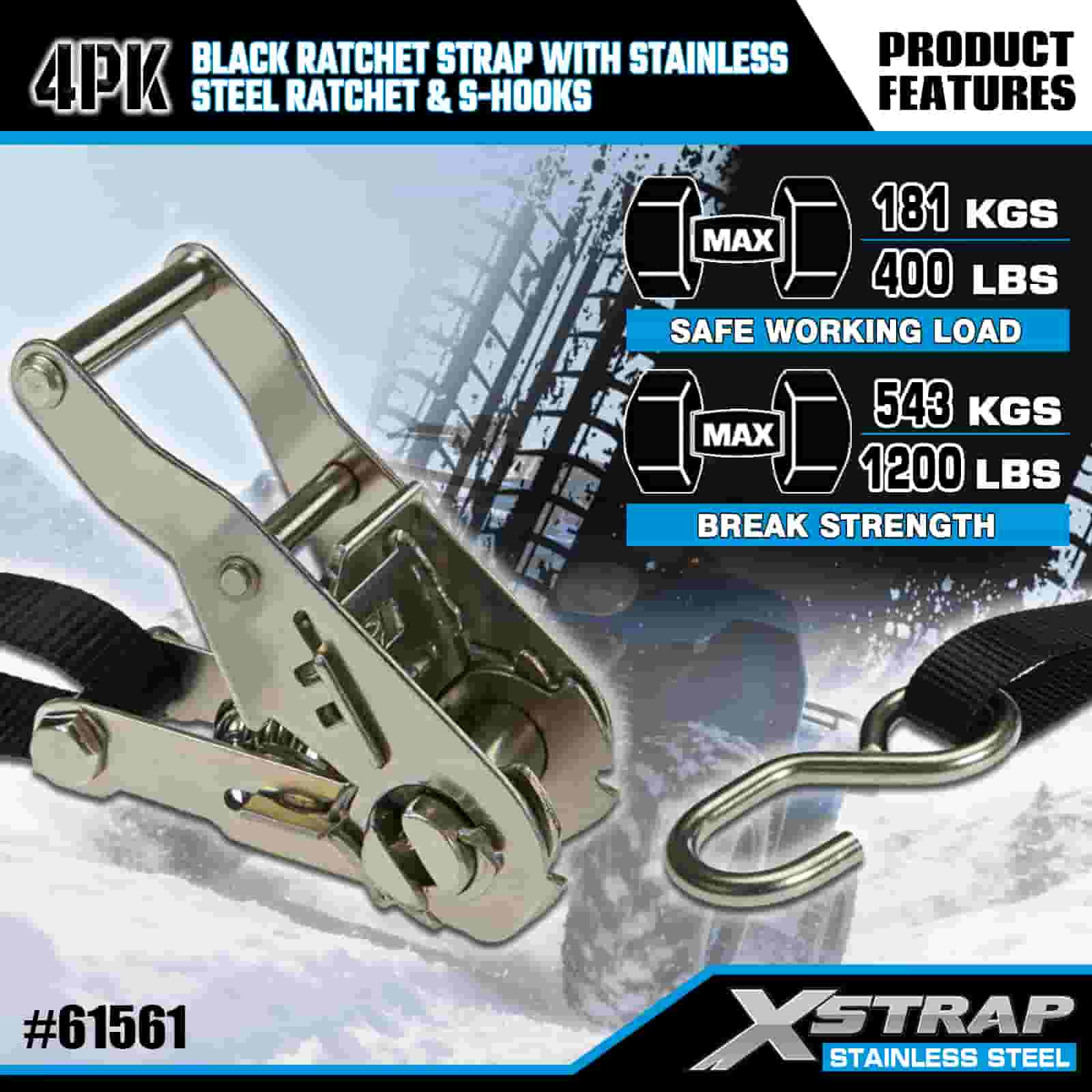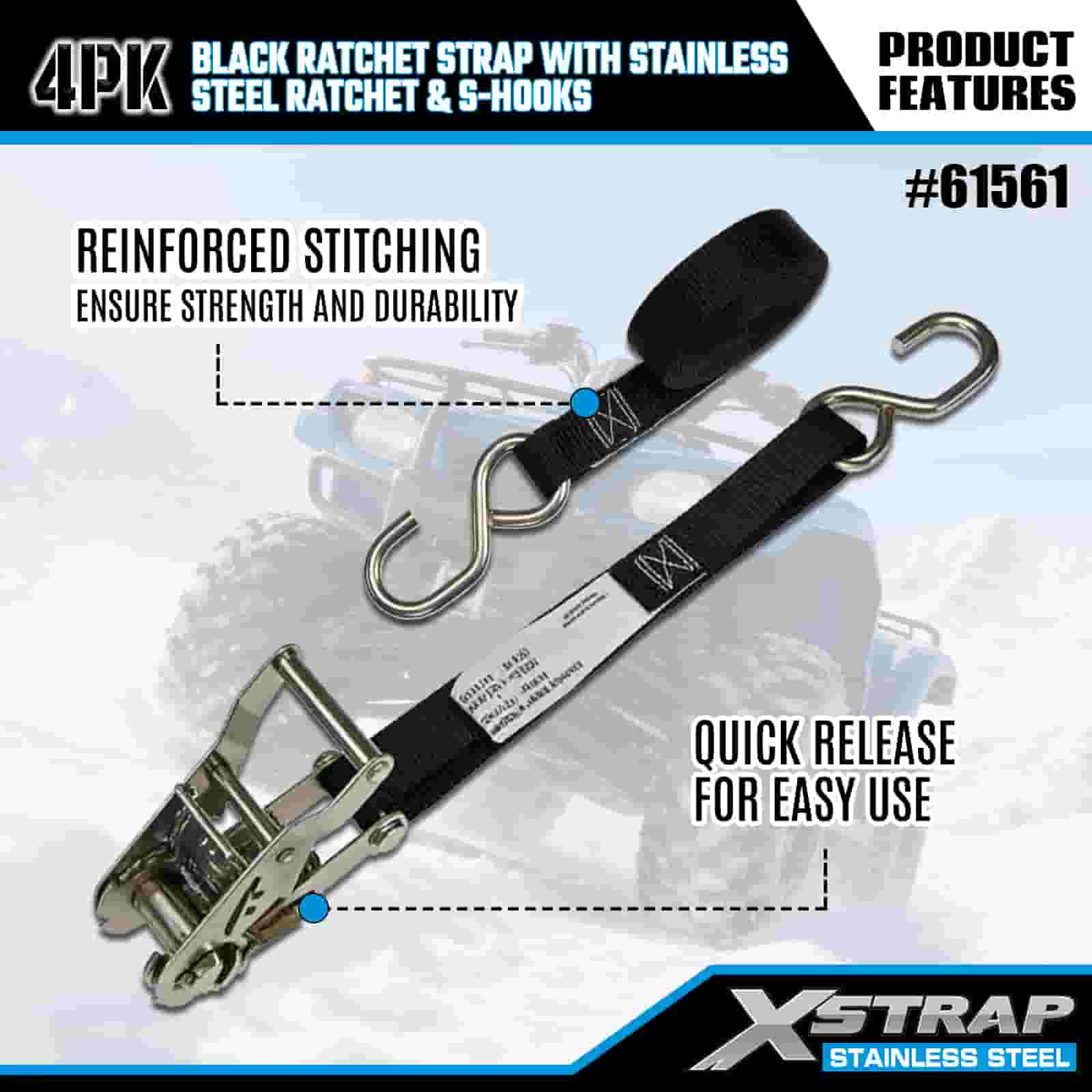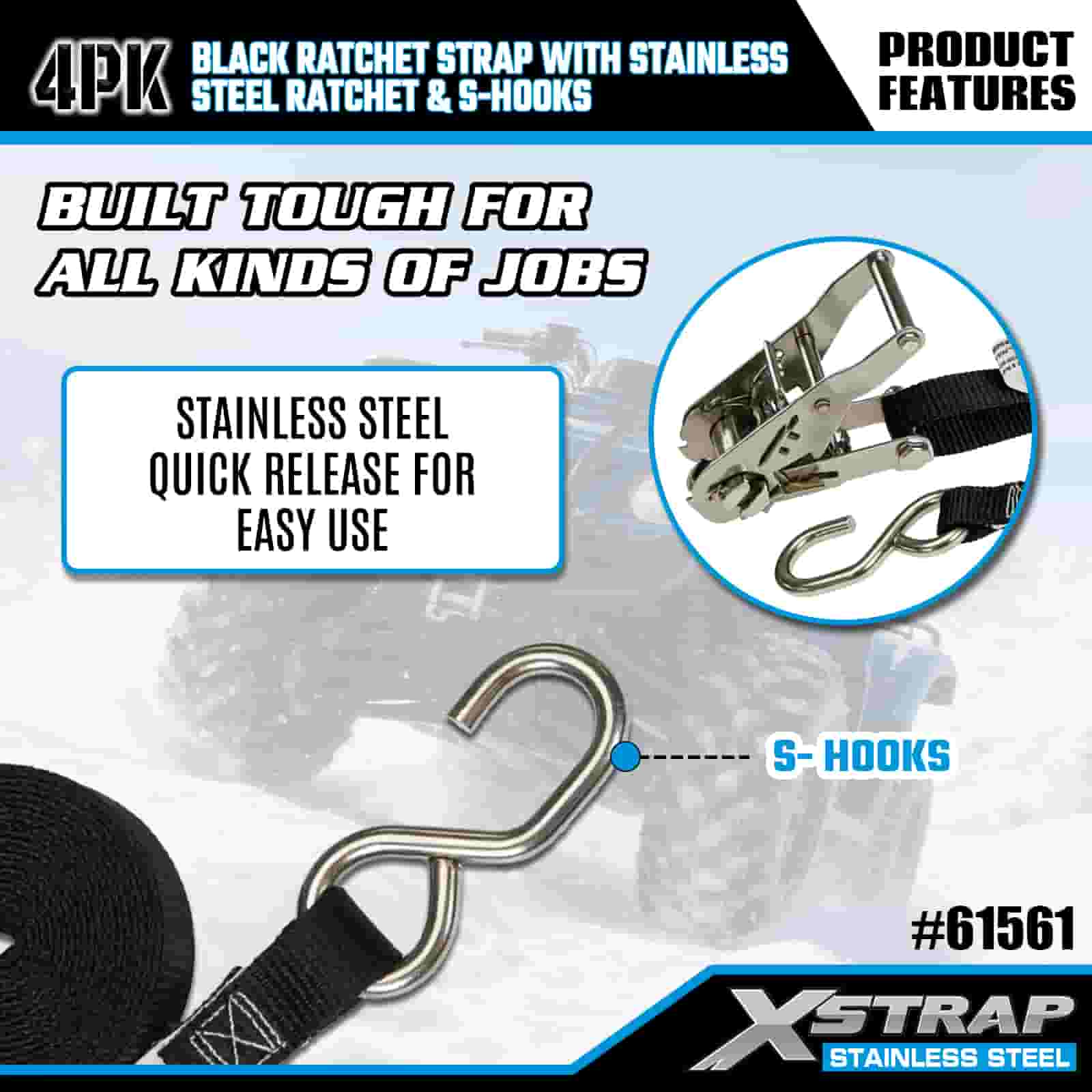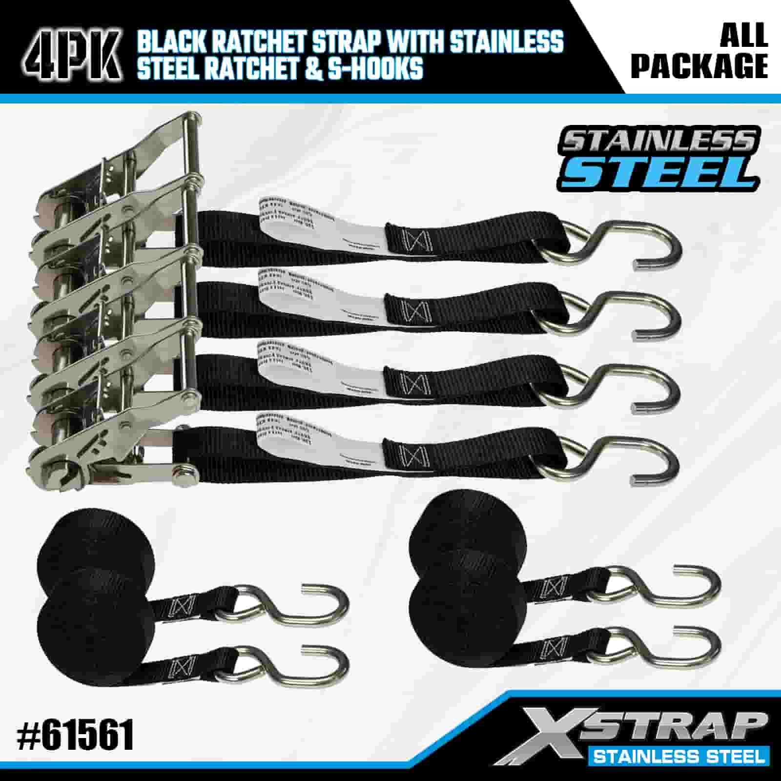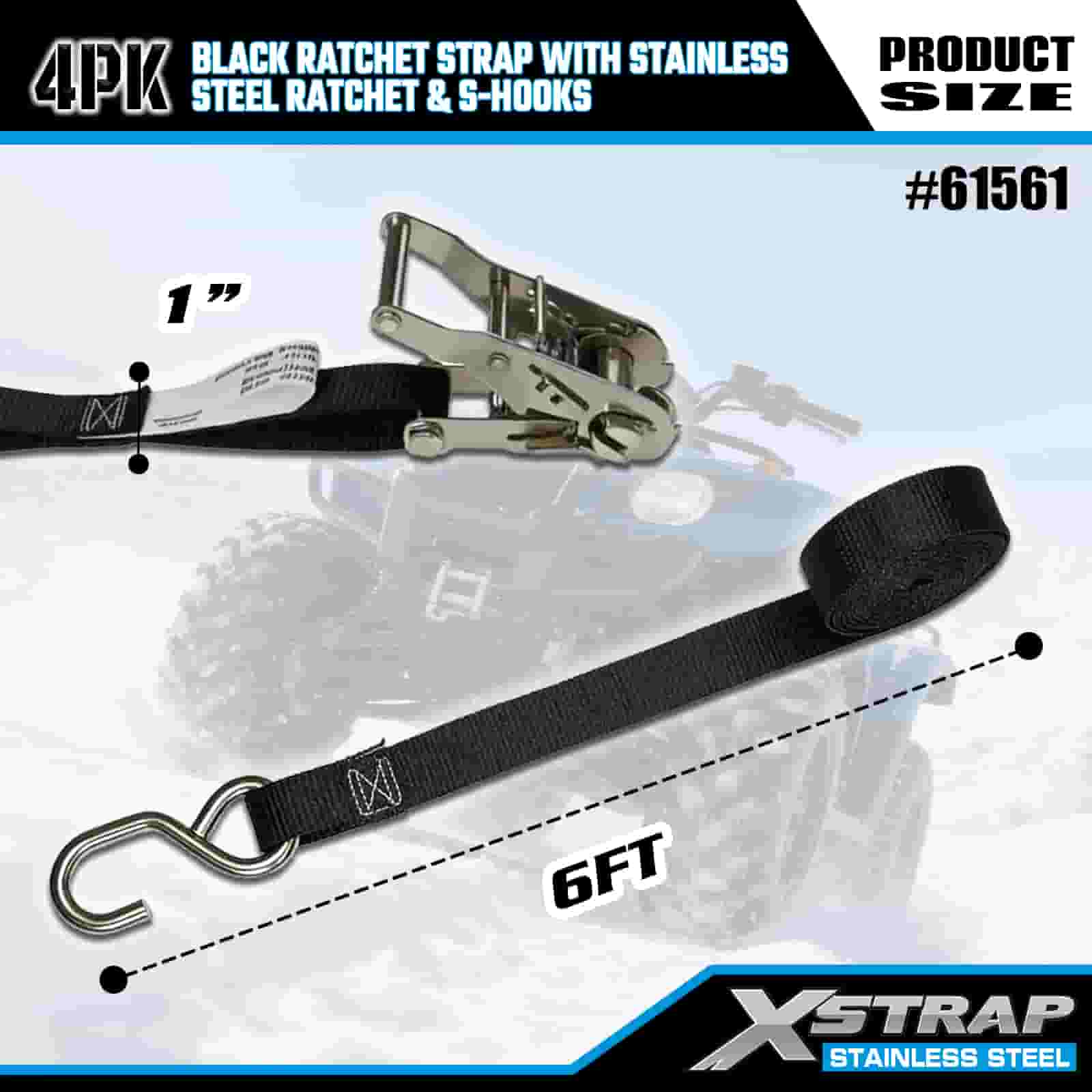 Xstrap 4PK 검정색 래칫 스트랩(스테인리스 스틸 래칫 및 S 후크 포함), 1인치 x 6' 폴리에스테르 타이다운 스트랩 래칫 스트랩, 트레일러용 S 후크 포함 400lbs 용량 화물 래싱 고정 스트랩, 플랫 베드 트레일러 스키 보트, 소형 자동차, 중장비.