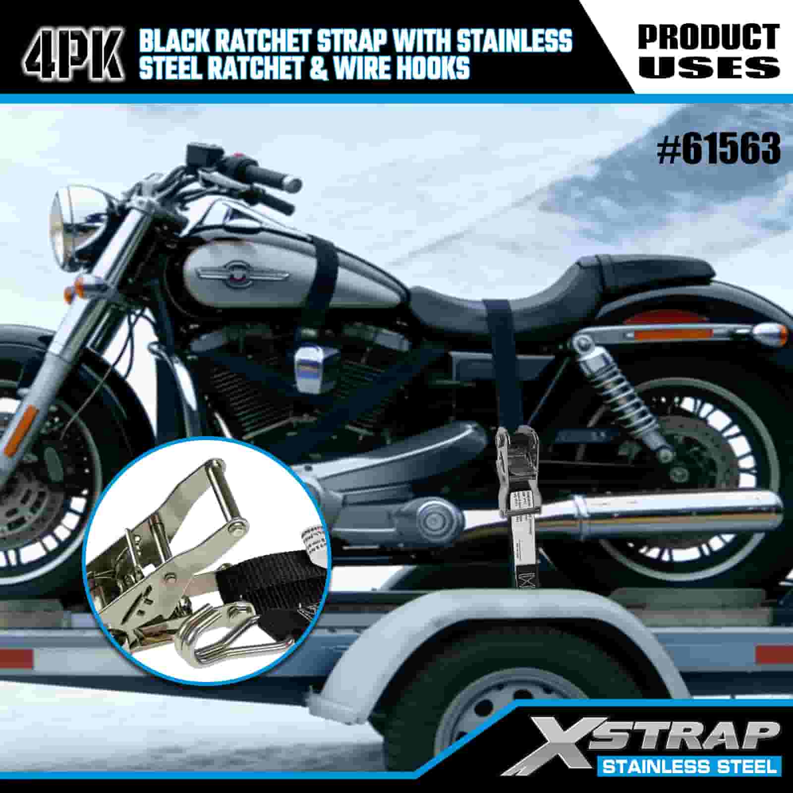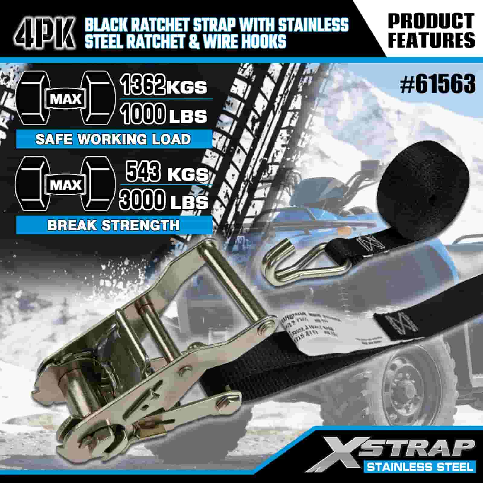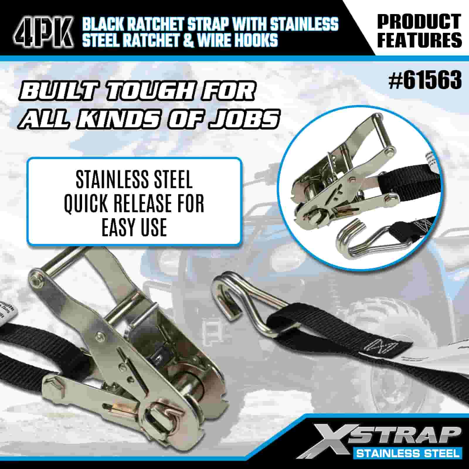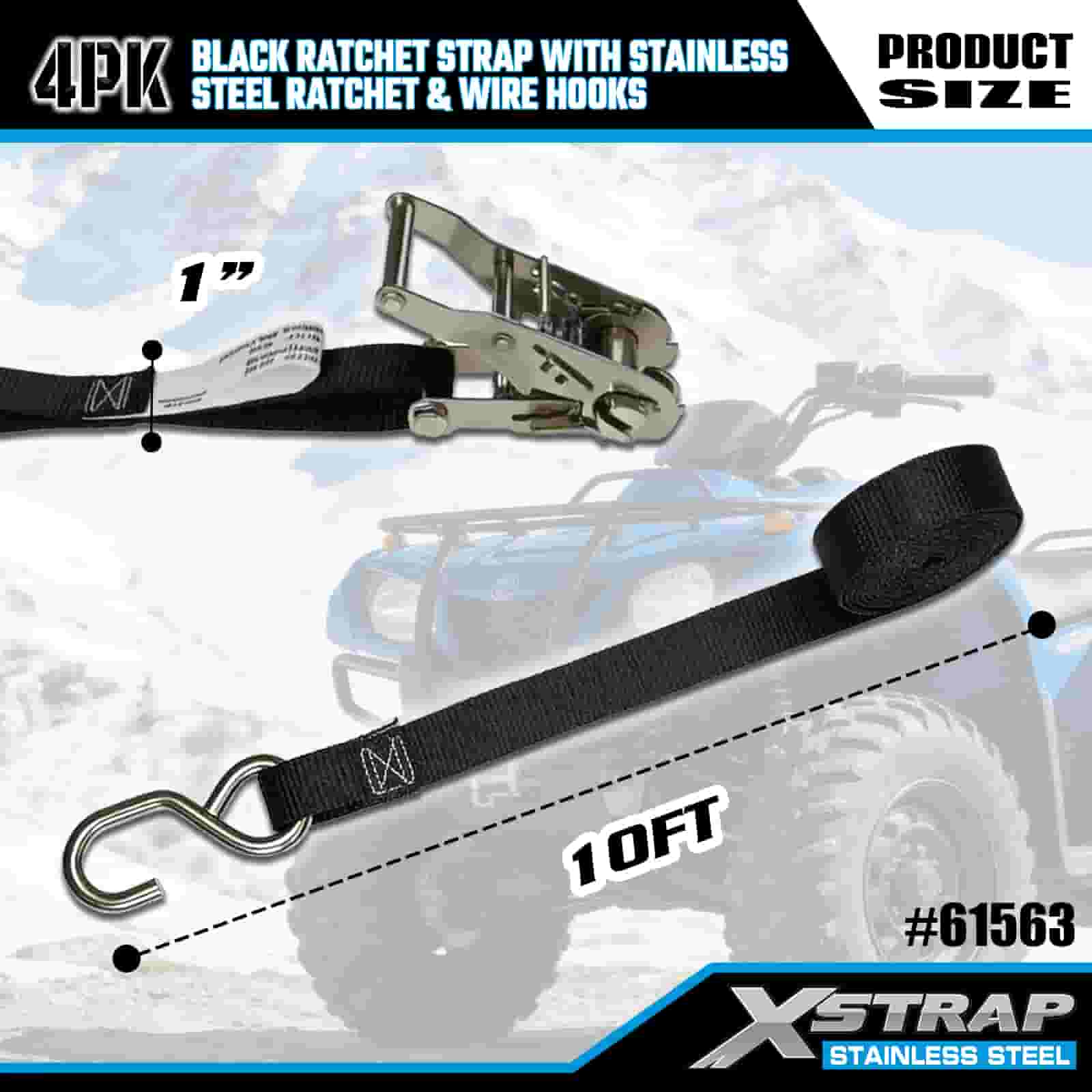 스테인레스 스틸 래칫 및 와이어 후크가 있는 Xstrap 4PK 검정색 래칫 스트랩, 1" x 10' 폴리에스테르 타이다운 스트랩 래칫 스트랩, 트레일러용 와이어 후크가 있는 1000lbs 용량 화물 래싱 고정 스트랩, 플랫 베드 트레일러 스키 보트, 소형 자동차, 중장비.