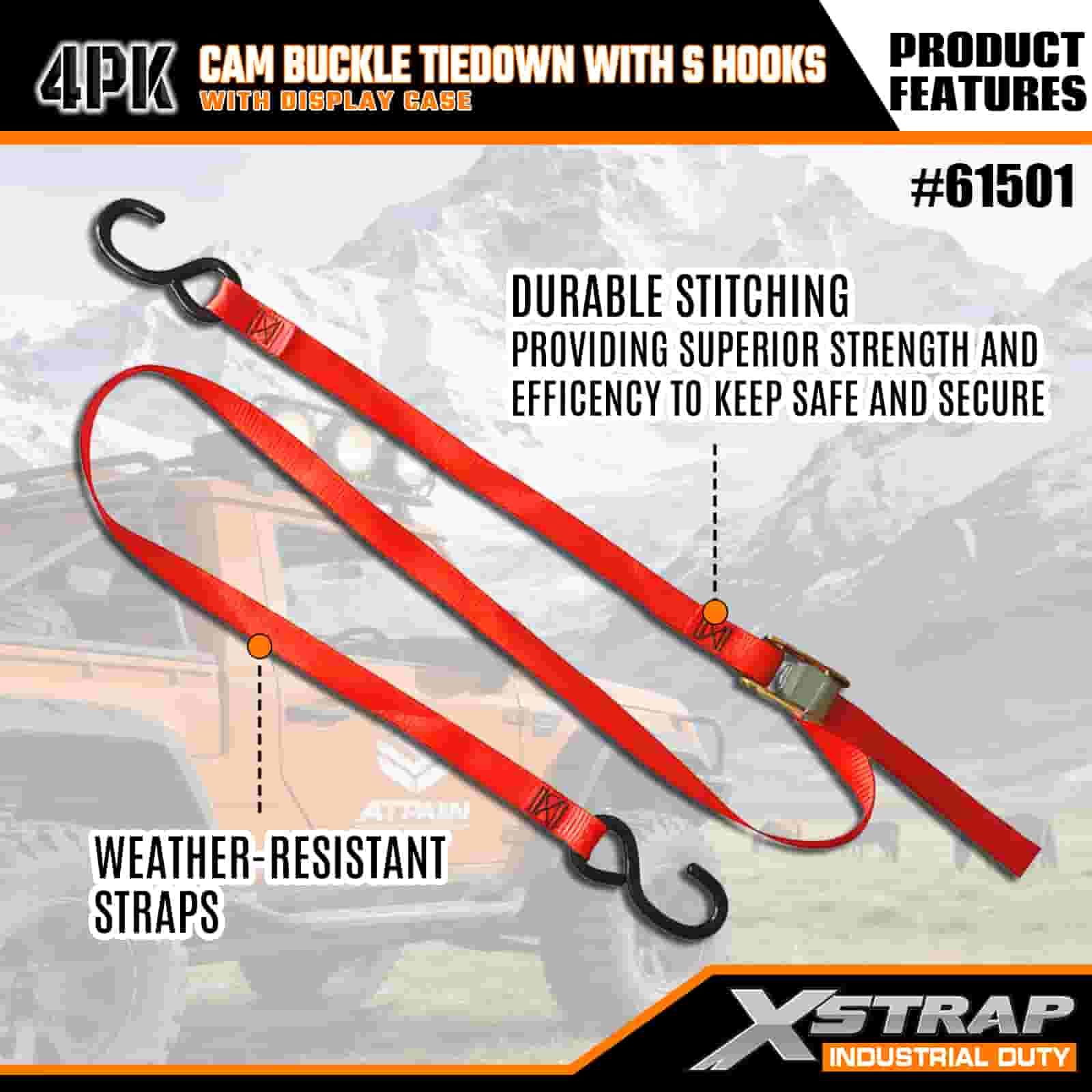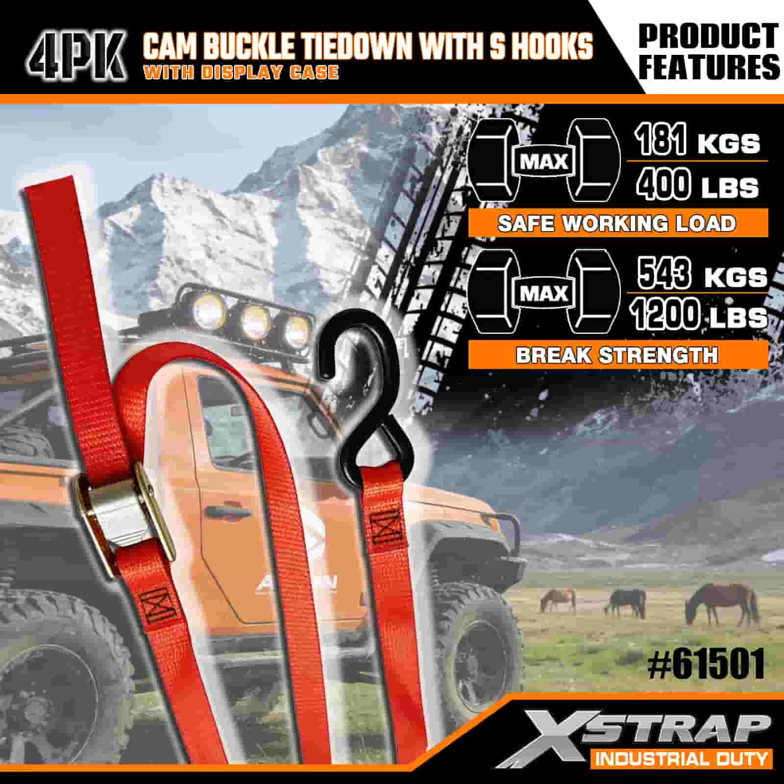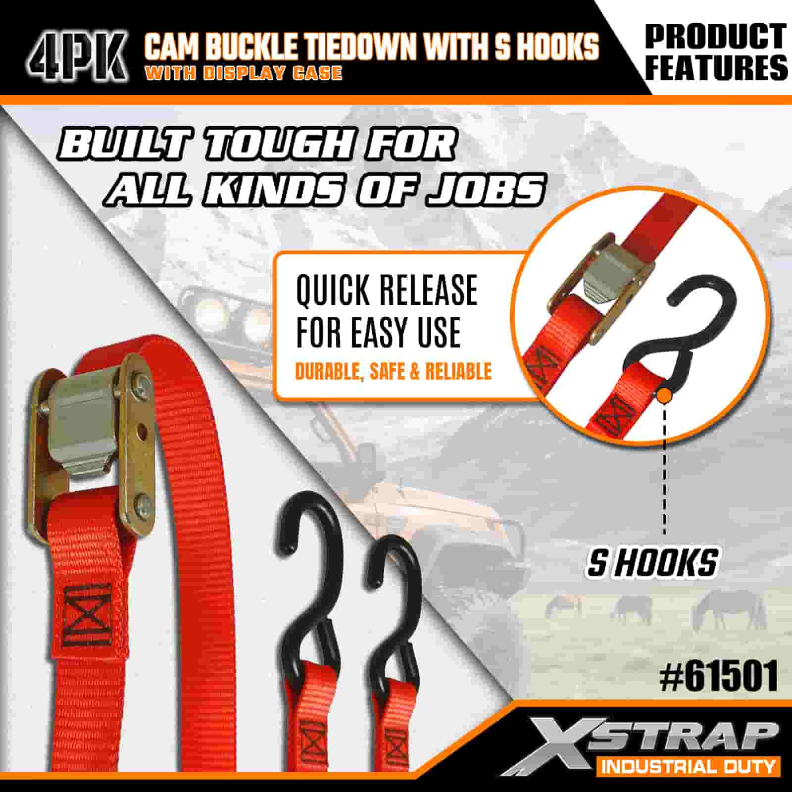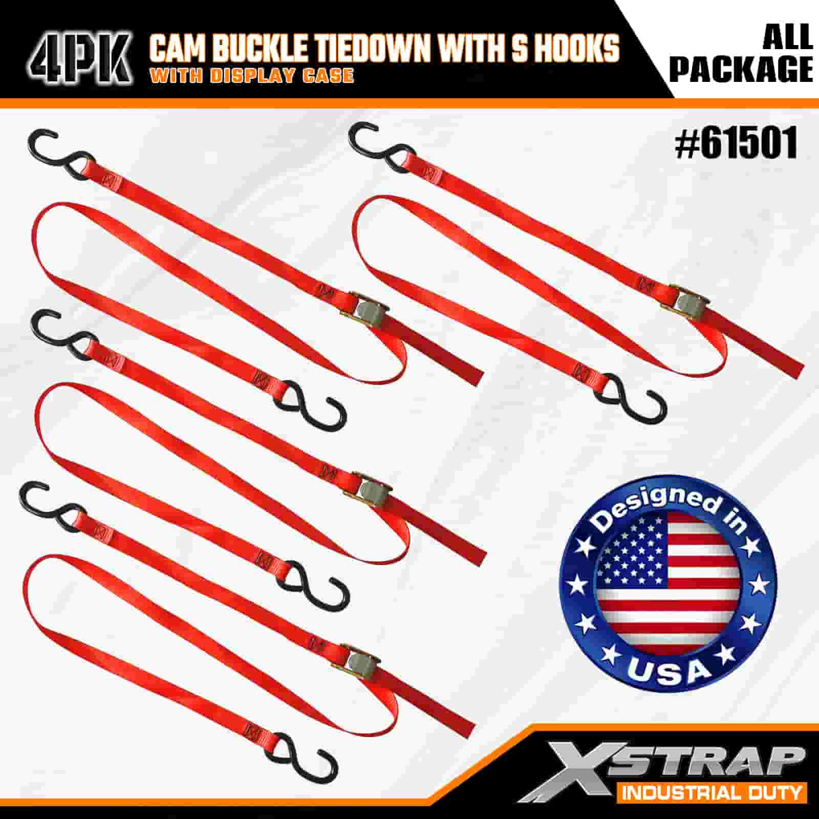 S 후크가 있는 Xstrap 4 팩 캠 버클 타이다운, 캠 버클이 있는 2" x 6' 폴리에스테르 타이다운 스트랩, S 후크가 있는 400lbs 용량 화물 래싱 고정 스트랩, 전문적인 화물 트레일러, 플랫 베드 트레일러, 스키 보트, 소형 자동차를 보호하기 위한 S 후크 포함.