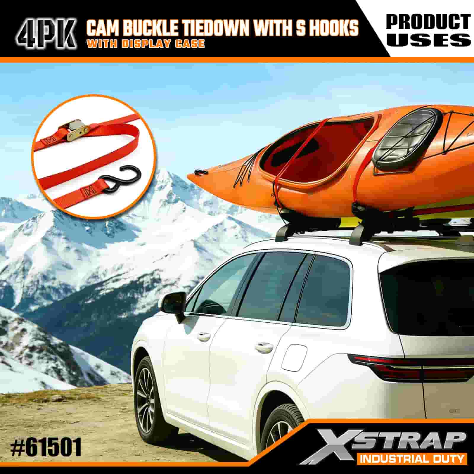 - 디스플레이 케이스가 포함된 실용적인 4팩: 일괄 사용을 위해 4개 세트(디스플레이 포장 포함)로 판매되며, 각 스트랩의 크기는 폭 2인치 × 길이 6피트로 카약, 아웃도어 장비 또는 화물과 같은 품목을 고정하는 데 이상적입니다.