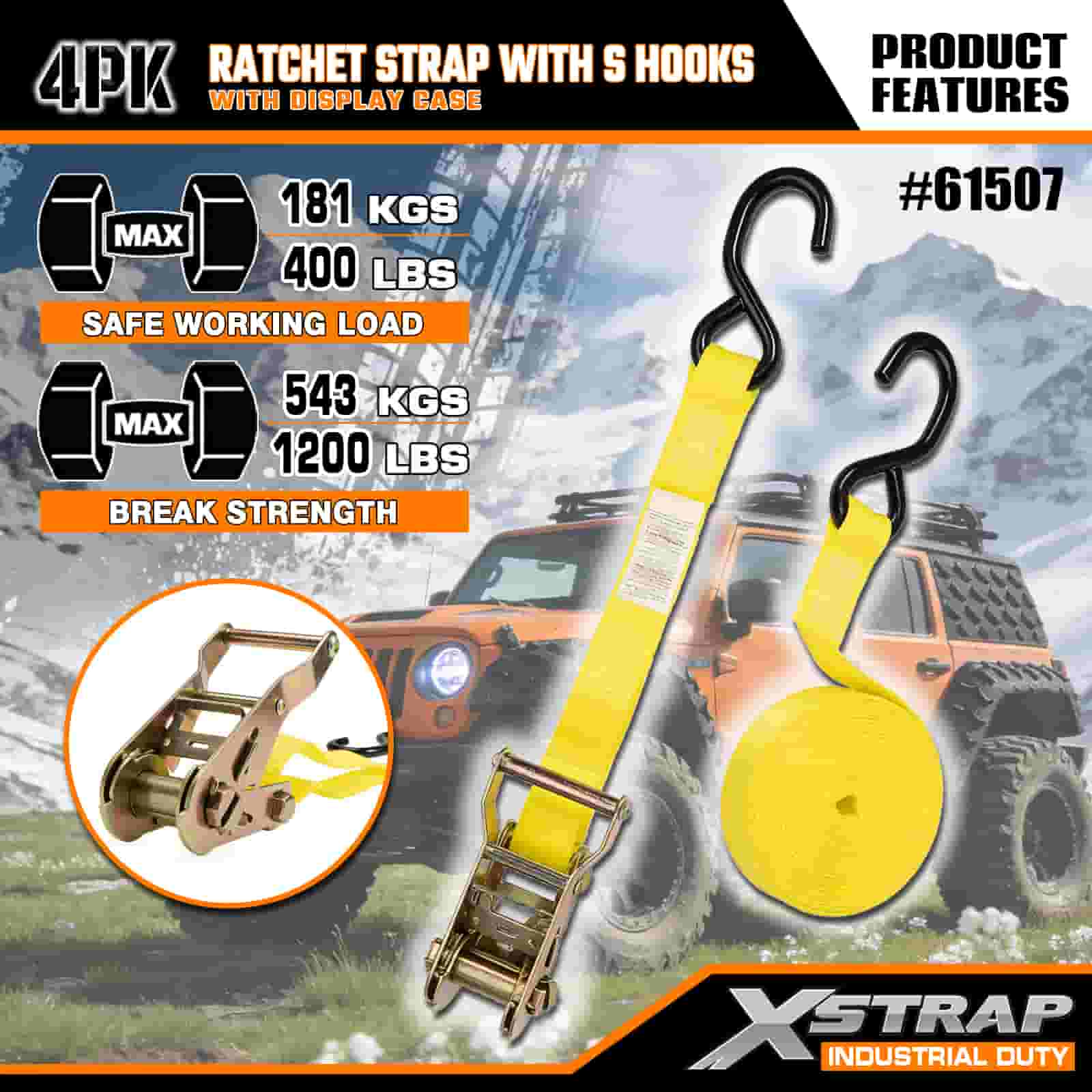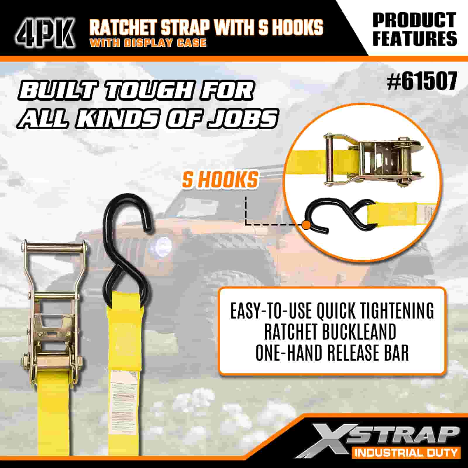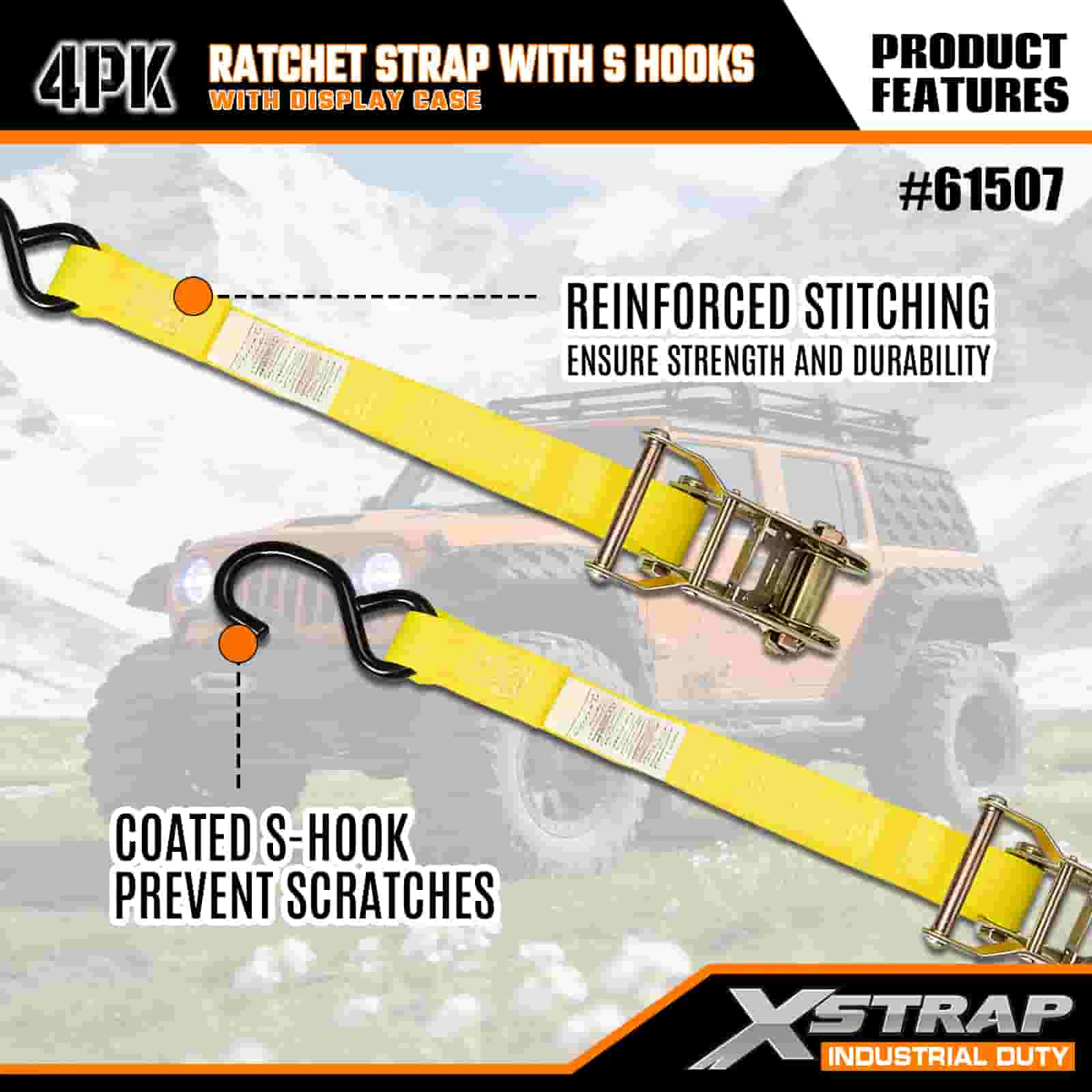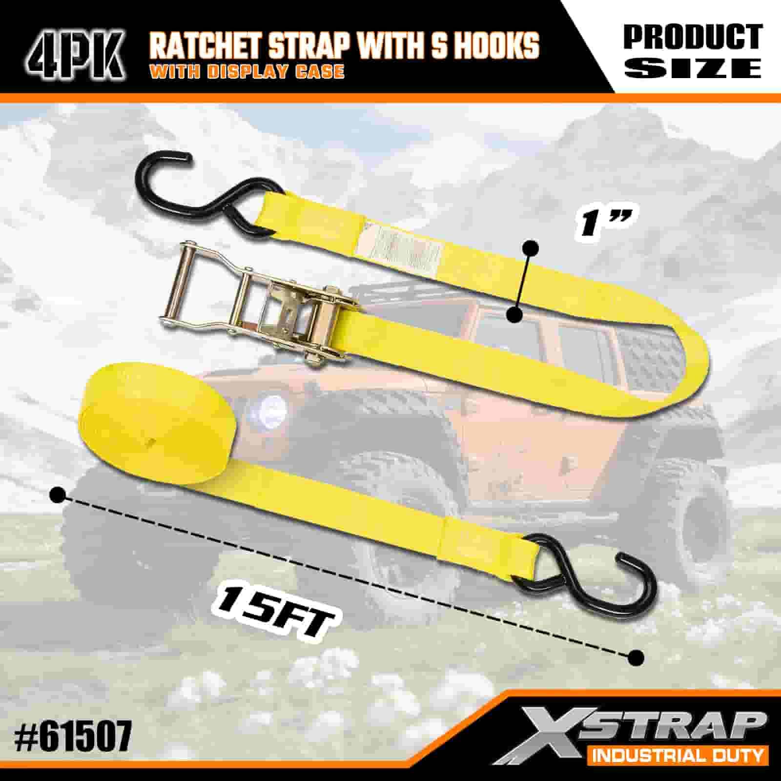 S 후크가 있는 Xstrap 4 팩 래칫 스트랩, 1" x 15' 폴리에스테르 타이다운 스트랩 당김 래칫 스트랩, S 후크가 있는 400lbs 용량 화물 래싱 고정 스트랩, 화물 트레일러, 플랫 베드 트레일러, 스키 보트, 소형 자동차를 고정하는 진지한 전문가용 S 후크 포함.