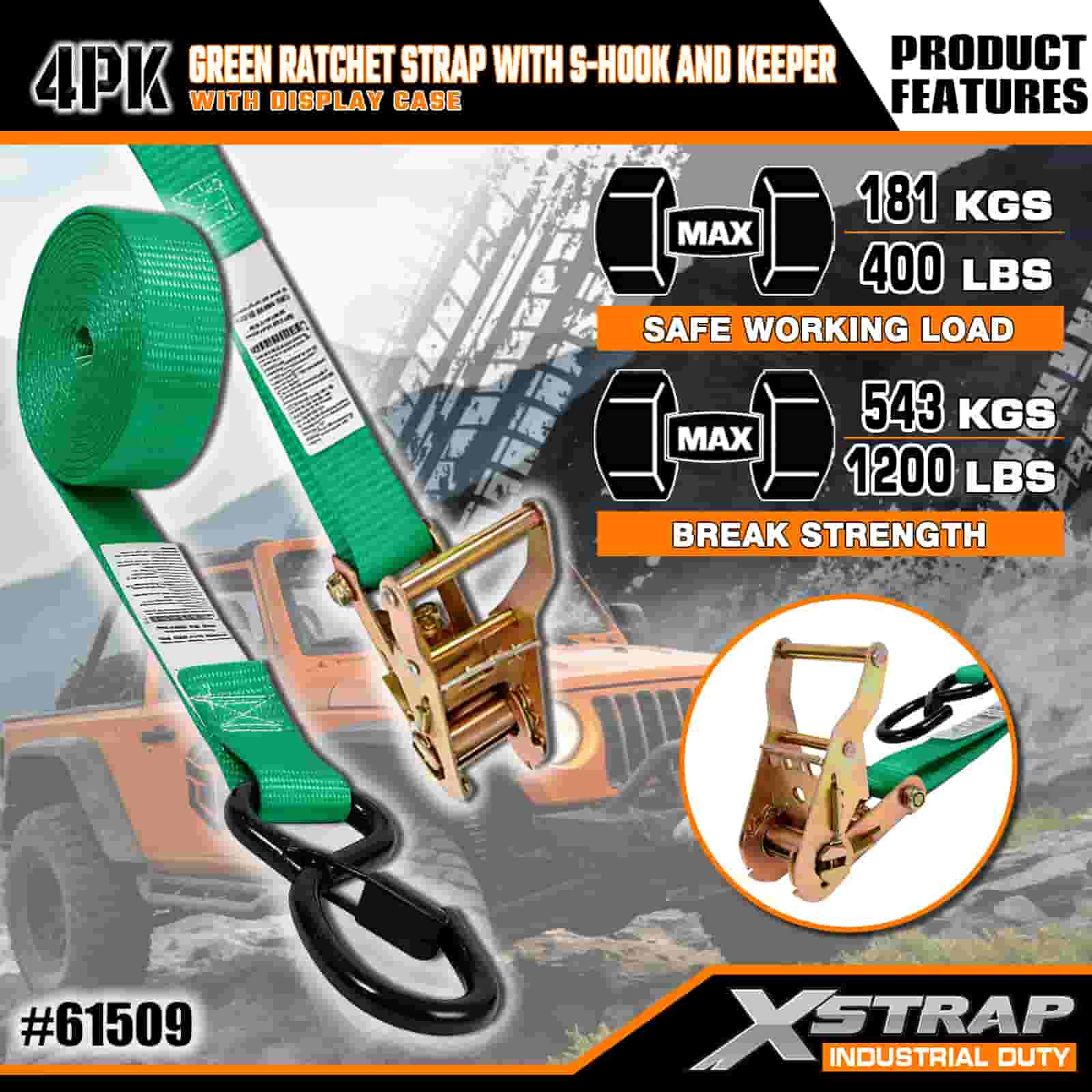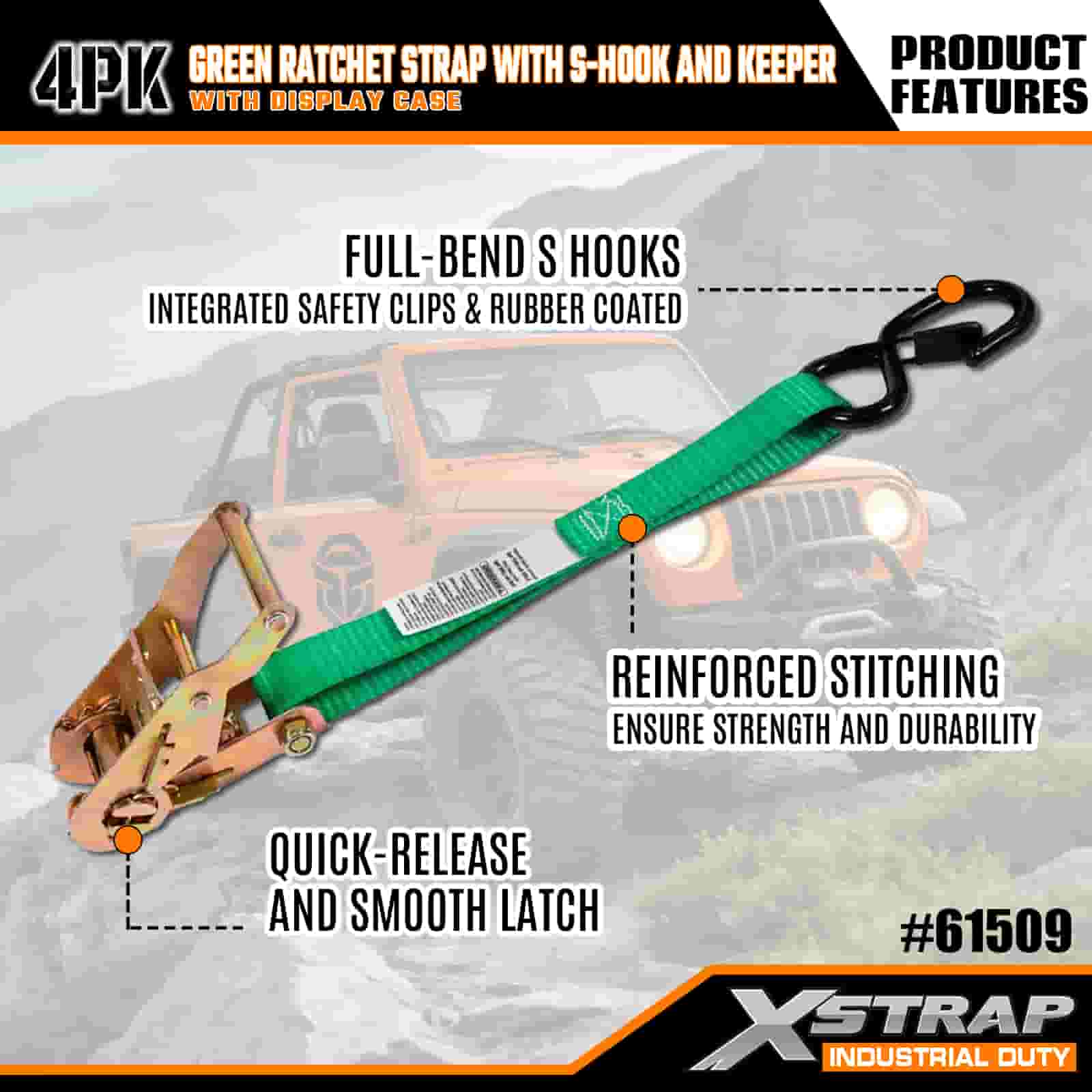 안전 S 후크가 있는 Xstrap 4 팩 래칫 스트랩, 1" x 15' 폴리에스테르 타이다운 스트랩 당김 래칫 스트랩, 400lbs 용량 화물 래싱 안전 S 후크가 있는 고정 스트랩 화물 트레일러, 플랫 베드 트레일러, 스키 보트, 소형차를 고정하는 진지한 전문가용.