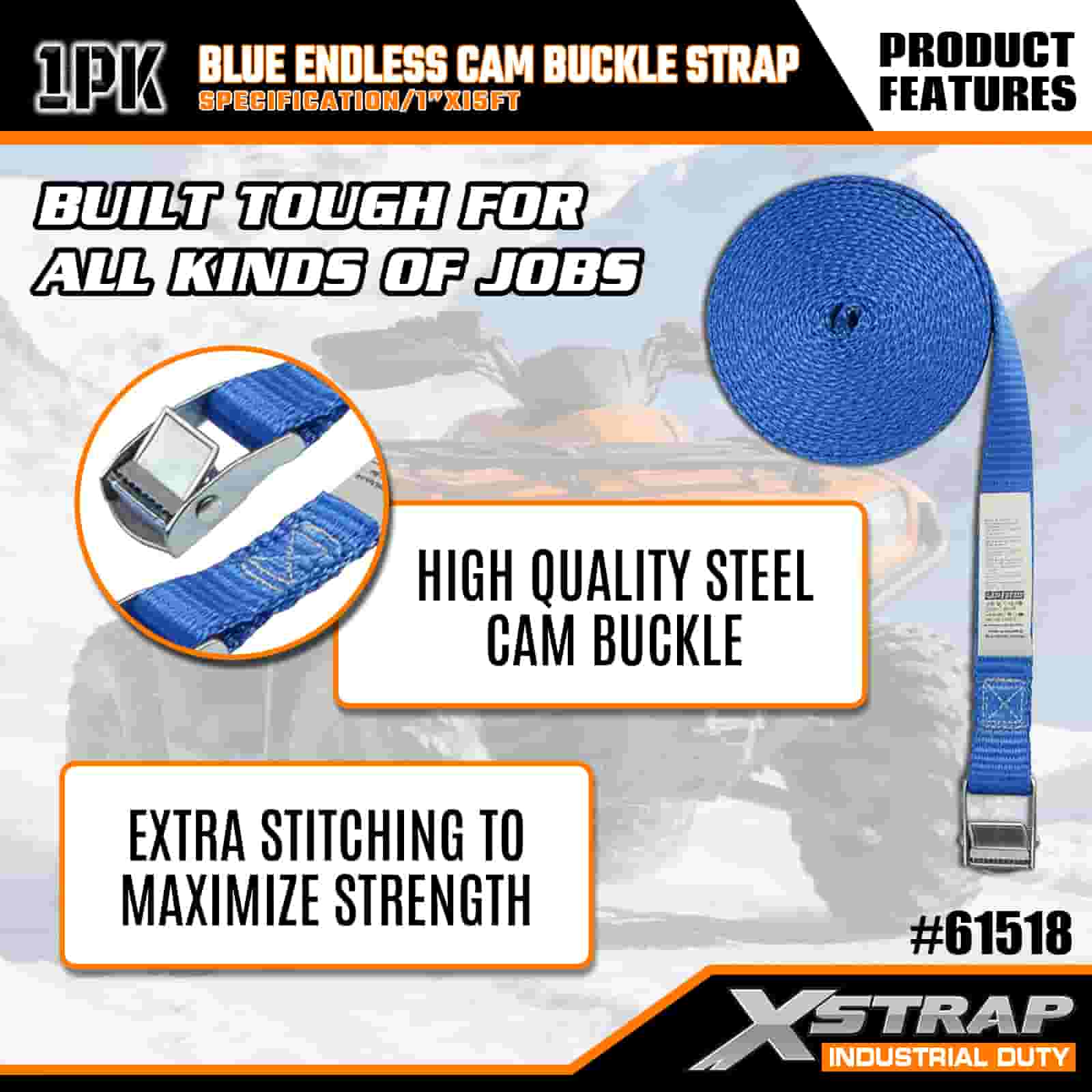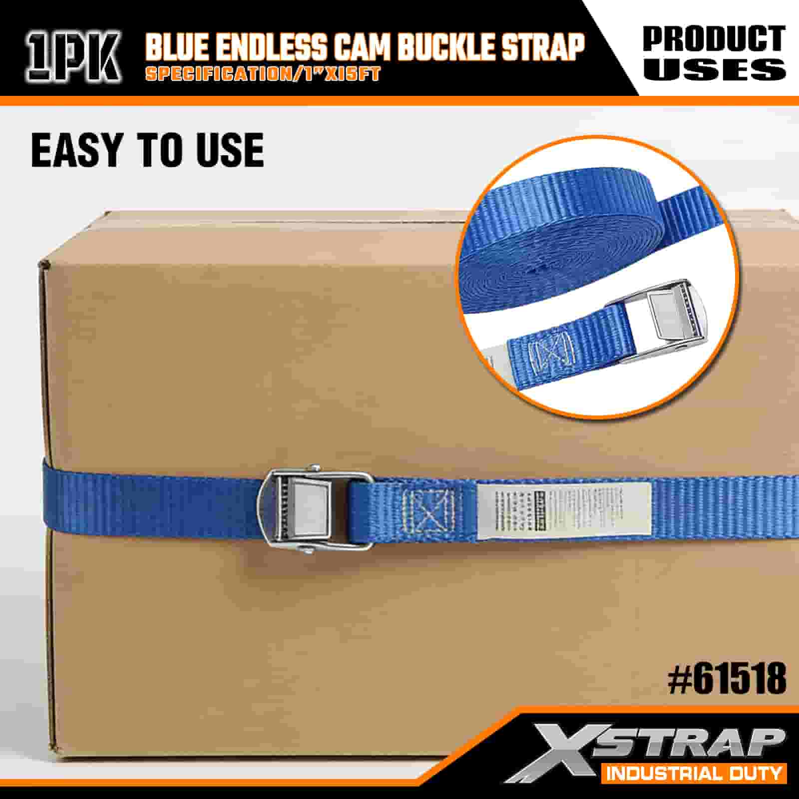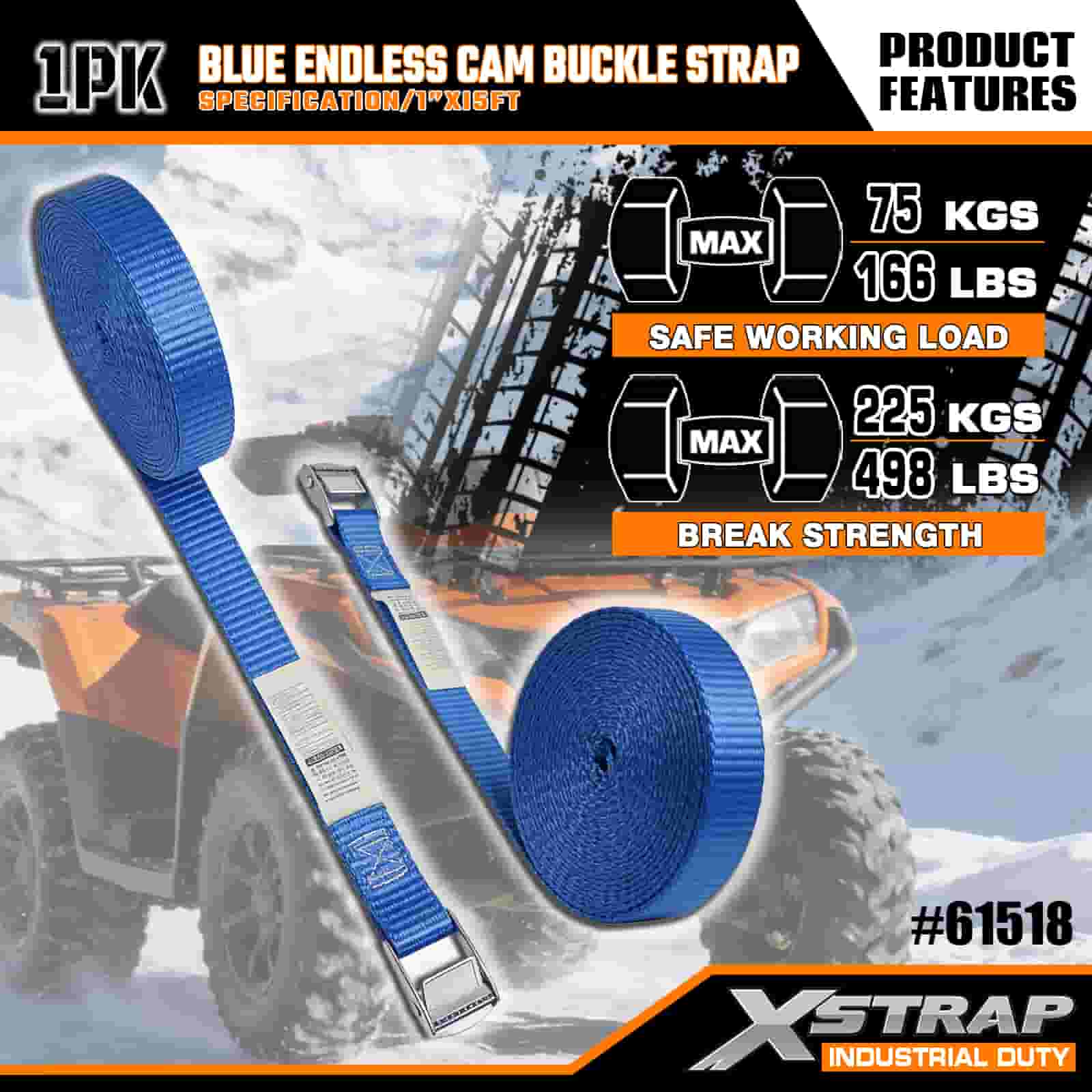 Xstrap 블루 엔드리스 캠 버클 스트랩, 1인치 x 15' 폴리에스테르 타이다운 스트랩 당김 래칫 스트랩, 전문적인 화물 트레일러, 플랫 베드 트레일러, 스키 보트, 소형 자동차를 고정하기 위한 166lbs 용량 화물 래싱 고정 스트랩.