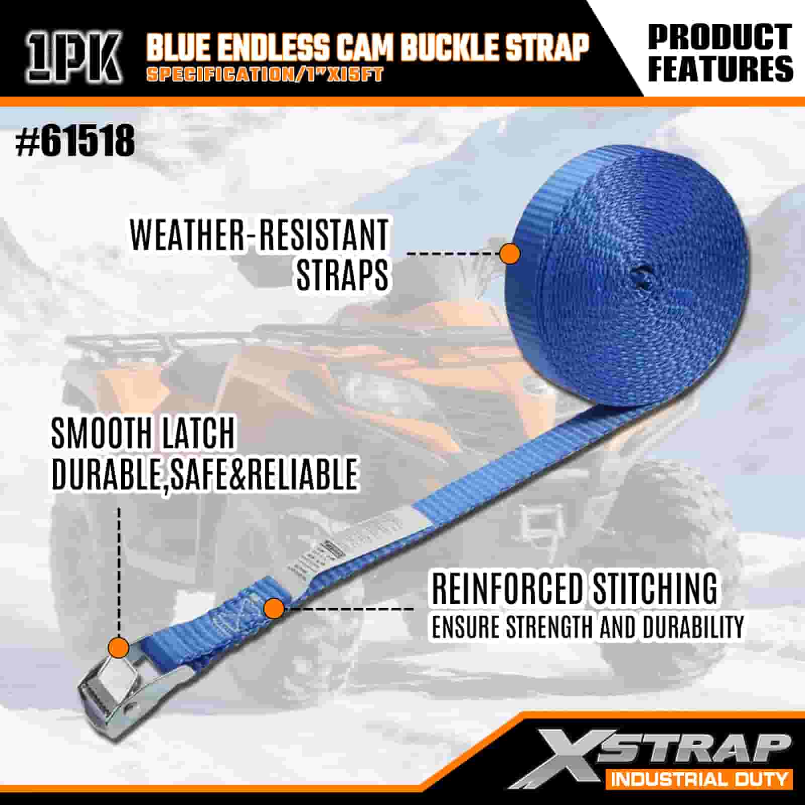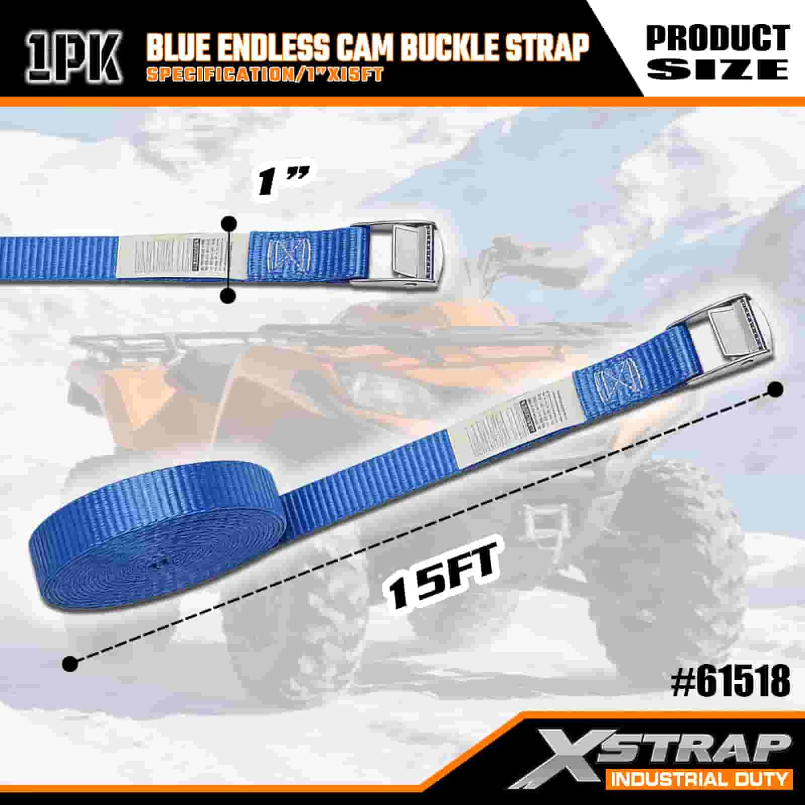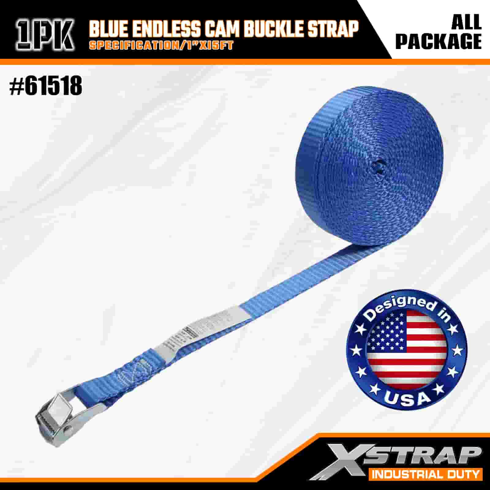 Xstrap 블루 엔드리스 캠 버클 스트랩, 1인치 x 15' 폴리에스테르 타이다운 스트랩 당김 래칫 스트랩, 전문적인 화물 트레일러, 플랫 베드 트레일러, 스키 보트, 소형 자동차를 고정하기 위한 166lbs 용량 화물 래싱 고정 스트랩.