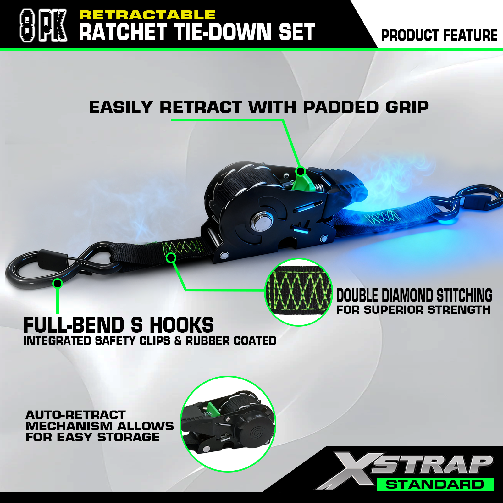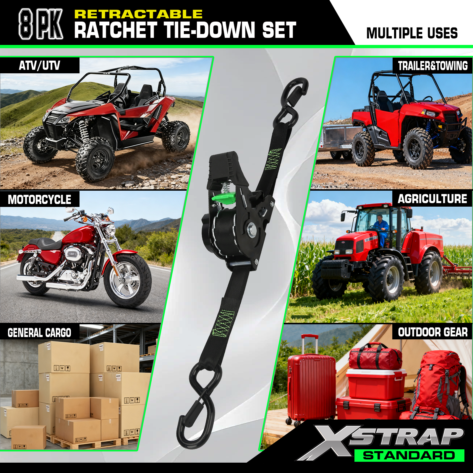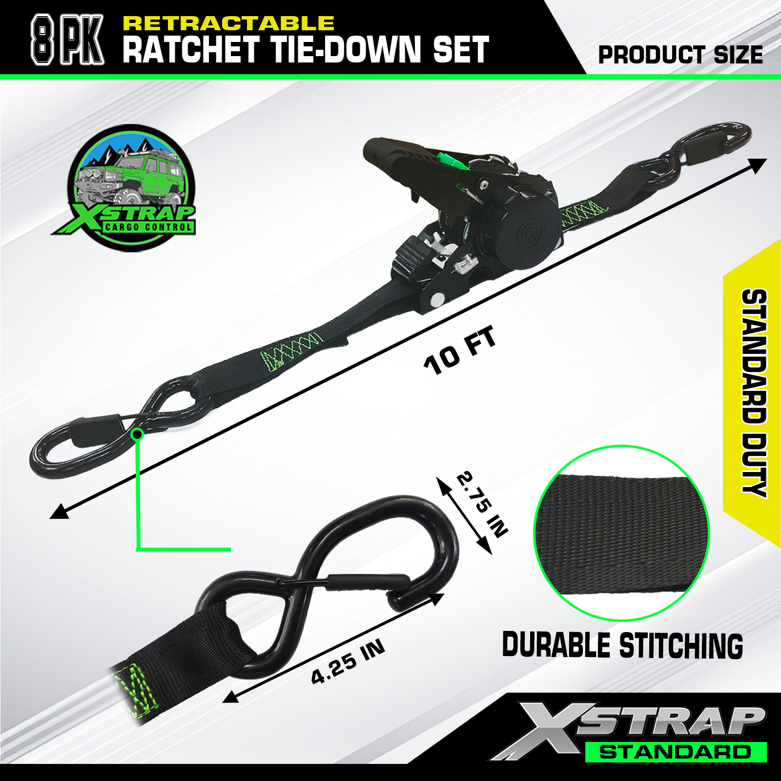 접이식 래칫 스트랩에는 자동 수축 메커니즘이 내장되어 있어 사용 후 스트랩이 하우징 안으로 부드럽게 들어갈 수 있습니다. 이렇게 하면 스트랩을 깔끔하고 보호할 수 있을 뿐만 아니라 준비 및 청소 시간도 크게 단축됩니다. 10피트 폴리에스터 웨빙은 오토바이, ATV, 자전거, UTV에 강한 장력과 신뢰할 수 있는 강도를 제공합니다. 인체공학적 래칫 핸들은 조작하기 편리하며, 짐을 조일 때 더 나은 그립감과 더 적은 노력을 제공합니다.