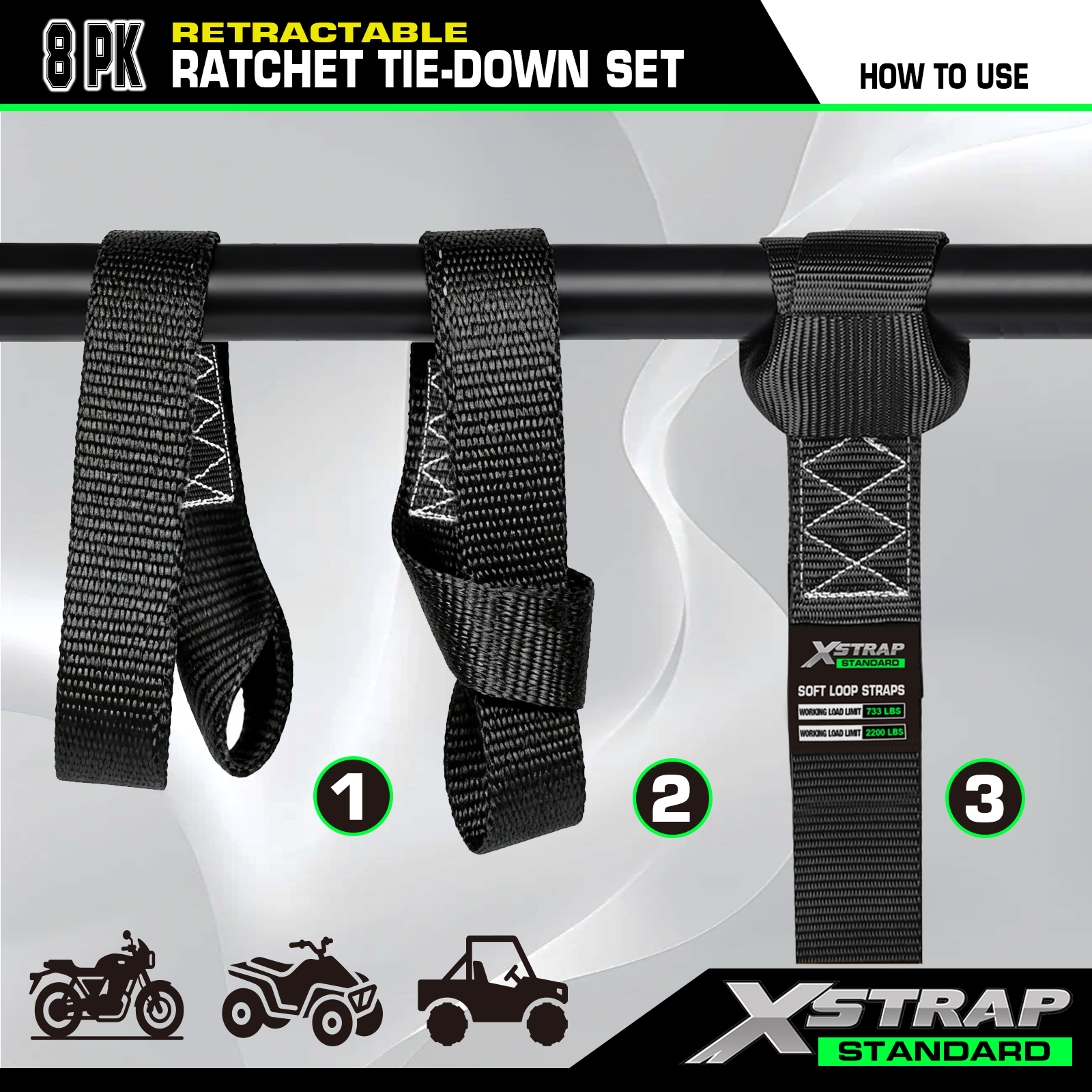 - 4개의 소프트 루프 타이다운이 포함되어 있습니다. 소프트 루프는 루프랙, 트럭 적재함, 핸들바에 앵커 포인트를 만드는 데 도움이 될 수 있습니다. 따라서 다양한 시나리오에서 접이식 래칫 스트랩을 사용할 수 있습니다.