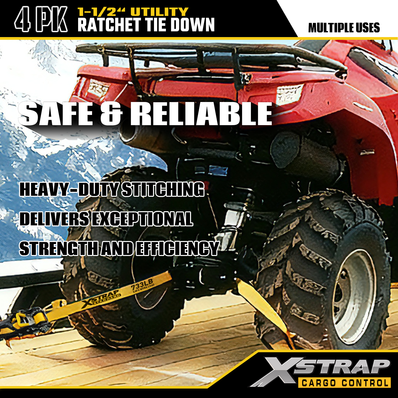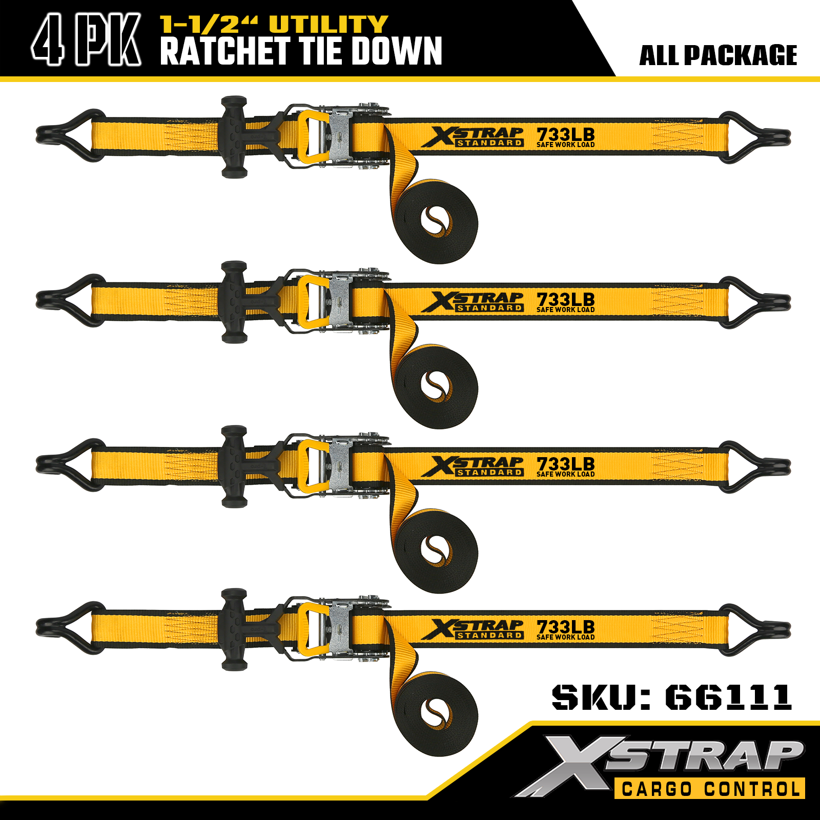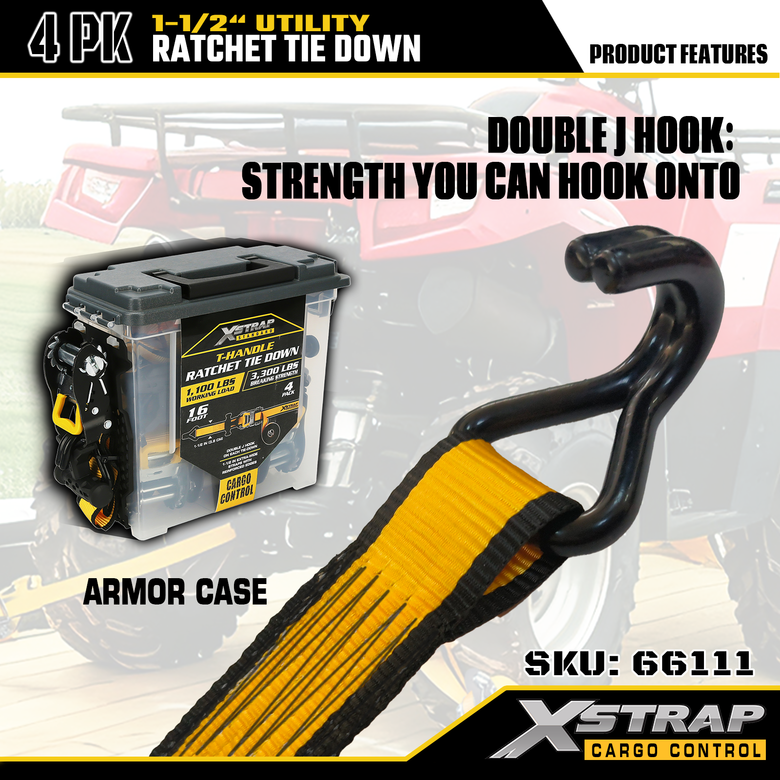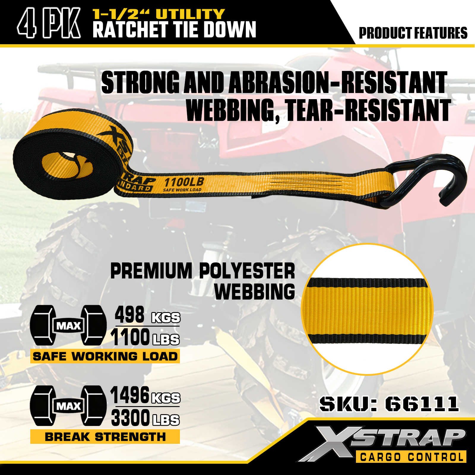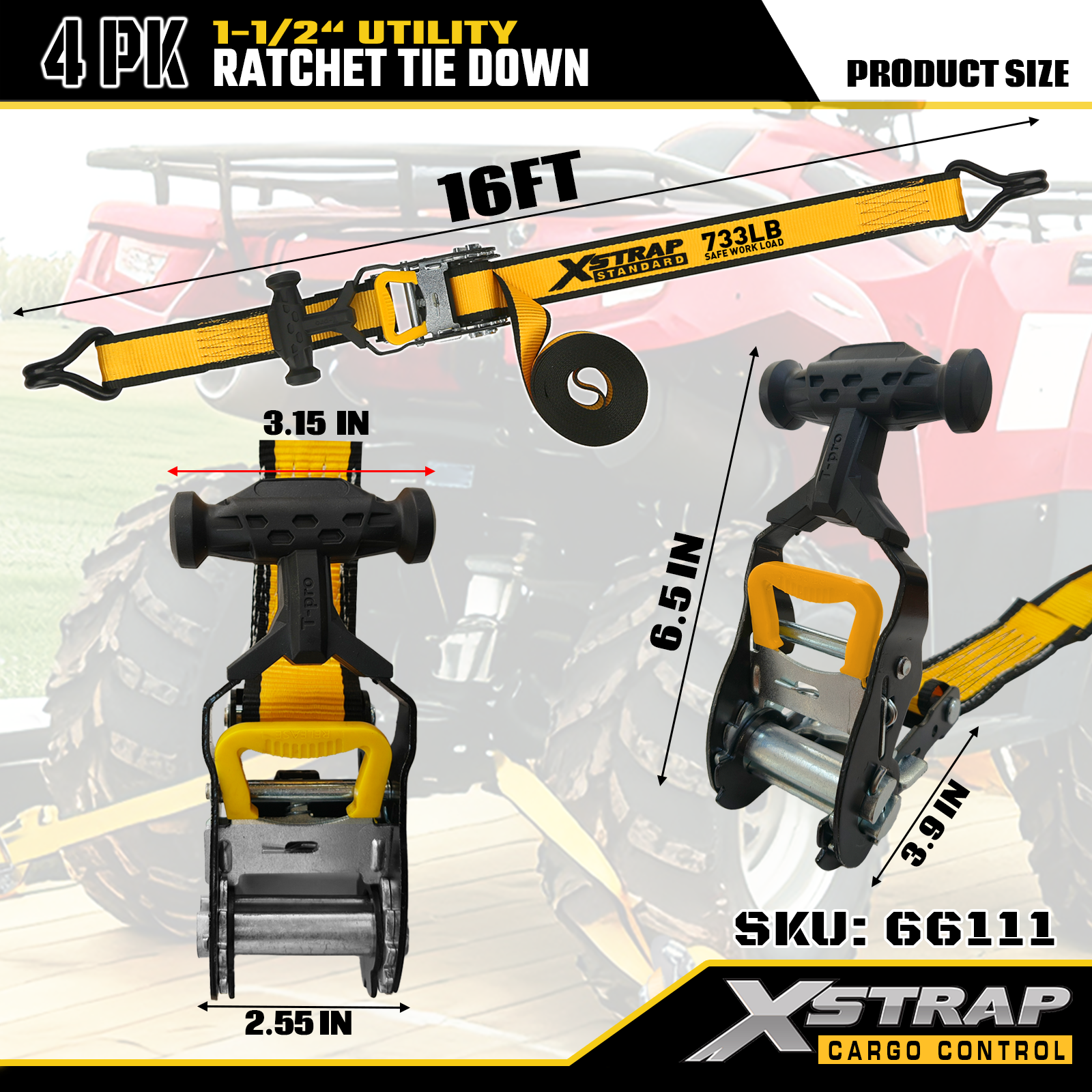 Xstrap T-핸들 래칫 타이다운은 1.5인치 x 16피트이고, 안전한 작업 하중은 1,100lbs이고 파손 강도는 3,300lbs입니다.