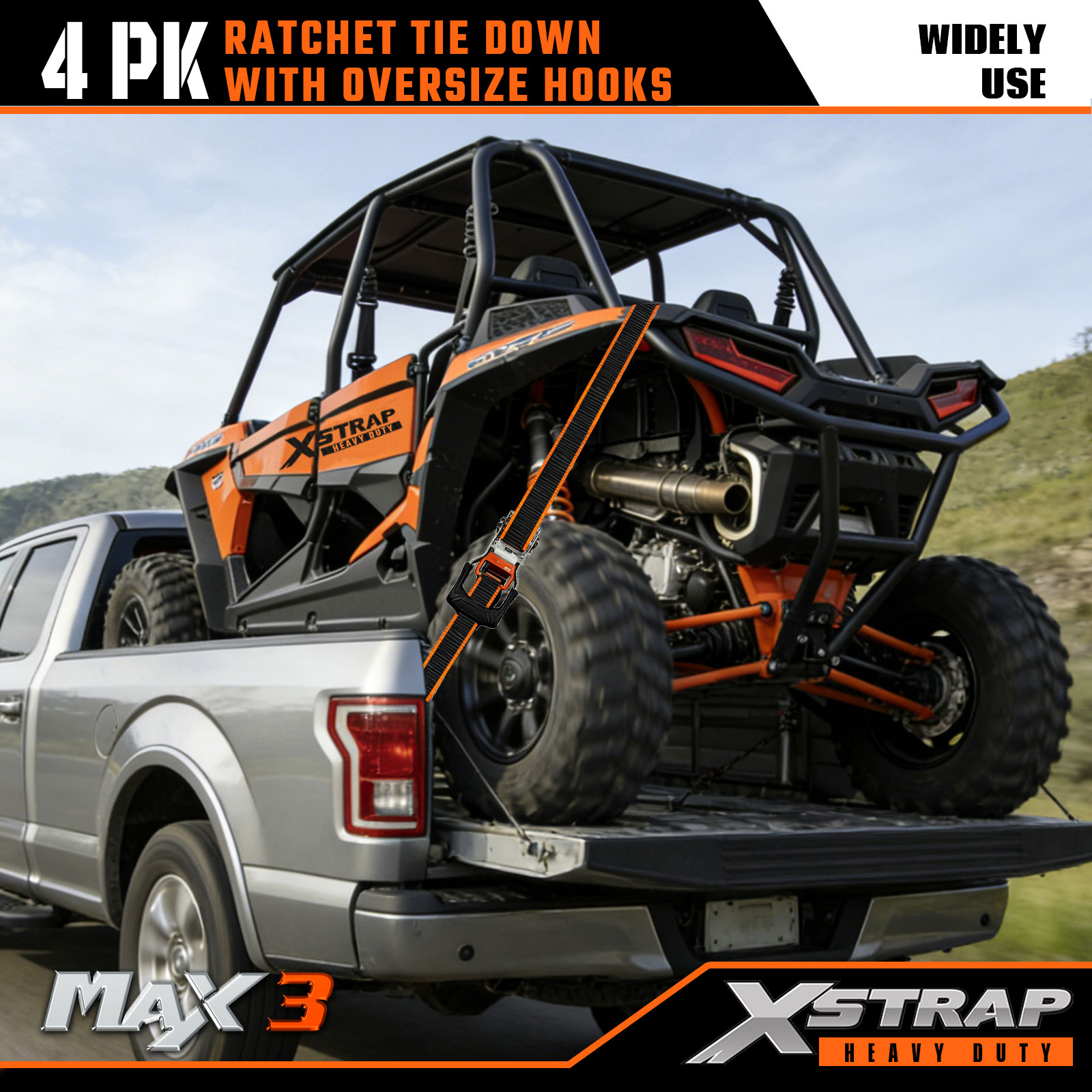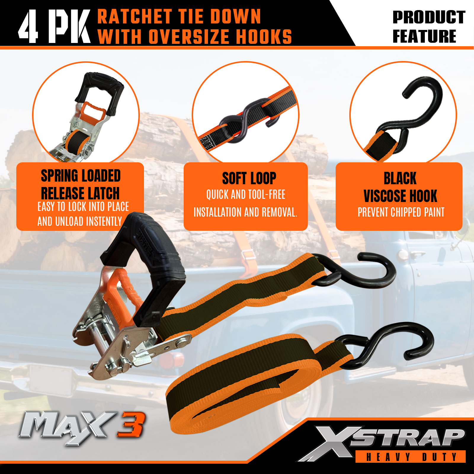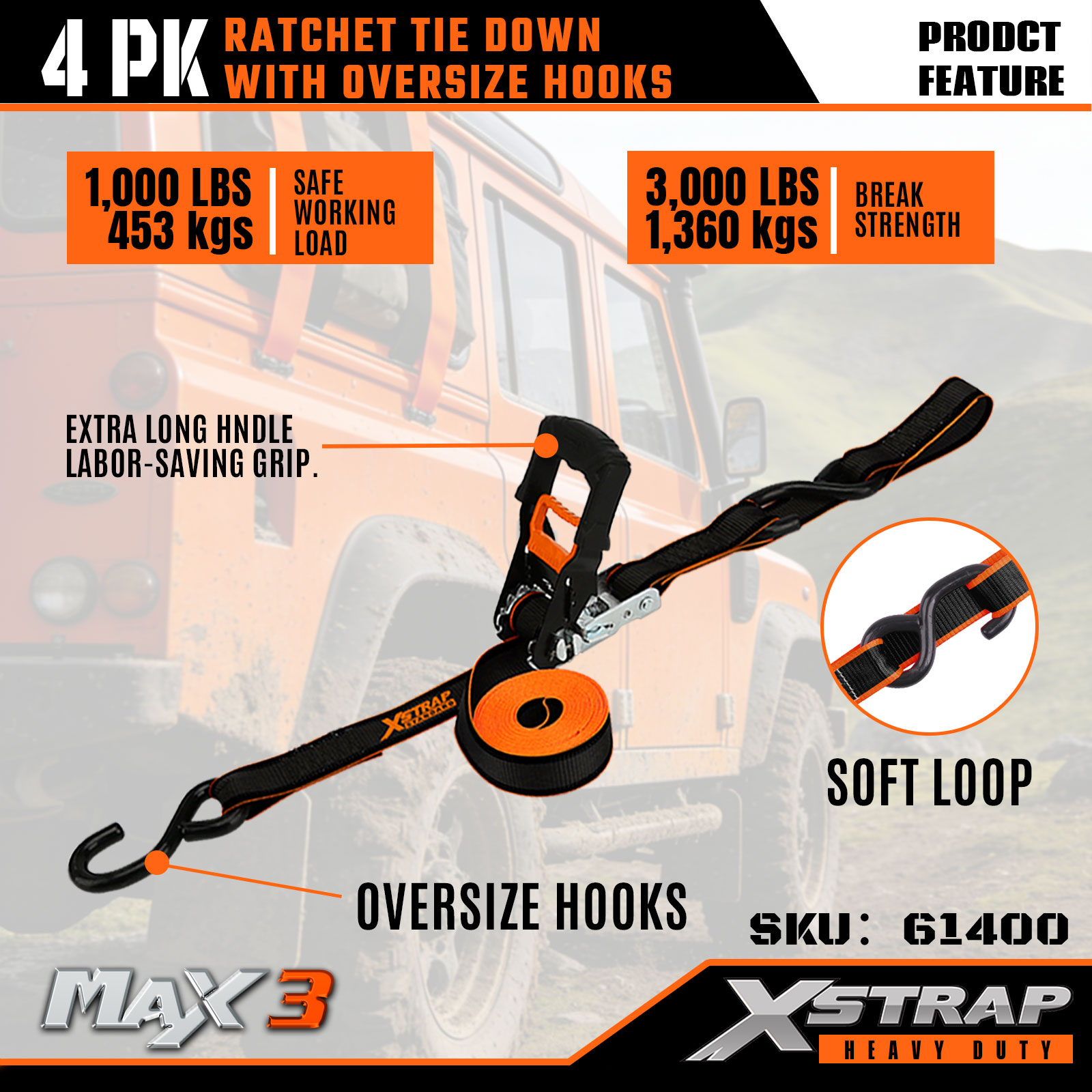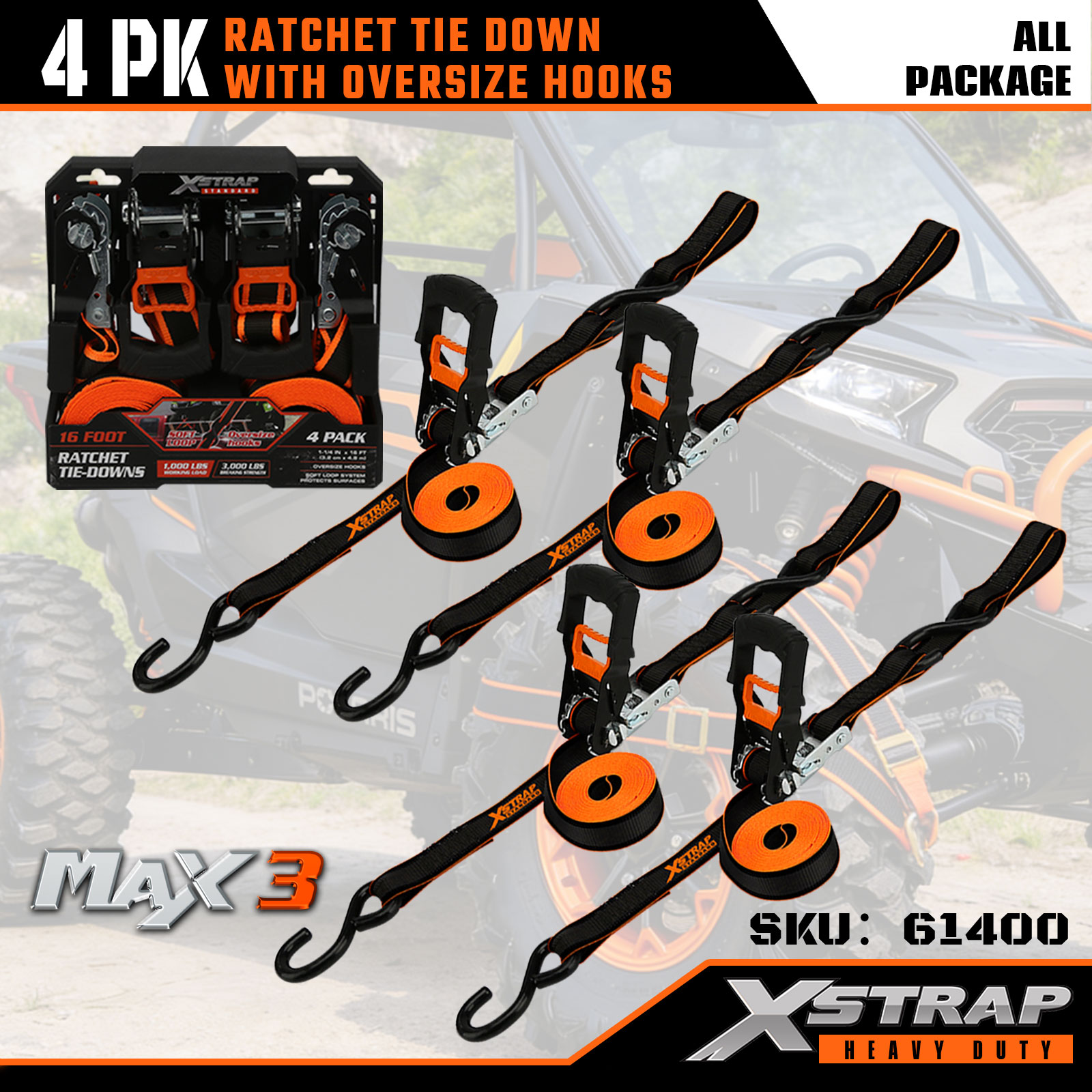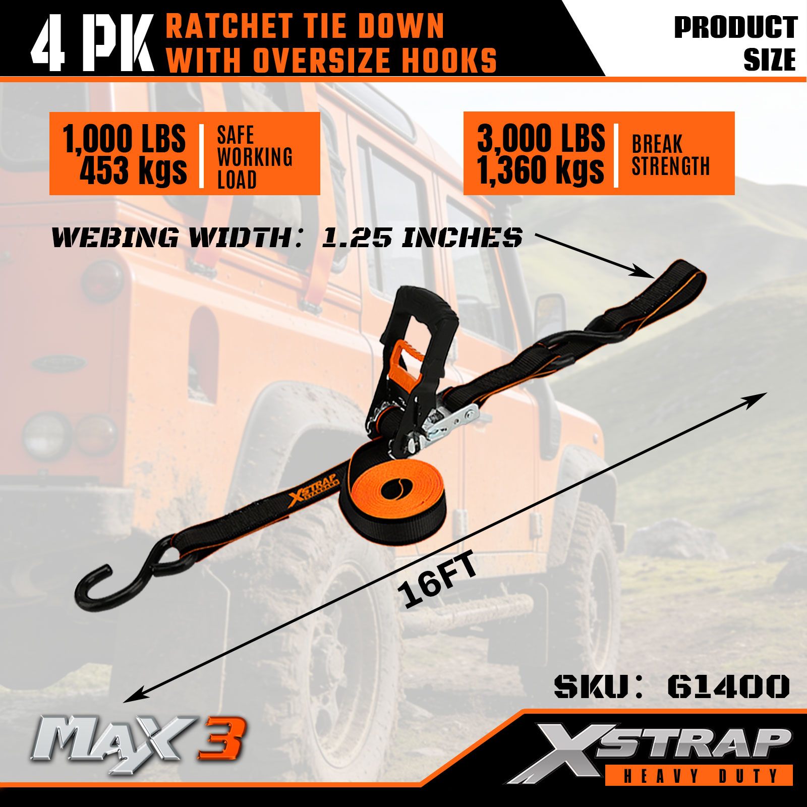 Xstrap 4 팩 래칫 타이 다운, 1-1/4인치 x 16' 폴리에스테르 타이 다운 스트랩 풀 래칫 스트랩, 픽업 트럭, SUV, 자동차 탑 랙 오토바이, 소형 낚시 보트, 제트 스키, 스노모빌, 잔디 트랙터용 이중 J 후크가 있는 1000lbs 용량 화물 래싱 고정 스트랩.