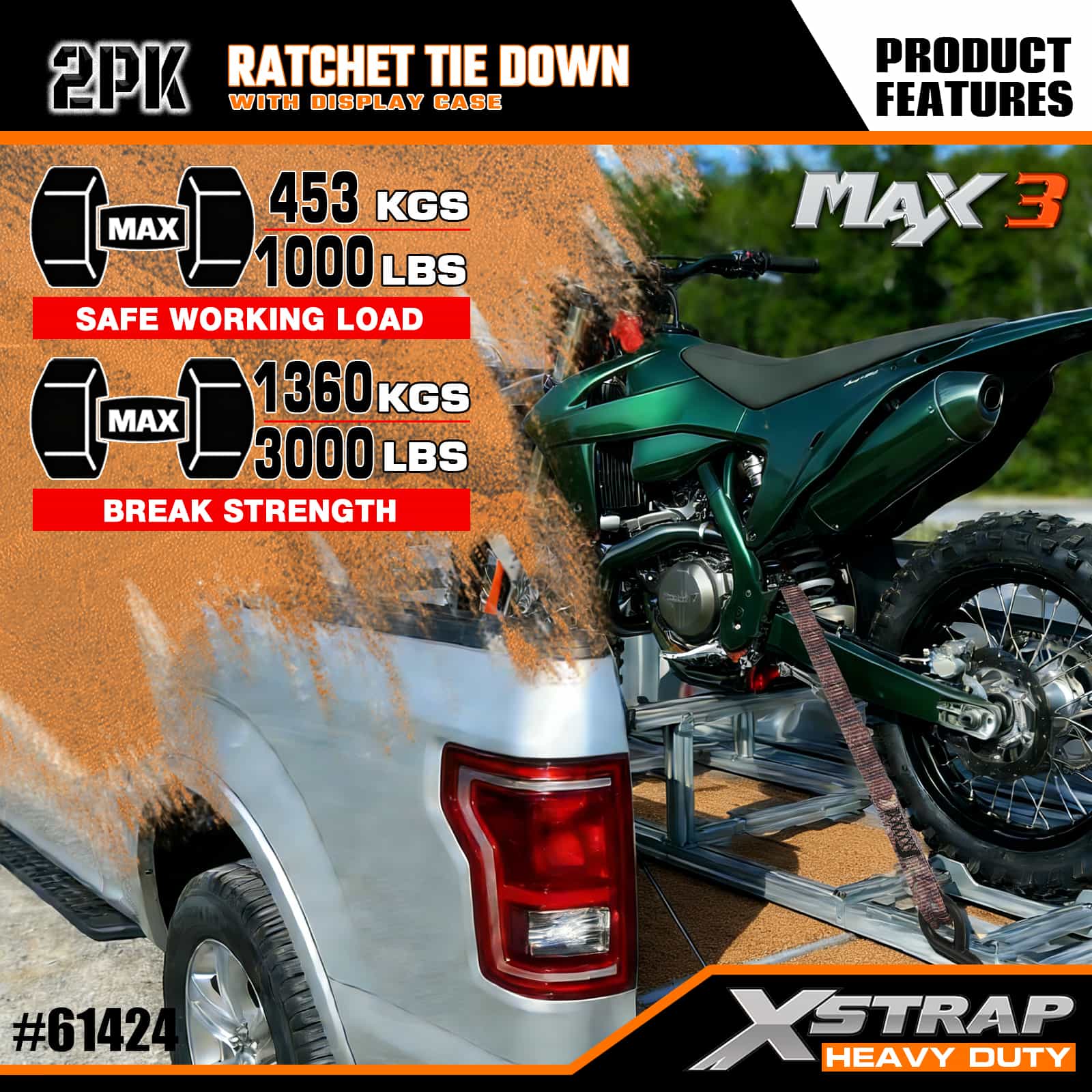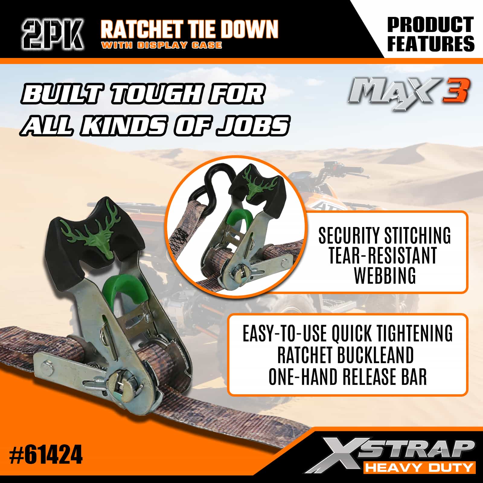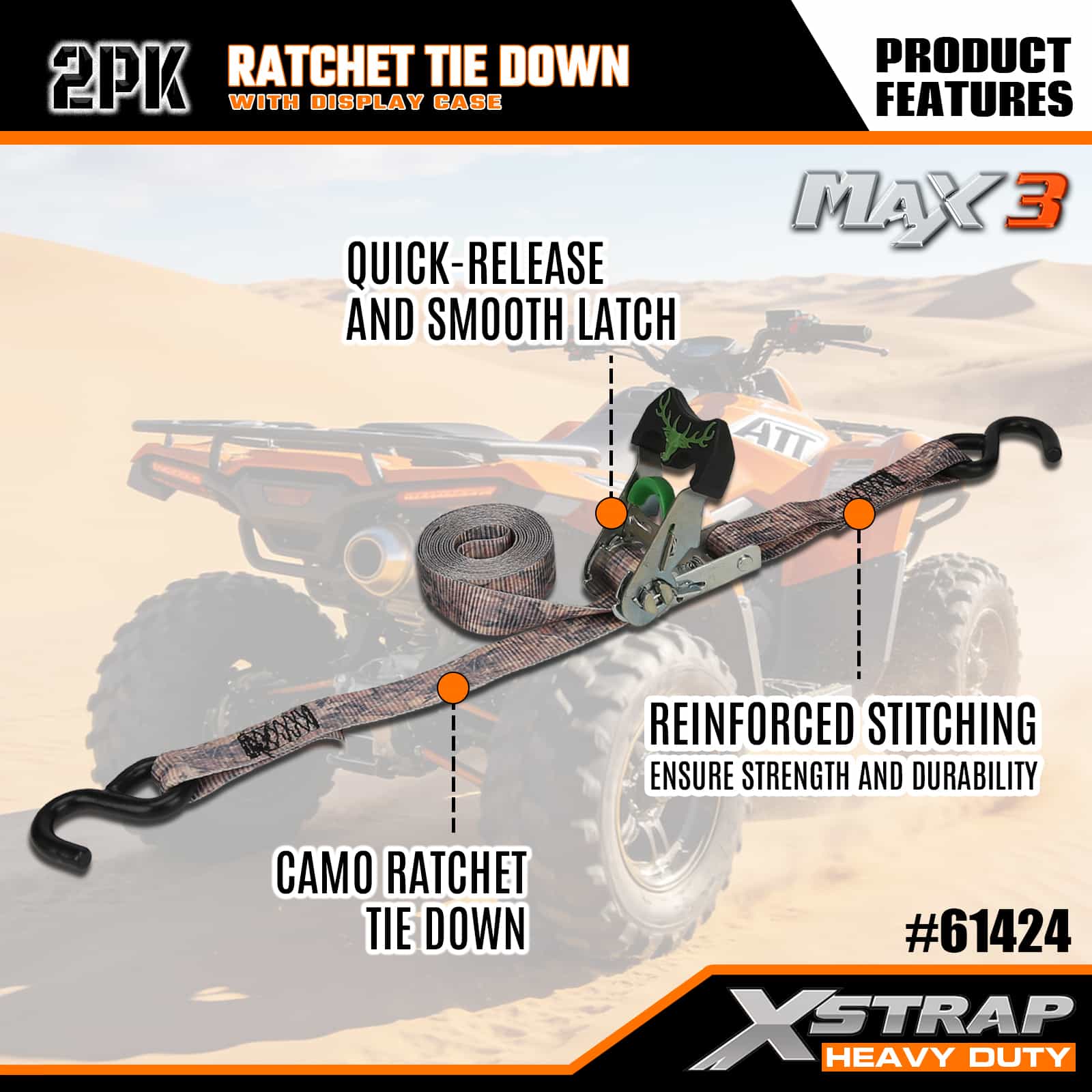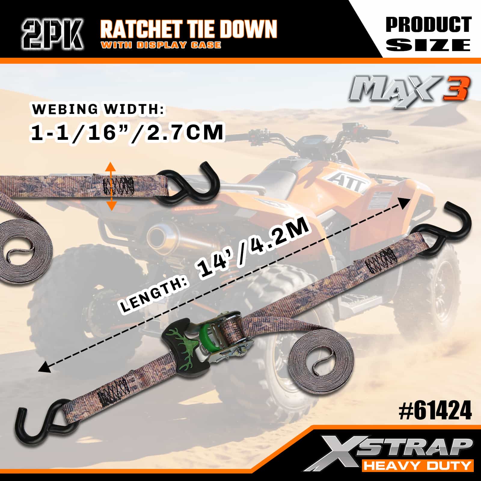 Xstrap 2팩 카모 래칫 타이다운, 1-1/16인치 x 14' 폴리에스테르 타이다운 스트랩 당김 래칫 스트랩, 픽업 트럭, SUV, 자동차 탑 랙 오토바이, 경량 낚시 보트, 제트 스키, 스노모빌, 잔디 트랙터용 S 후크가 있는 1000lbs 용량 화물 래싱 고정 스트랩.