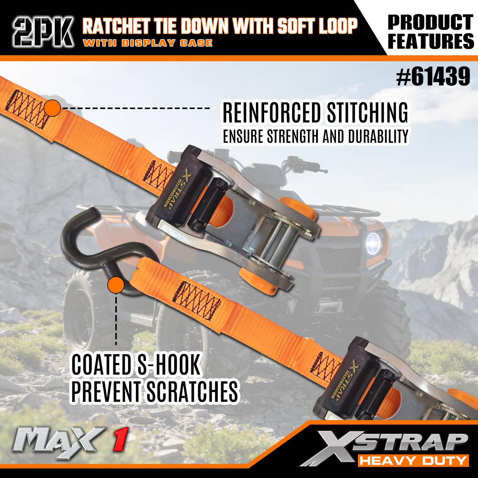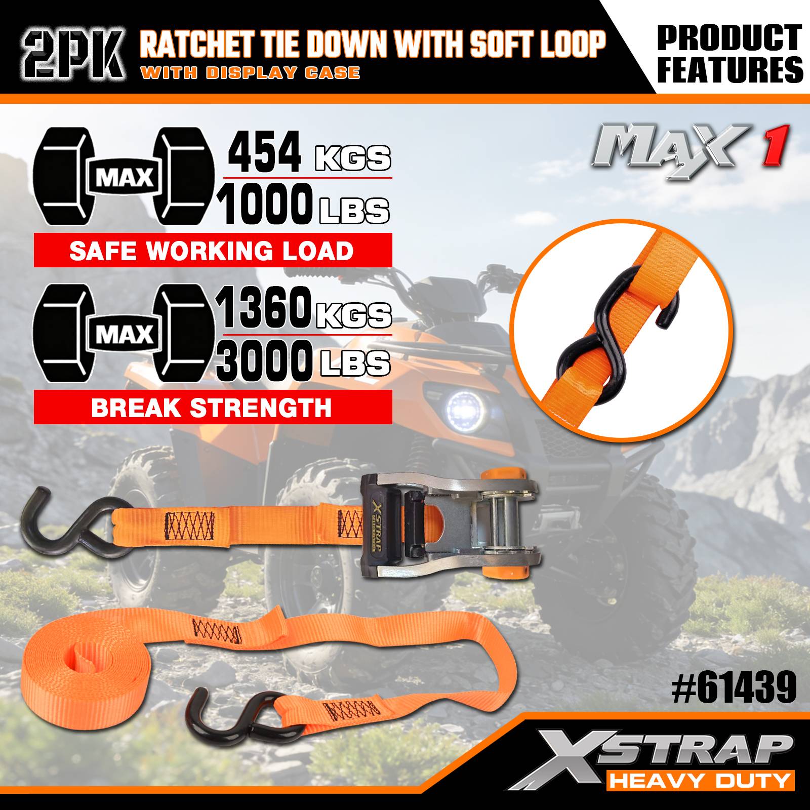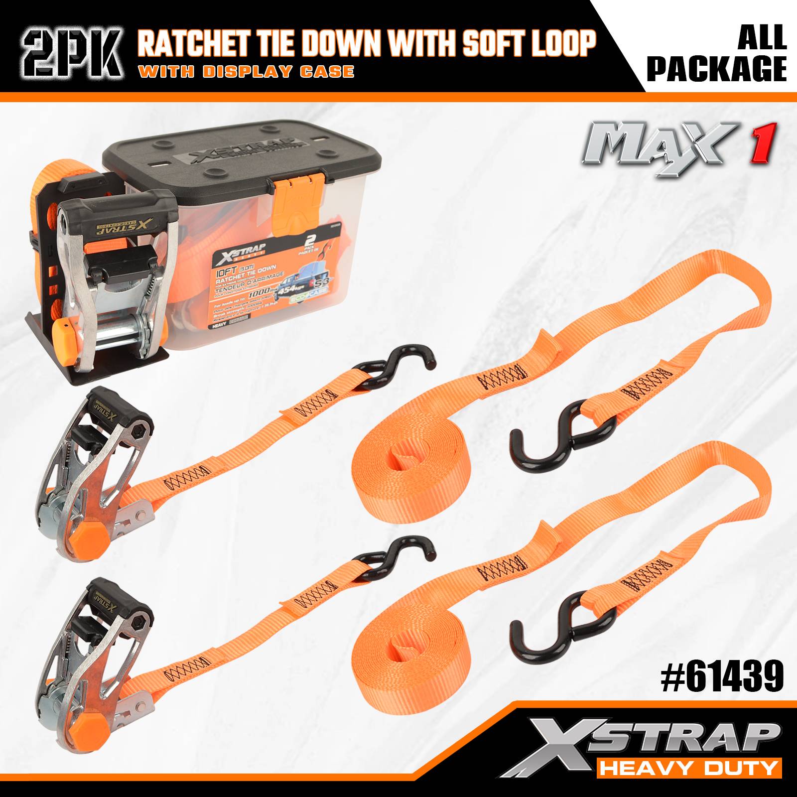 Xstrap 2팩 래칫 타이다운(소프트 루프 포함), 1-1/16인치 x 10' 폴리에스테르 타이다운 스트랩 당김 래칫 스트랩, 트럭, SUV, 자동차 탑 랙 오토바이용 S 후크가 있는 1000lbs 용량 화물 래싱 고정 스트랩.