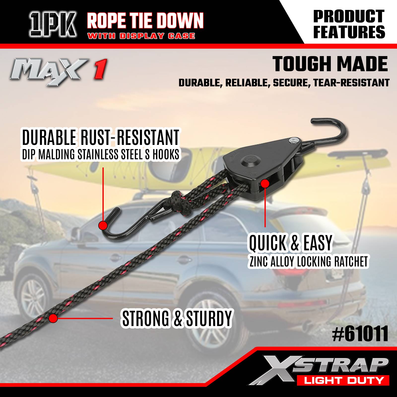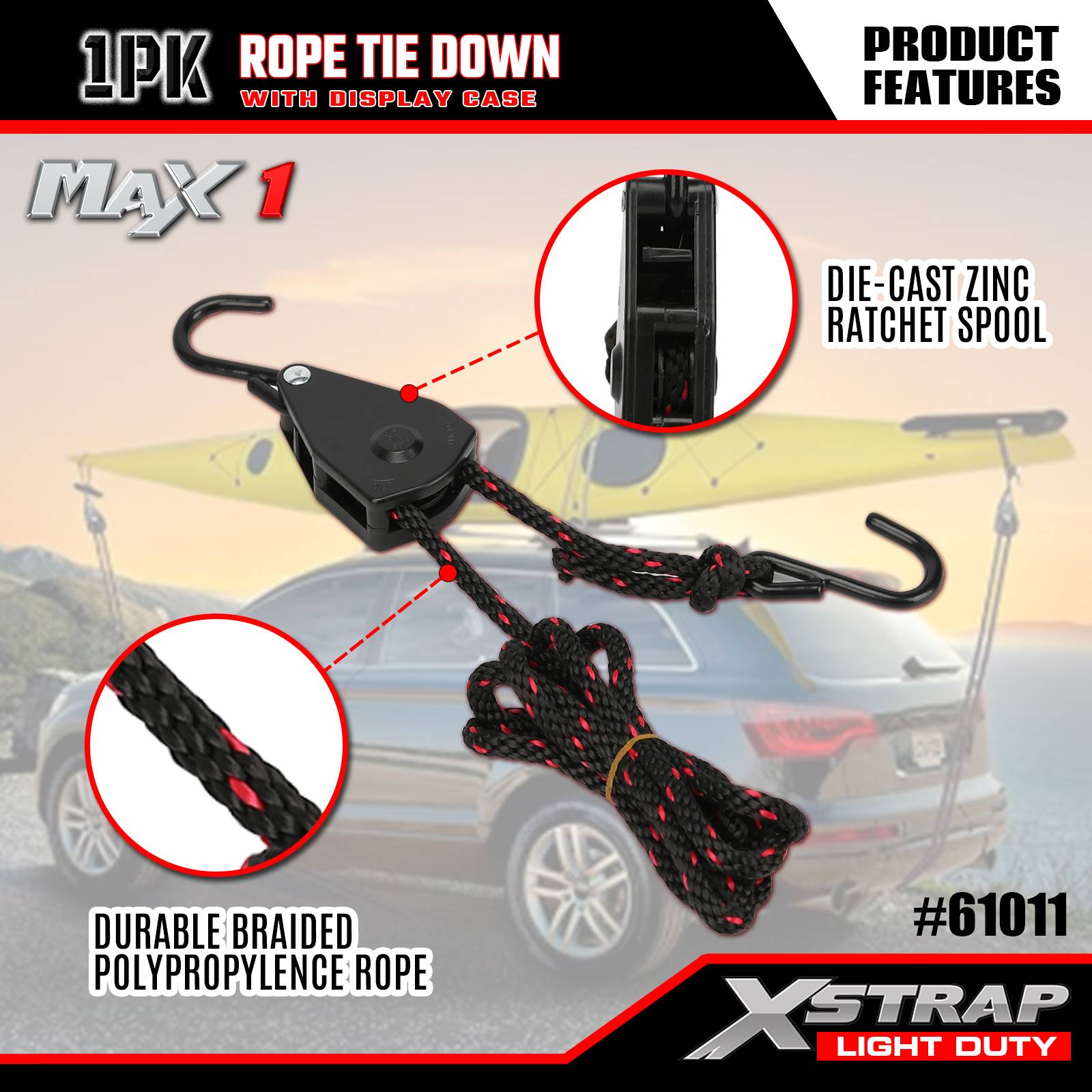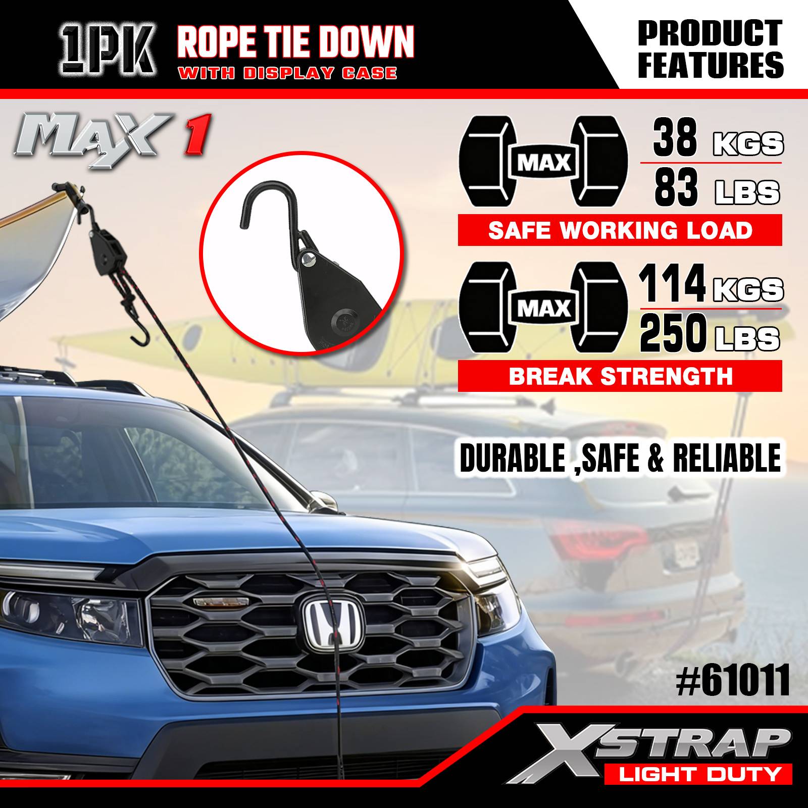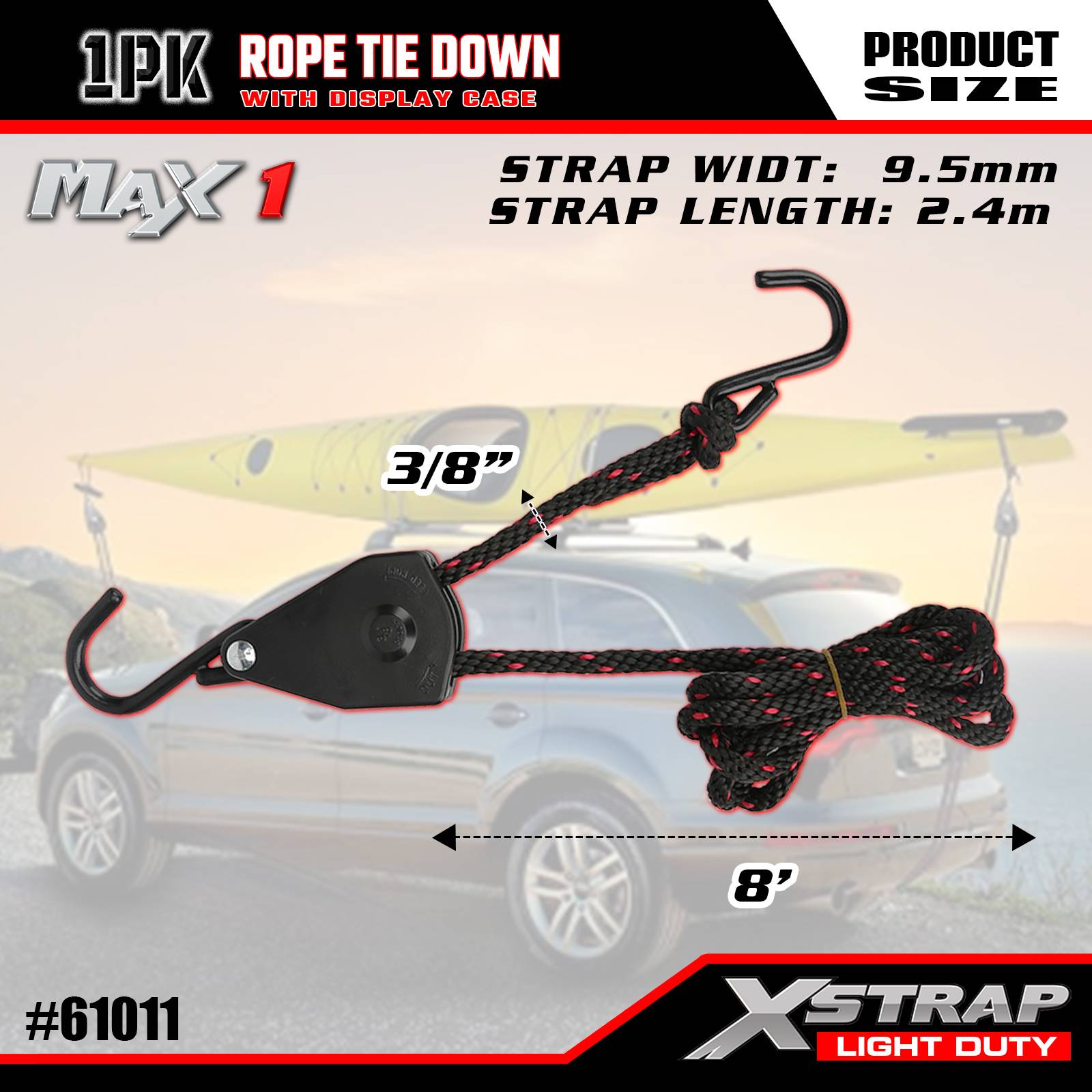 Xstrap 1 팩 로프 타이다운 스트랩, 3/8인치 x 8' - 83파운드 로드 캡 - 차량/랙에 가벼운 하중(카약, 장비, 소형 장비)을 고정하기 위한 250파운드 파손 강도 화물 스트랩