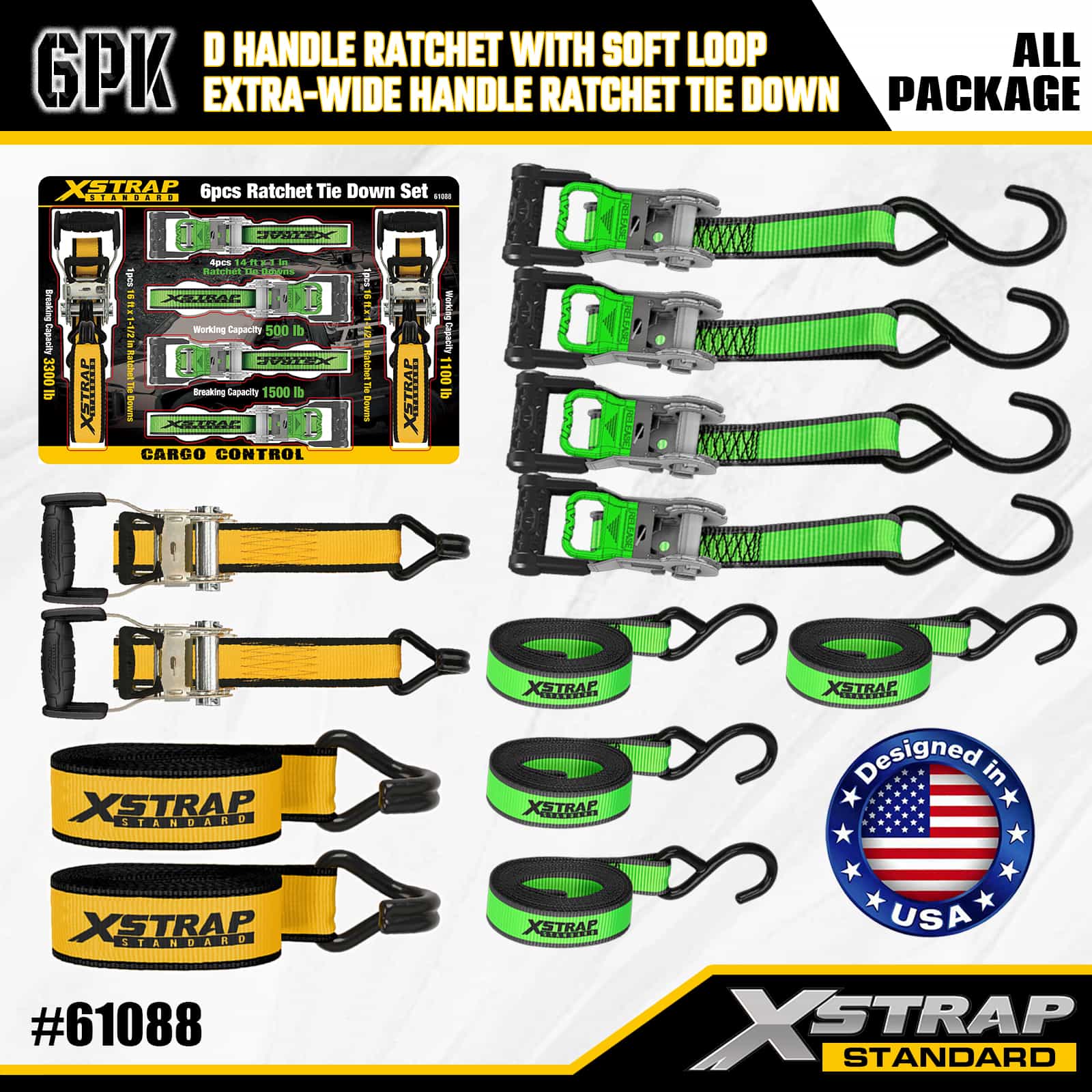 Xstrap 6팩 알루미늄 래칫 타이다운, 1인치 x 14' 및 1인치 x 16' 폴리에스테르 타이다운 스트랩 당김 래칫 스트랩, 500lbs 및 1100lbs 용량 화물 래싱 고정 스트랩(S 후크 및 더블 J 후크 포함) 화물 제어용 픽업 트럭, SUV, 자동차 탑 랙 오토바이.
