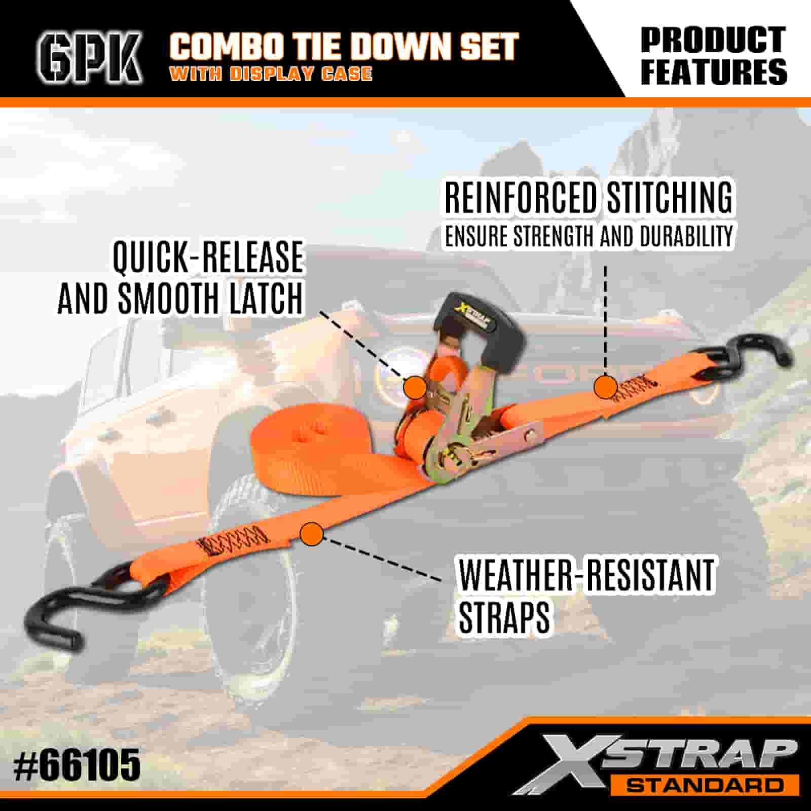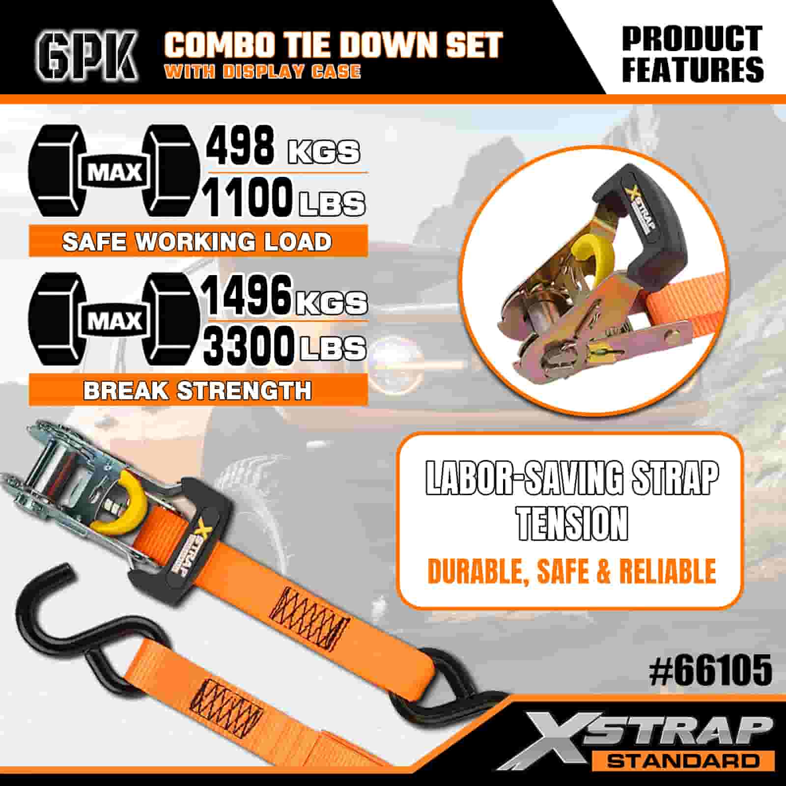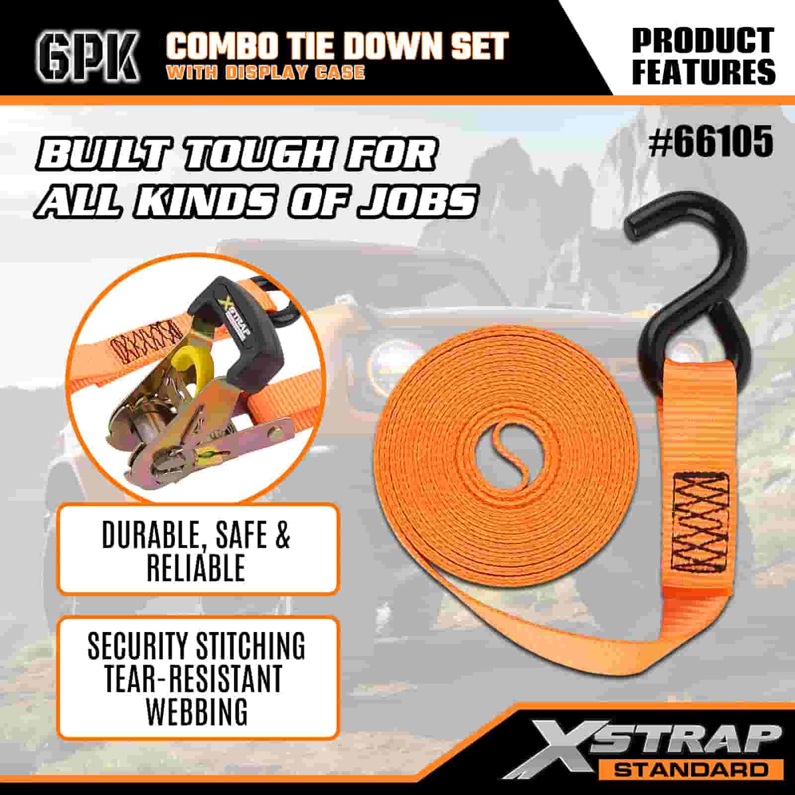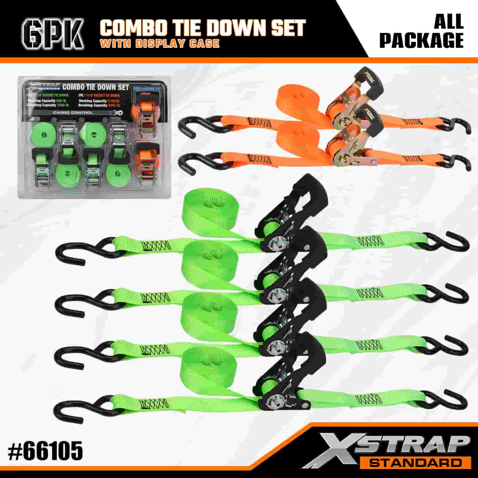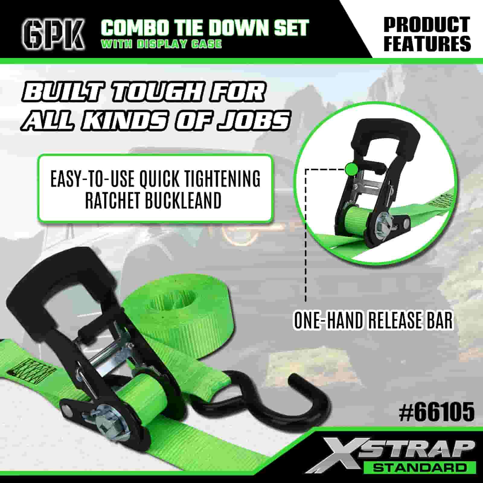 - 정리된 콤보 디스플레이 포장: 가벼운 녹색 타이다운 4개와 튼튼한 오렌지색 타이다운 2개로 분리된 깔끔한 라벨이 붙은 디스플레이 케이스에 들어 있어 보관, 운반 및 각 작업에 적합한 스트랩을 쉽게 선택할 수 있도록 세트를 깔끔하게 유지합니다.