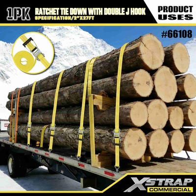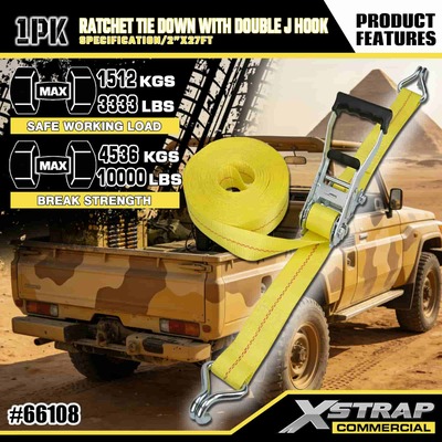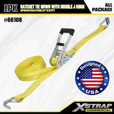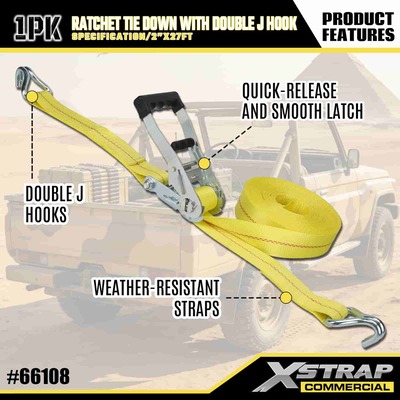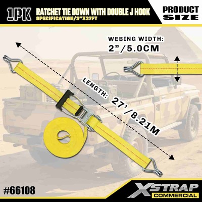 Xstrap 래칫 타이다운(더블 J 후크 포함), 2인치 x 27' 폴리에스테르 타이다운 스트랩 당김 래칫 스트랩, 3333lbs 용량 화물 래싱 고정 스트랩, 더블 J 후크 포함 화물 제어 픽업 트럭, SUV, 자동차 탑 랙 오토바이용.