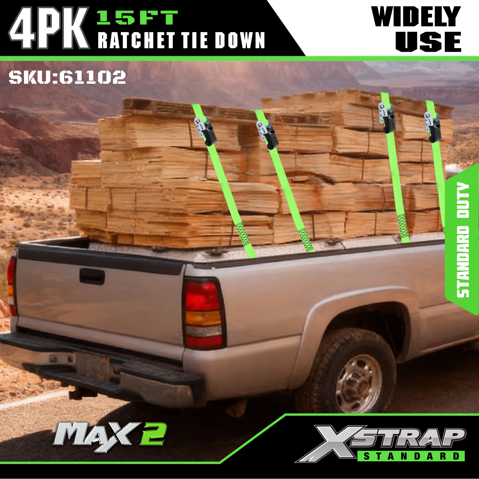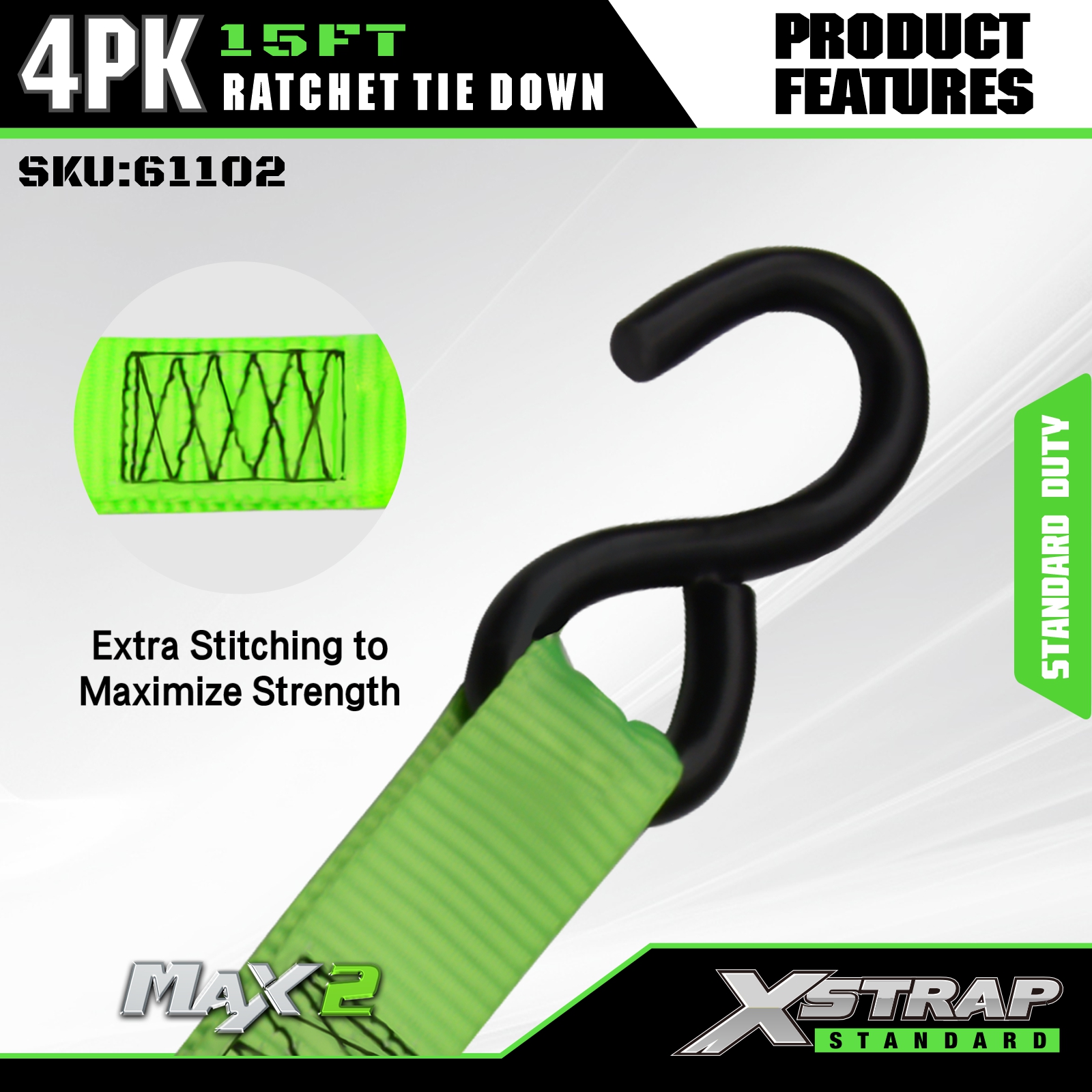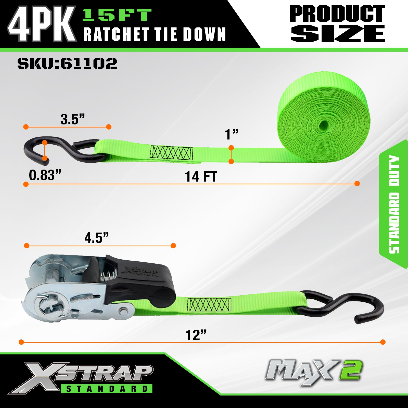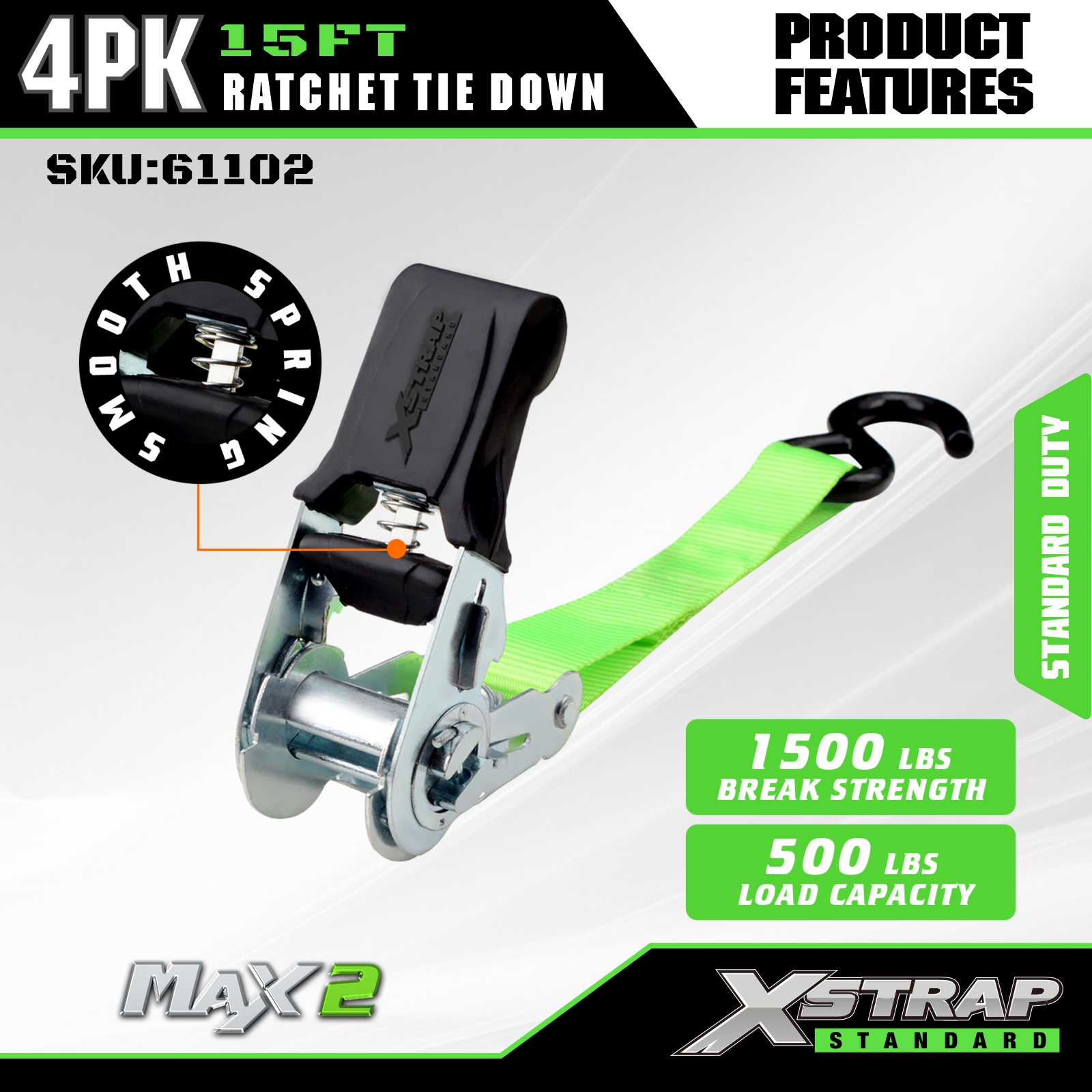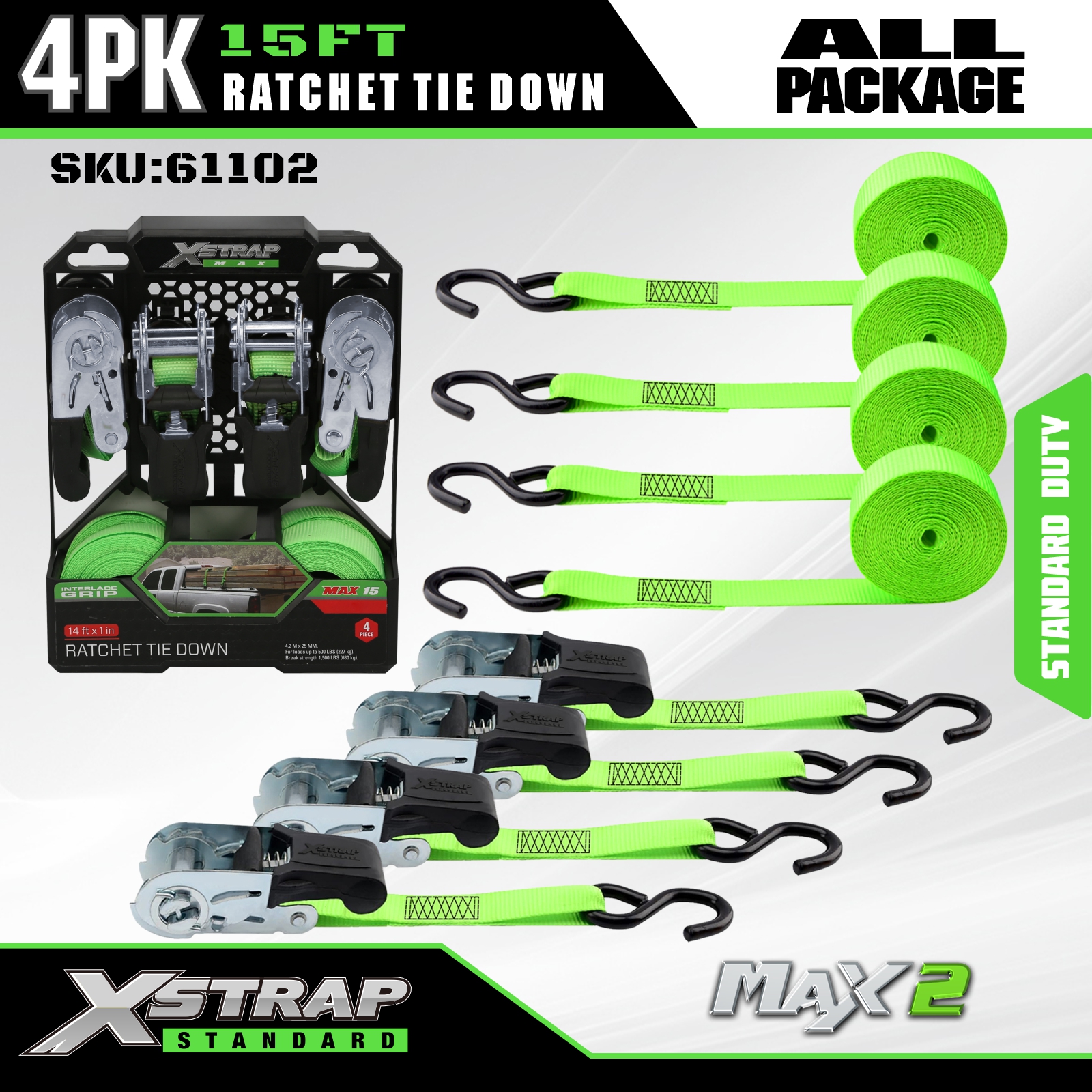 Xstrap 래칫 타이 다운 스트랩 4 PK 15Ft- 500 Lbs 적재 용량 1500 Lbs 파손 강도-이동 기기, 잔디 장비, 오토바이용 화물 스트랩.