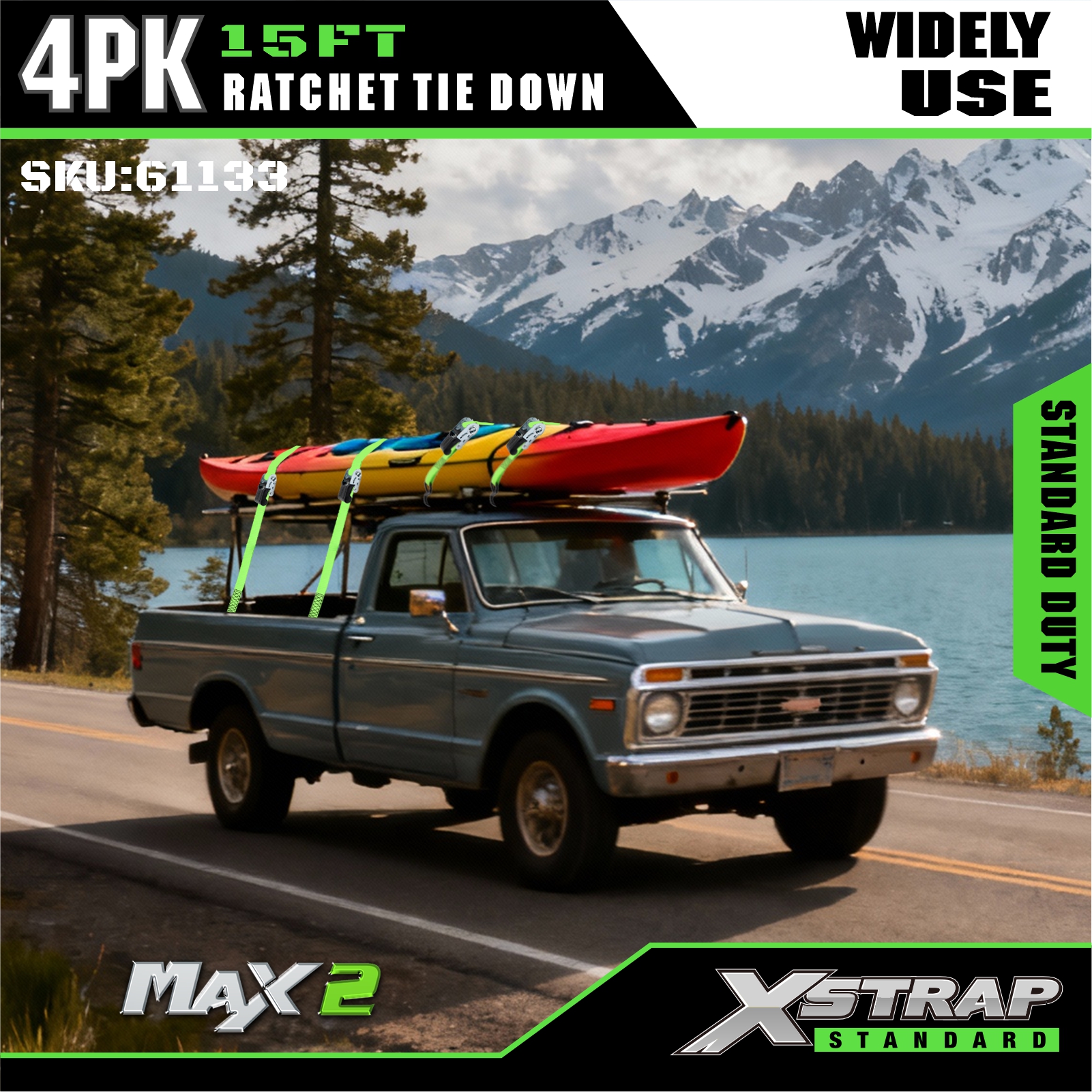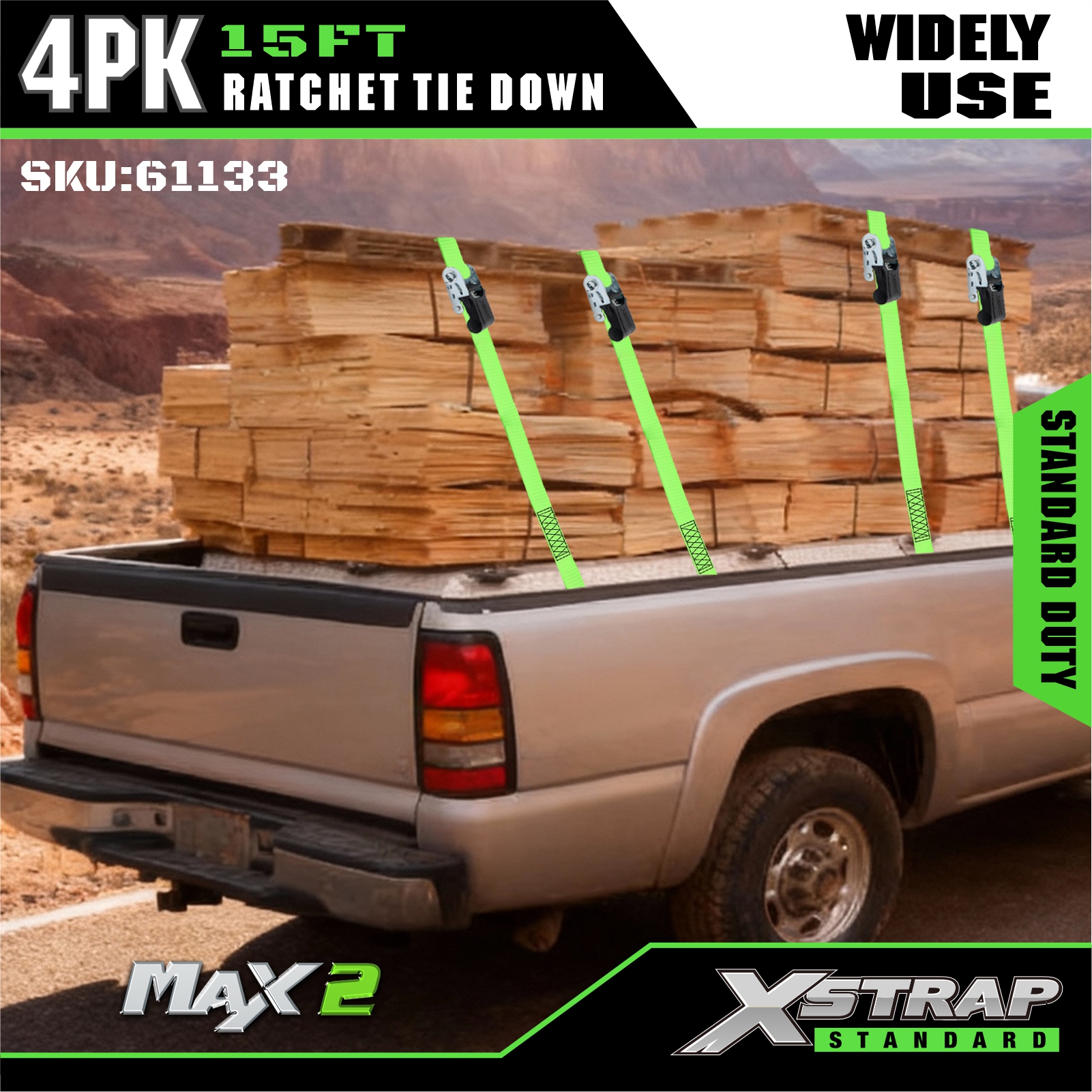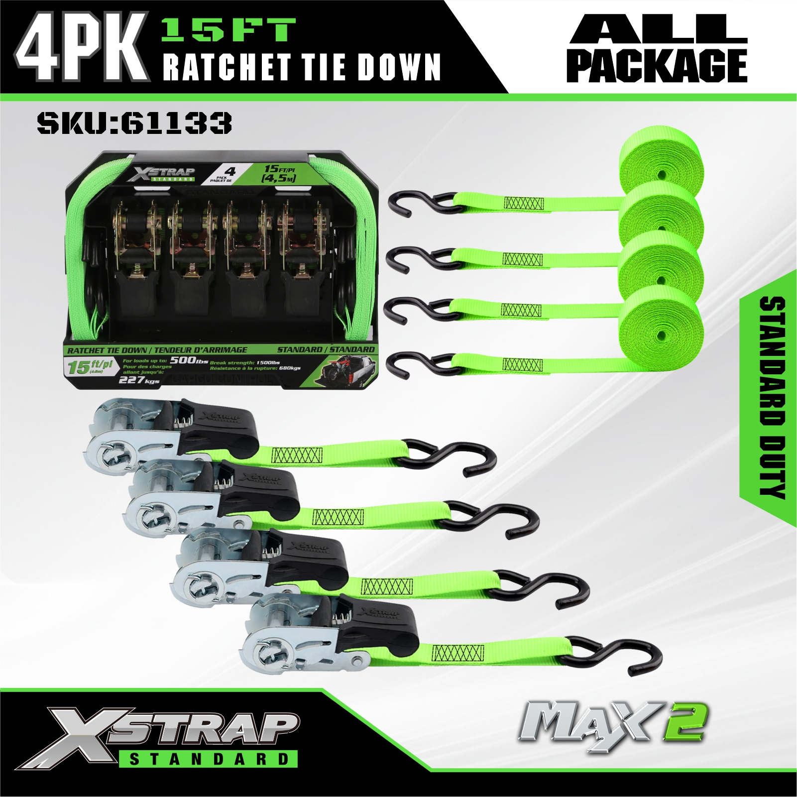 Xstrap 4팩 래칫 타이다운, 1인치 x 15' 폴리에스테르 타이다운 스트랩 당김 래칫 스트랩, 픽업 트럭, SUV, 자동차 탑 랙 오토바이, 경량 낚시 보트, 제트 스키, 스노모빌, 잔디 트랙터용 S 후크가 있는 500lbs 용량 화물 래싱 고정 스트랩.