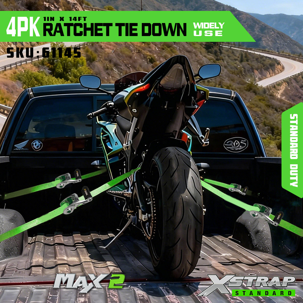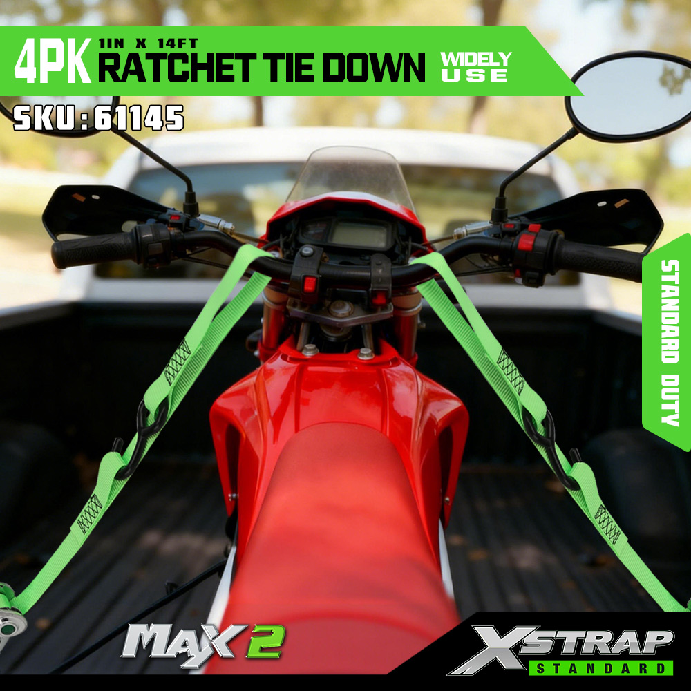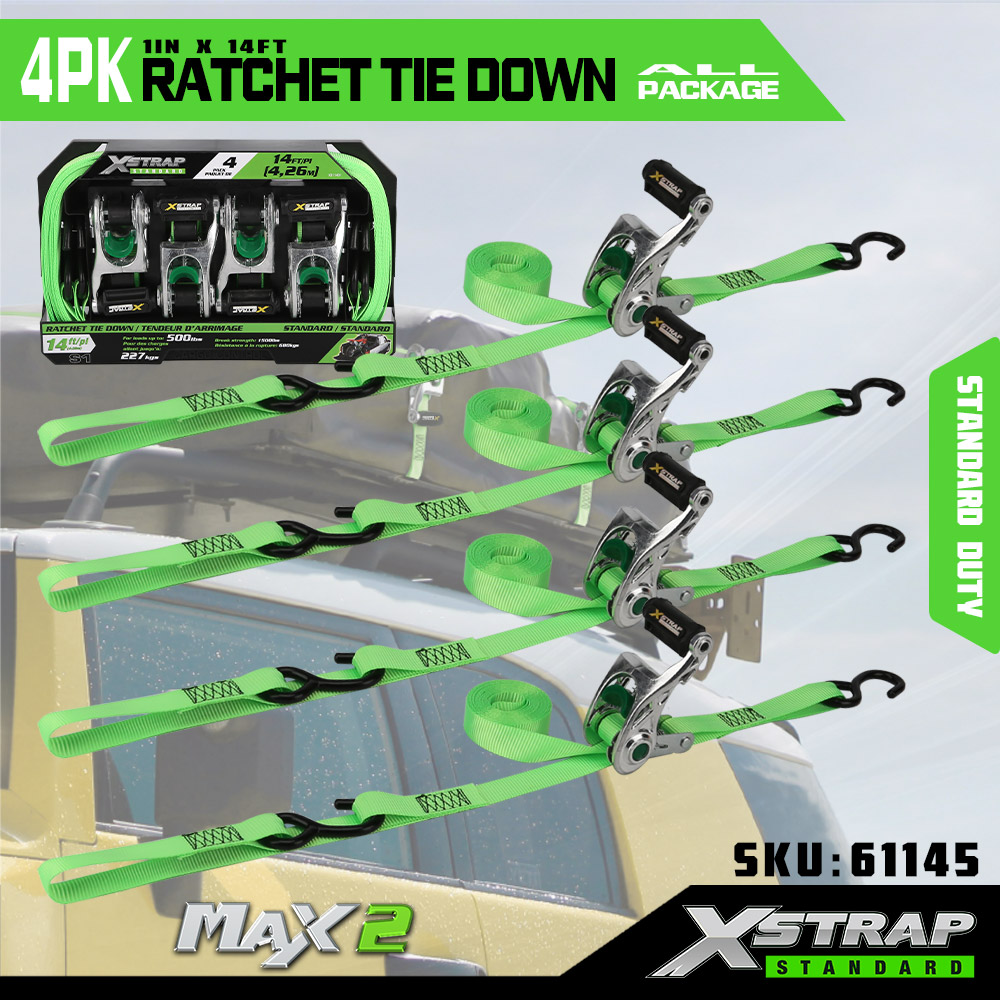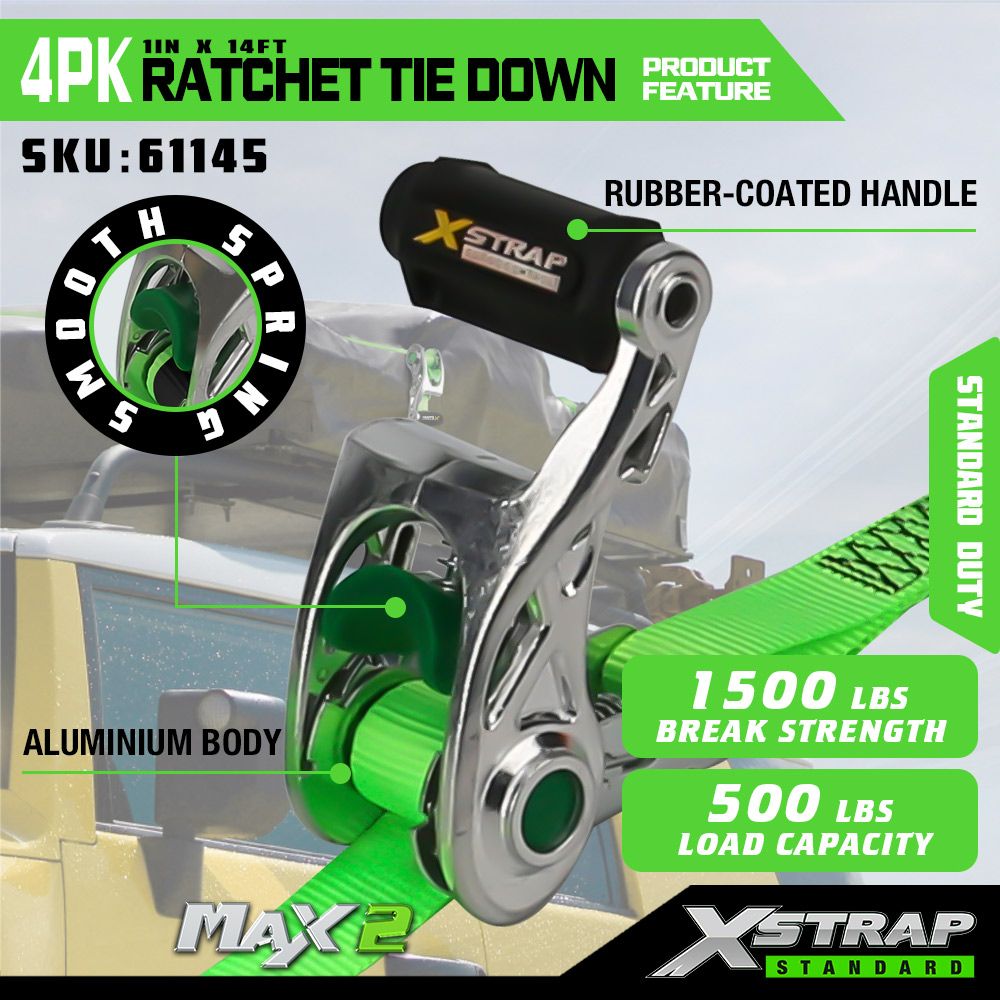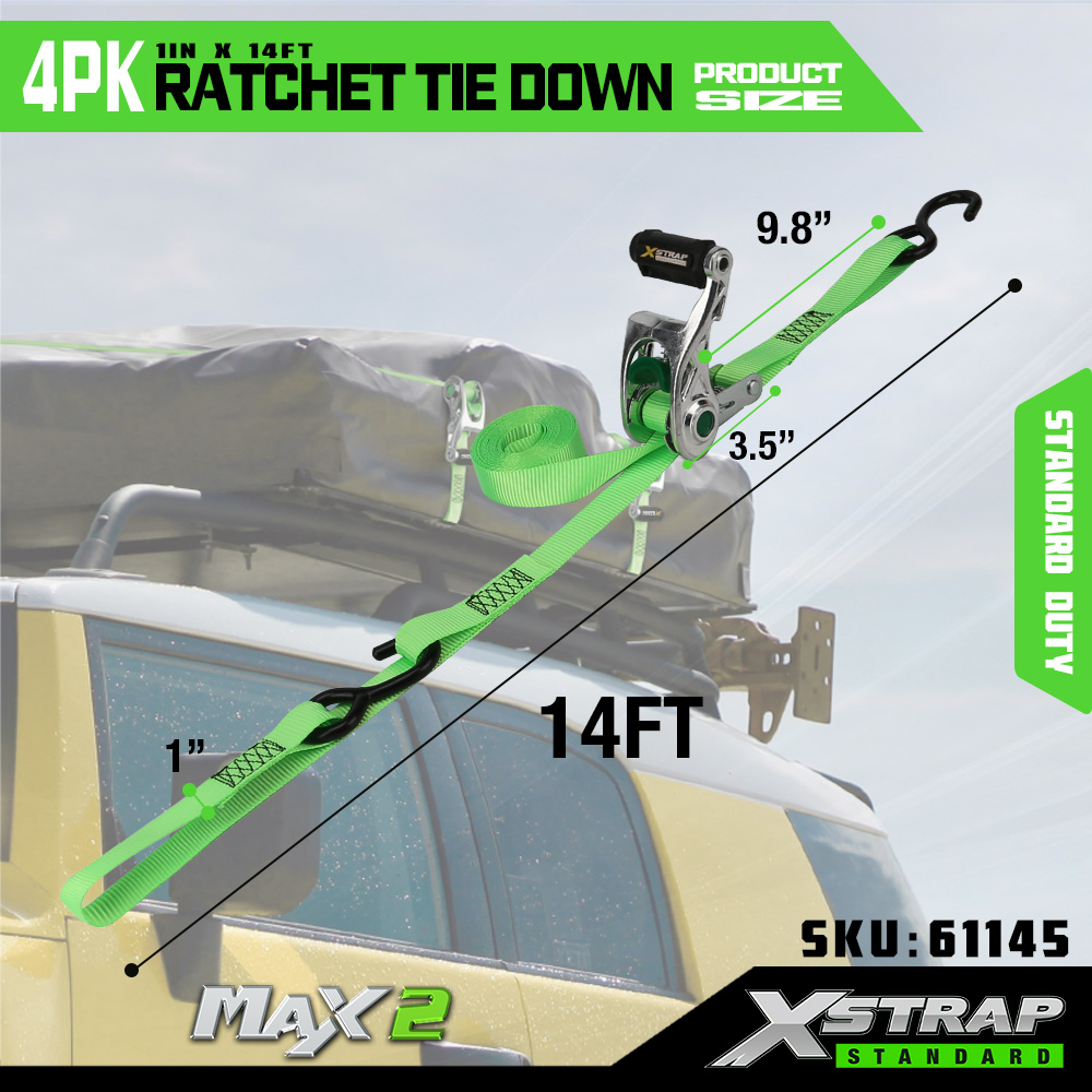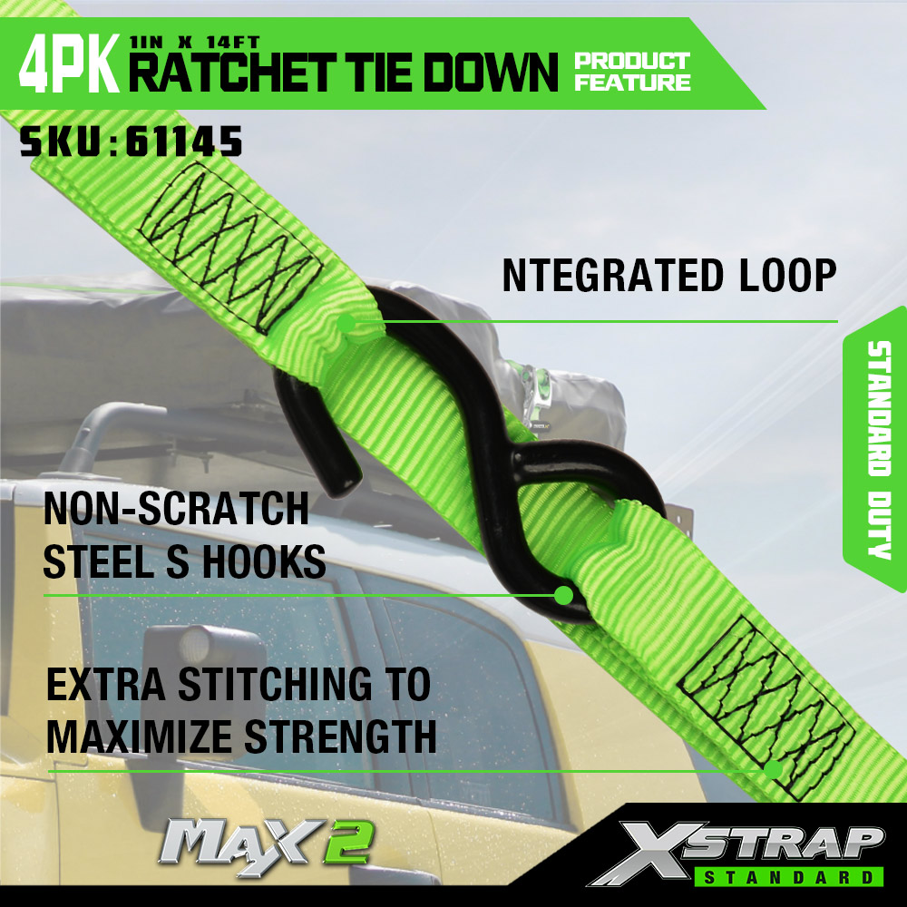 Xstrap 4 팩 래칫 타이다운 소프트 루프, 1" x 14' 폴리에스테르 타이다운 스트랩 당김 래칫 스트랩, 트럭, SUV, 자동차 탑 랙 오토바이용 S 후크가 있는 1000lbs 용량 화물 래싱 고정 스트랩.