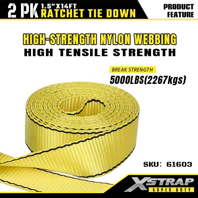 - 고장력 나일론 웨빙(5000LBS 파손 강도): 고강도 노란색 나일론 스트랩(폭 1.5")으로 제작되어 탁월한 인장 강도(5000LBS 파손 하중)와 내마모성을 제공하여 중부하 운송이나 산업용 고정 작업에 이상적입니다.