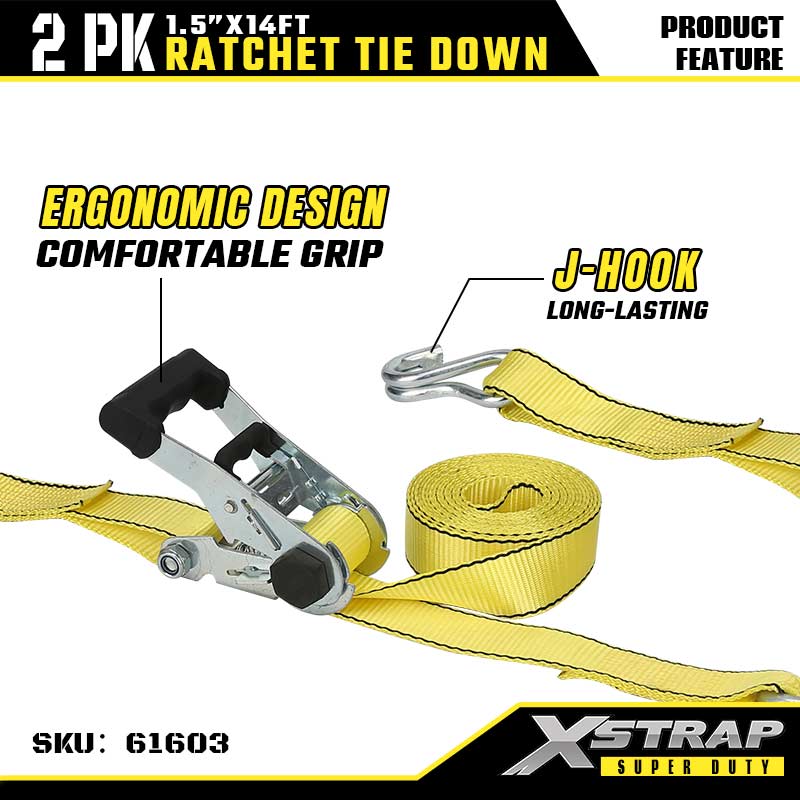 Xstrap 4 팩 T 핸들 래칫 타이다운, 1-1/2" x 14' 폴리에스테르 타이다운 스트랩 당김 래칫 스트랩, 1667lbs 용량 화물 래싱 고정 스트랩, 이중 J 후크가 있어 전문적인 화물 구즈넥 트레일러, 대형 트레일러, 플랫 베드 트레일러 스키 보트, 소형 자동차, 중장비를 고정할 수 있습니다.