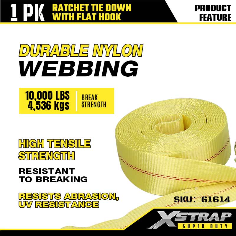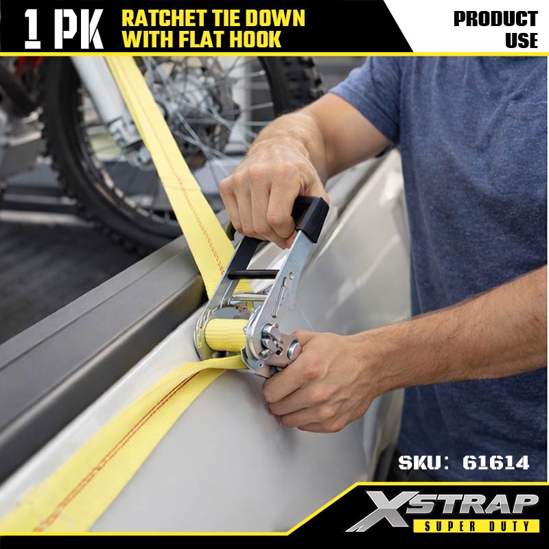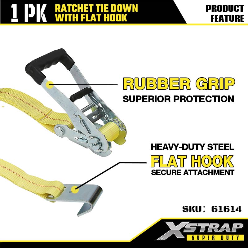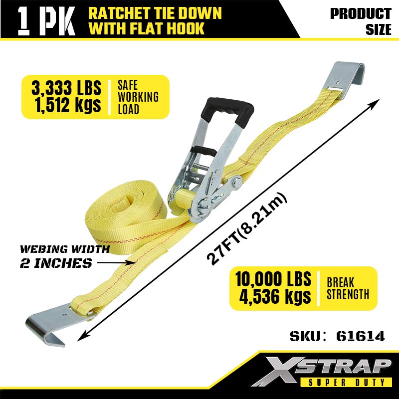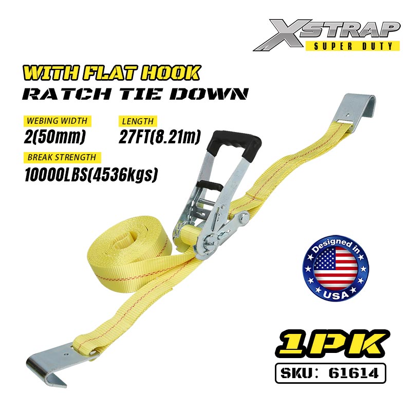 플랫 후크가 있는 Xstrap Ratchet 타이다운, 2인치 x 27' 폴리에스테르 타이다운 스트랩 래칫 스트랩, 대형 트레일러, 플랫 베드 트레일러 스키 보트, 소형 자동차, 중장비용 플랫 후크가 있는 3333lbs 용량 화물 래싱 고정 스트랩.