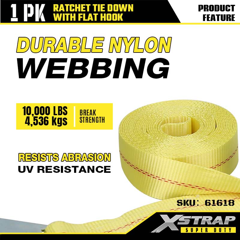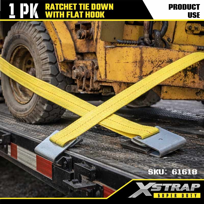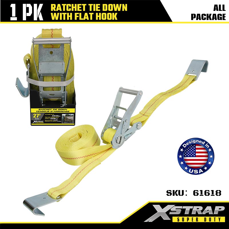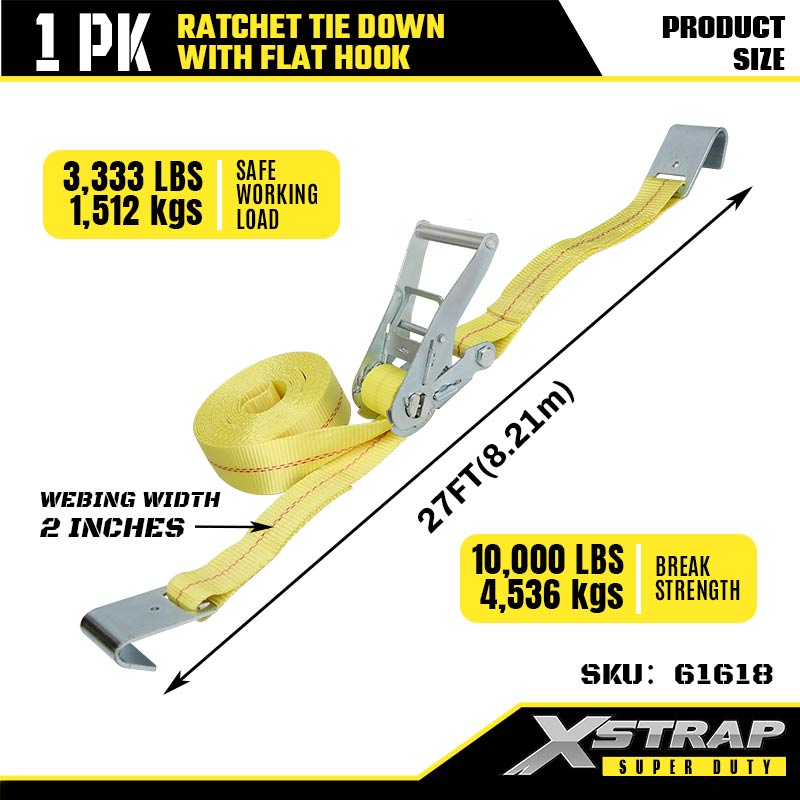 플랫 후크가 있는 Xstrap Ratchet 타이다운, 2인치 x 27' 폴리에스테르 타이다운 스트랩 래칫 스트랩, 대형 트레일러, 플랫 베드 트레일러 스키 보트, 소형 자동차, 중장비용 플랫 후크가 있는 3333lbs 용량 화물 래싱 고정 스트랩.