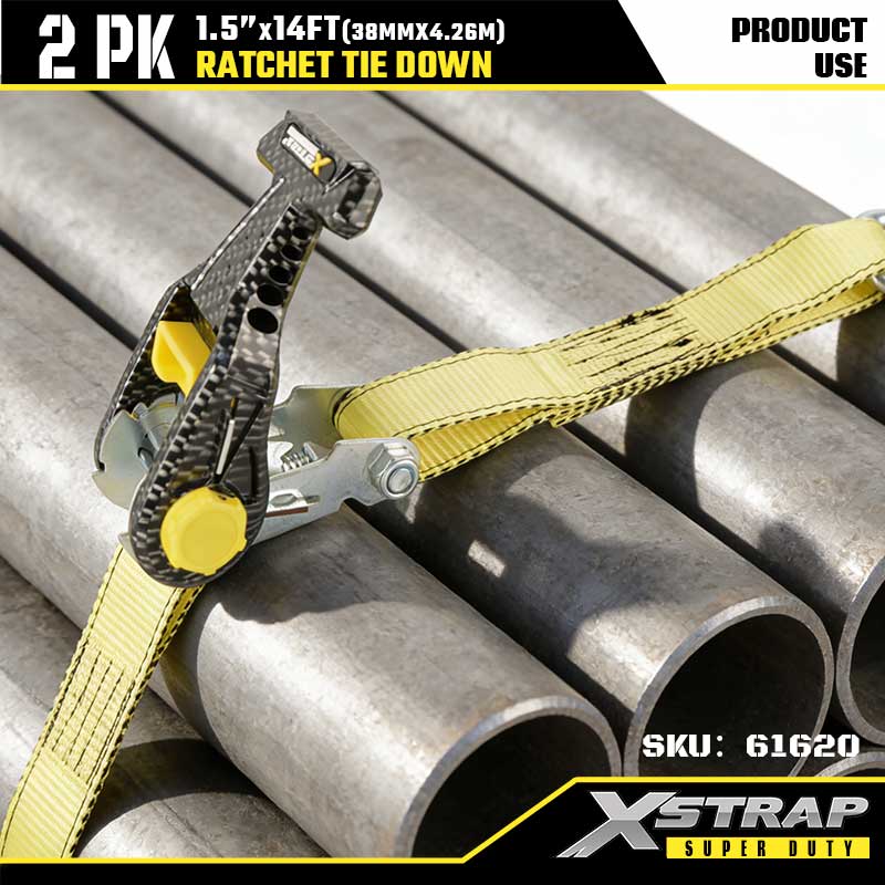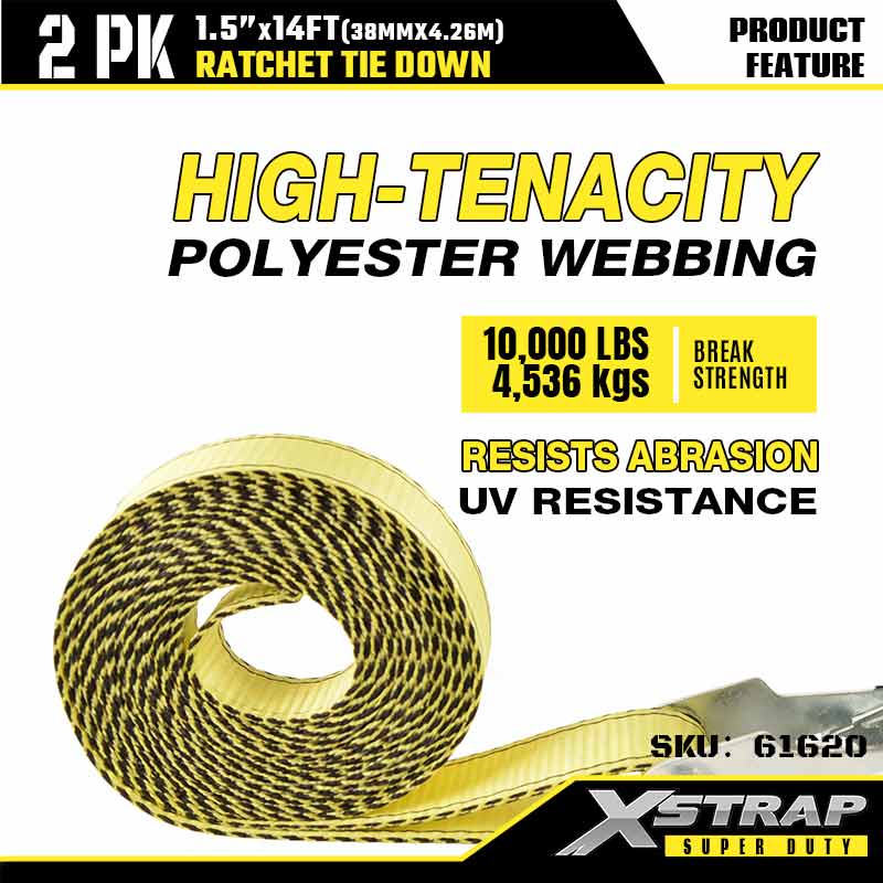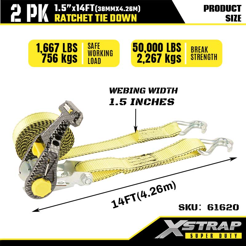 Xstrap 2PK 더블 J 후크가 있는 래칫 타이다운, 1-1/2" x 14' 폴리에스테르 타이다운 스트랩 래칫 스트랩, 대형 트레일러, 플랫 베드 트레일러 스키 보트, 소형 자동차, 중장비용 더블 J 후크가 있는 1667lbs 용량 화물 래싱 고정 스트랩.